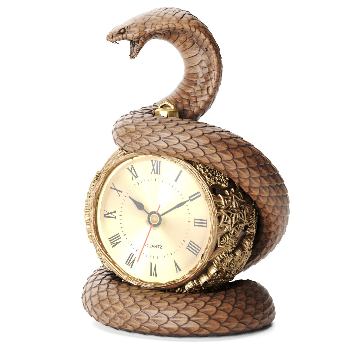Часы настольные "Змея на шаре" из массива бука — это роскошное произведение искусства, воплощающее элегантность и символизм. В центре композиции — изящно свернувшаяся змея, обвивающая изысканный шар, который служит опорой для корпуса часов. Эта композиция символизирует вечное движение времени и мудрость, заключённые в мощных и грациозных формах змеи. Каждый элемент, от текстуры чешуи до богатого орнамента шара, выполнен с высокой степенью мастерства.