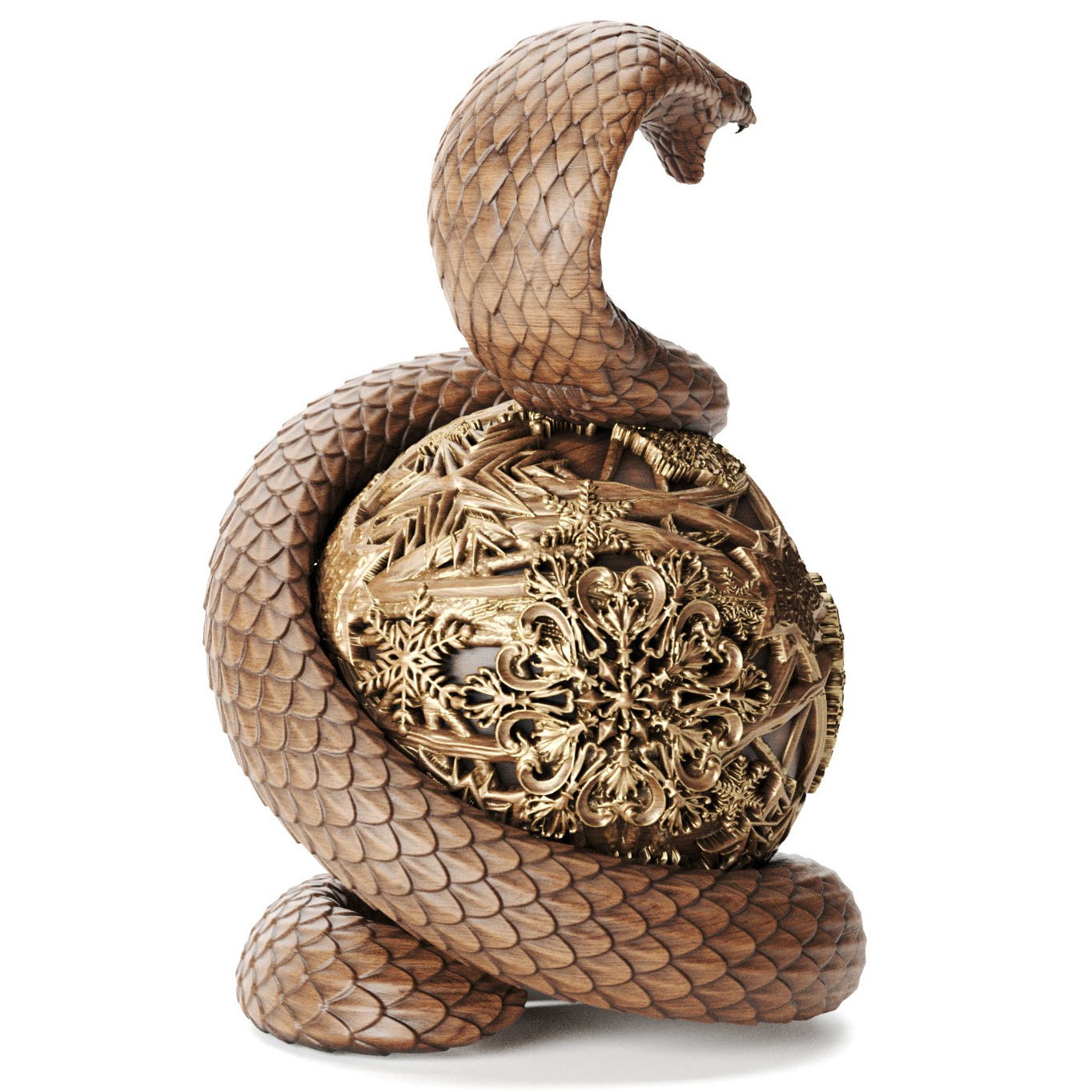 Массив бука, использованный для создания этих часов, придаёт изделию прочность и долговечность, а также подчёркивает его природную красоту. Резьба по дереву детализирована до мелочей — каждый изгиб змеи и элемент орнамента на шаре гармонично дополняют друг друга. Классический циферблат с римскими цифрами и золотым обрамлением добавляет изделию аристократизма и делает его ярким акцентом в интерьере.