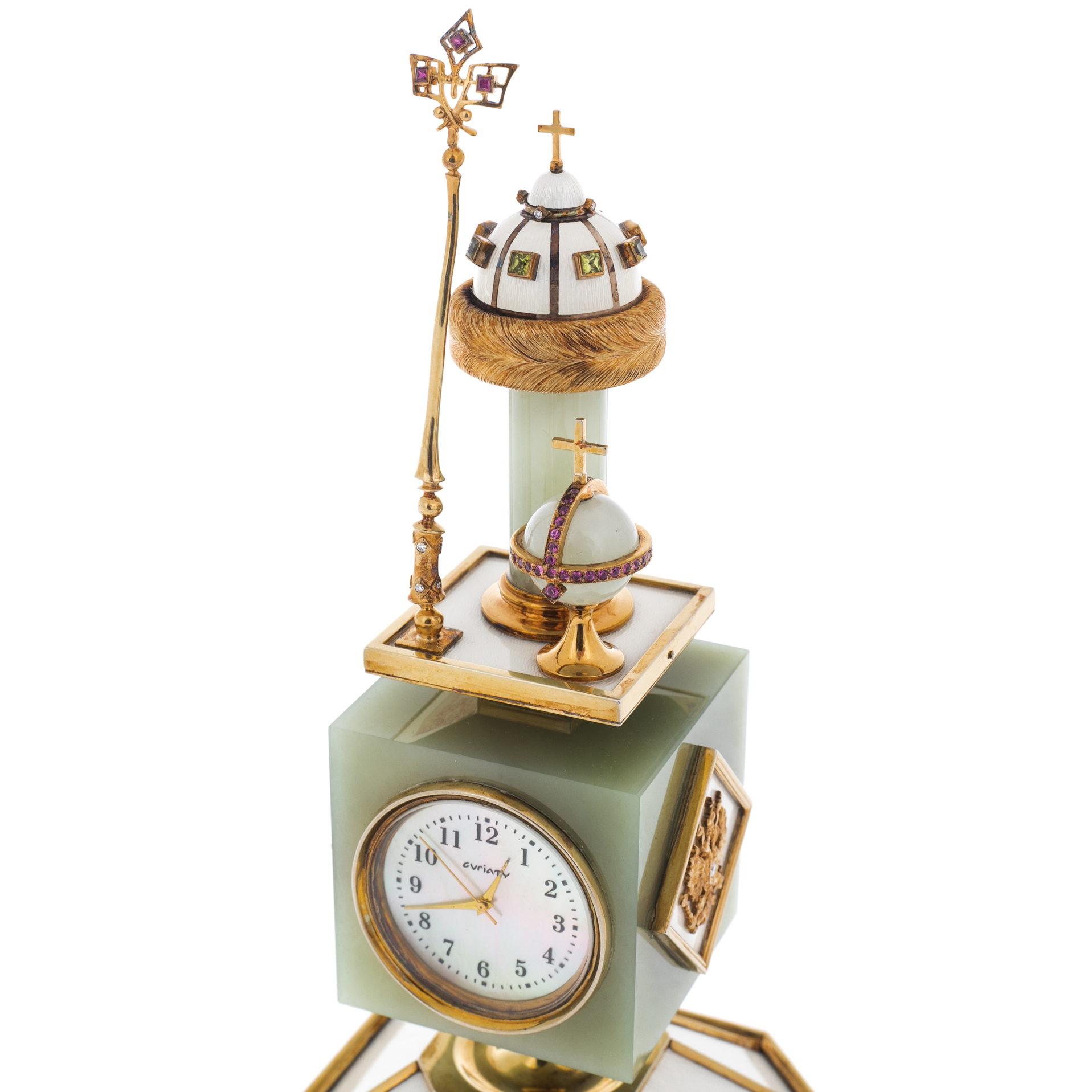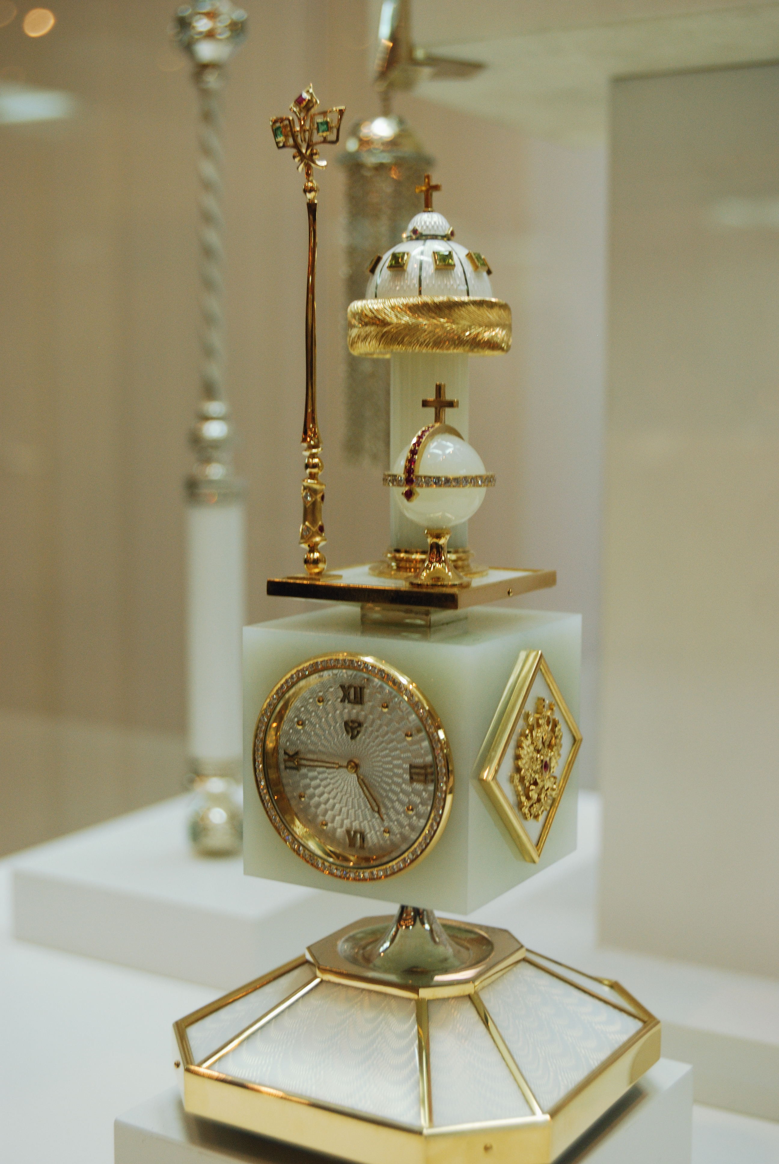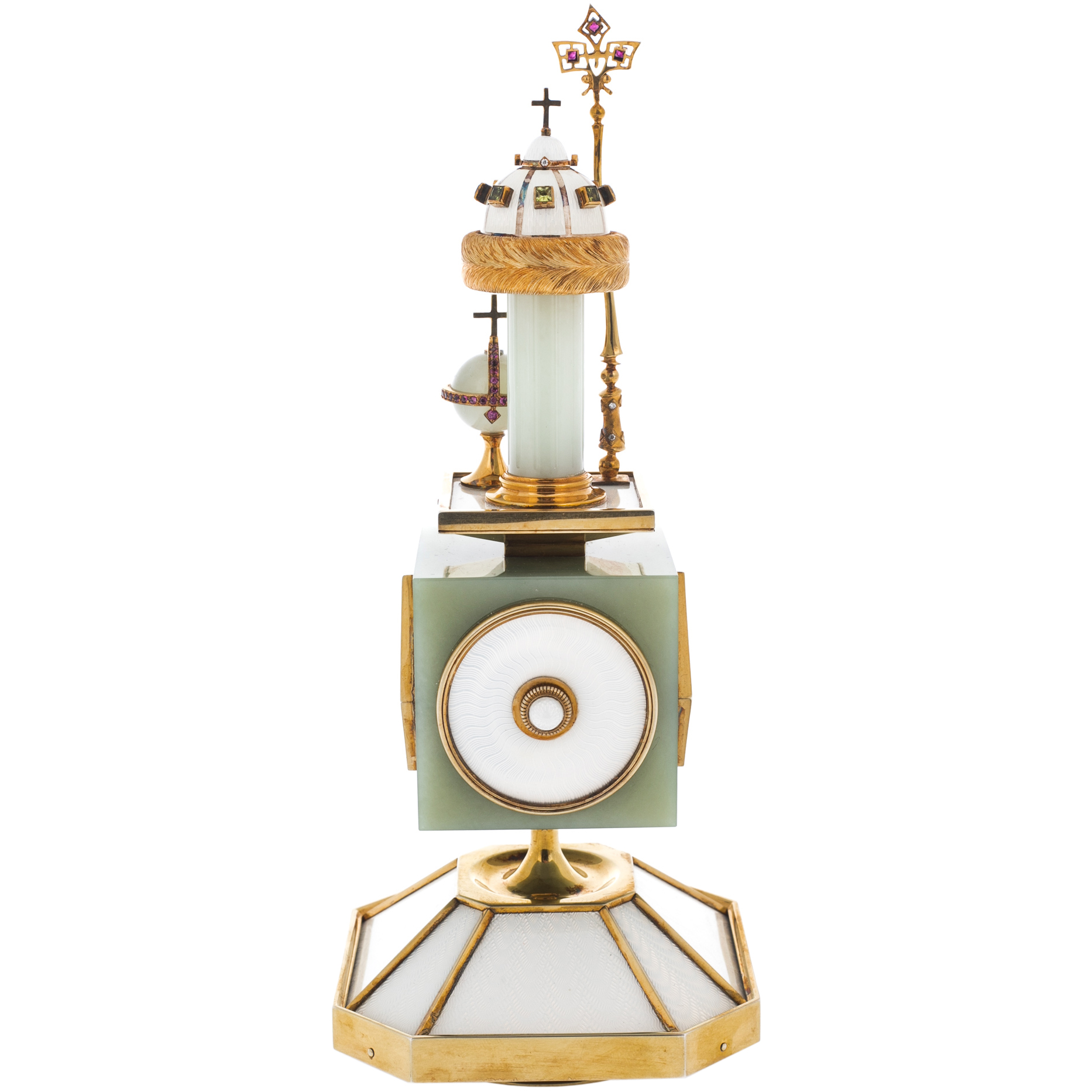 Материалы: золото, серебро, бриллианты, рубины, хризолиты, нефрит белый, эмаль гильоше.