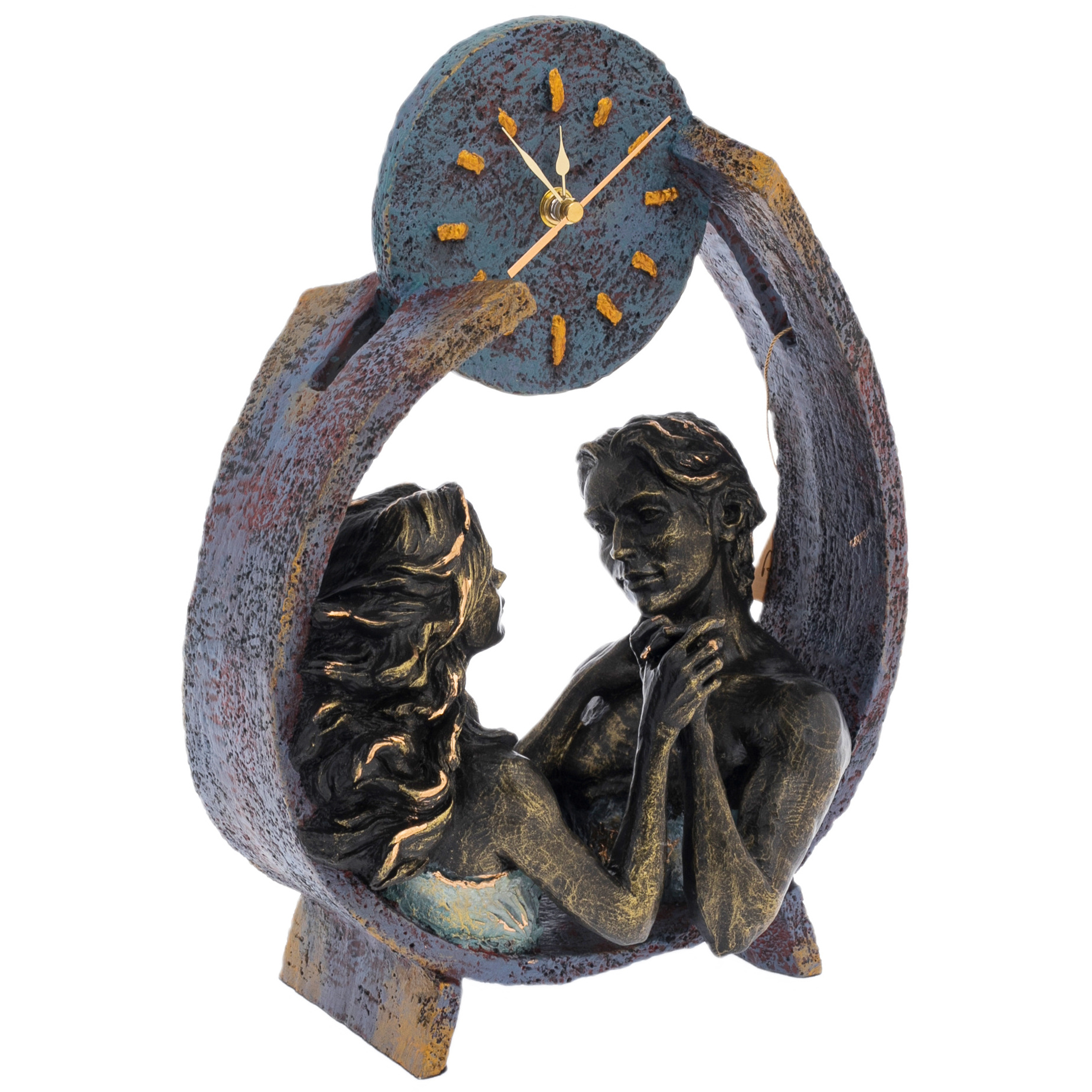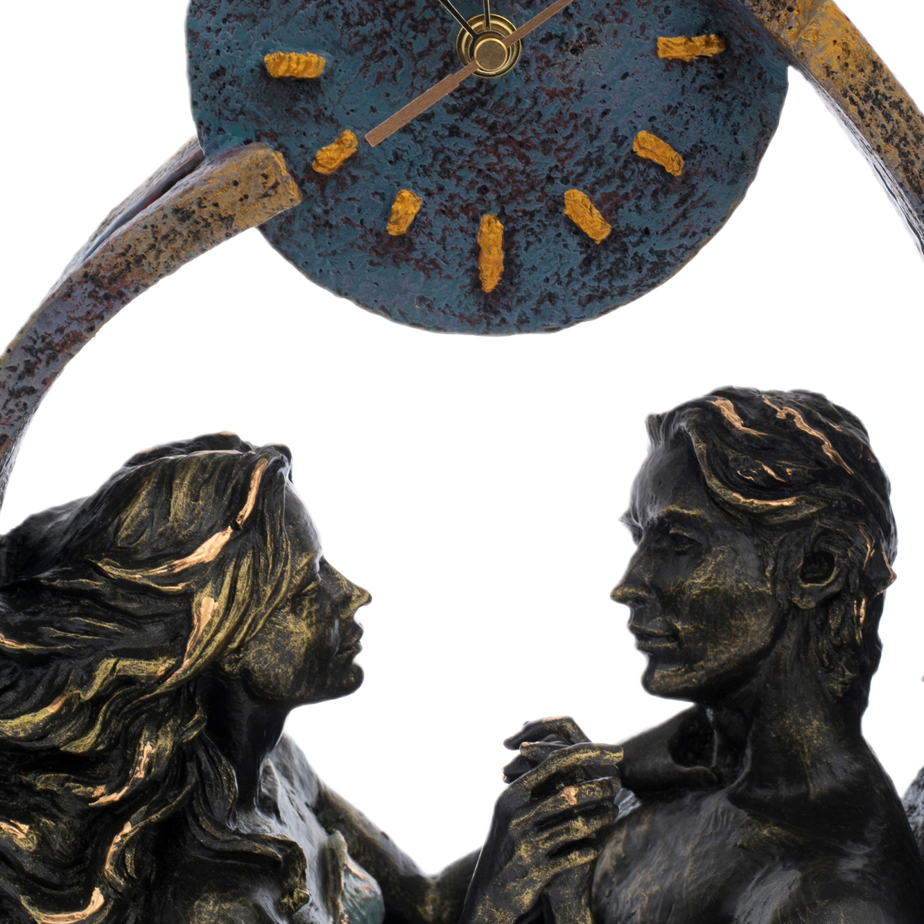 Арочная конструкция, служащая не просто основой, но смысловым завершением композиции, обрамляет эту встречу, словно купол храма или свод ночного неба. На ее вершине – циферблат, высекающий мгновения, отливающий холодным синим металлом, а золотистые отметки часов напоминают о том, что каждое мгновение ценно. Плавный ход стрелок дополняет эту идею: время в любви не подвластно суете, оно течет иначе, подчиняясь лишь ритму двух сердец.