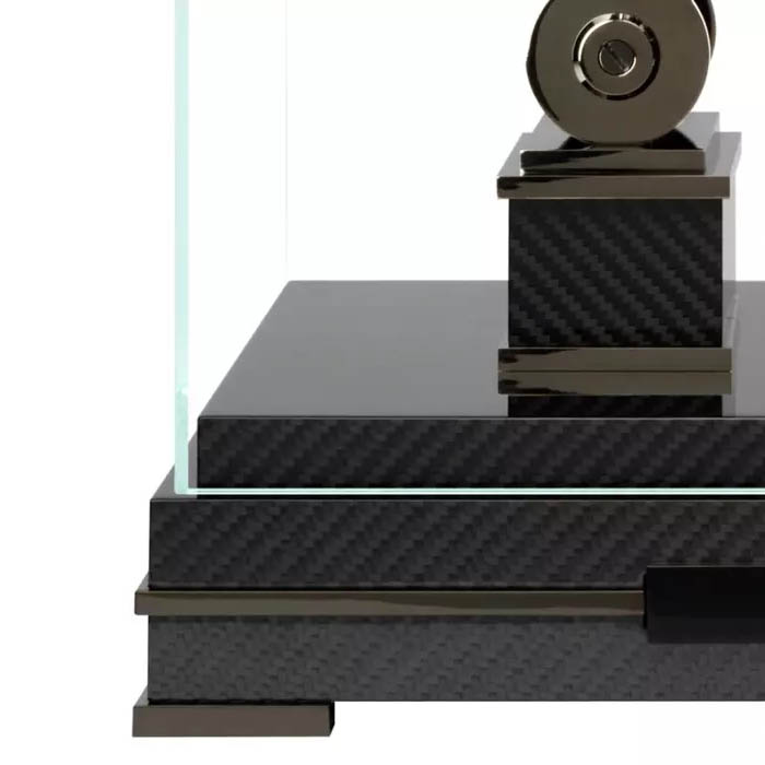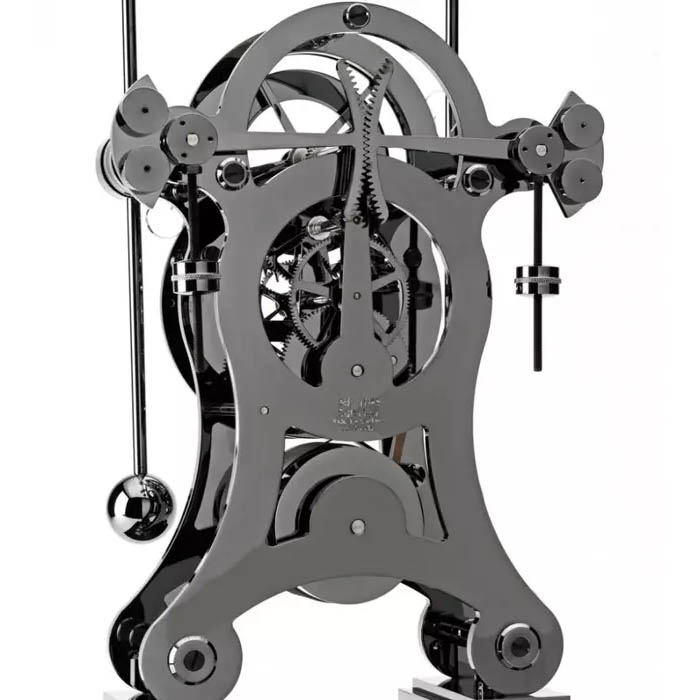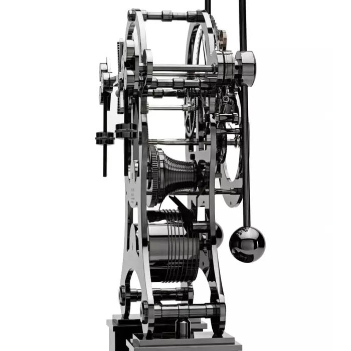 Черное покрытие корпуса, словно панцирь загадочного механического хищника, поглощает свет, оставляя лишь отражения, от которых невозможно отвести взгляд. Вращение балансов, движение шарнирных рычагов, идеальная симметрия маховиков — эта динамика не подвластна хаосу, она подчинена математической точности. Восьмидневный запас хода, механизм Fusee, обеспечивающий идеальную точность, филигранные посеребренные стрелки на черном циферблате с римскими и арабскими метками — каждая деталь здесь говорит о мастерстве, доведенном до совершенства.