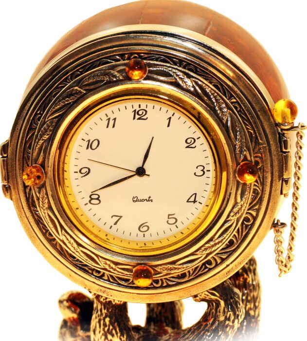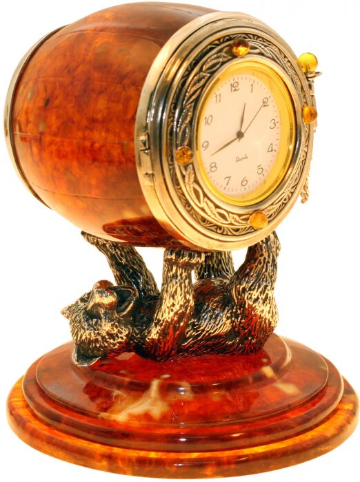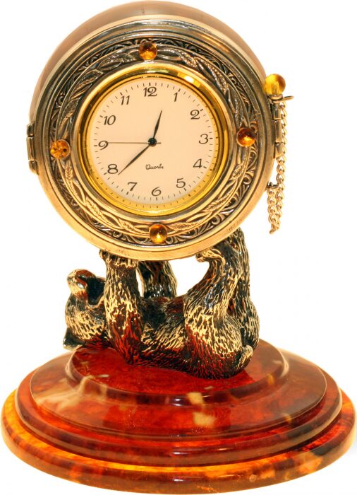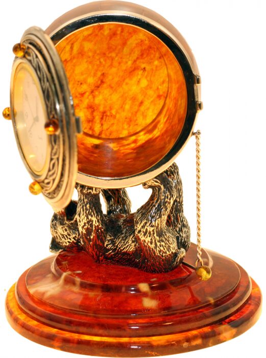 Сувенир-часы из янтаря и серебра "Цирковой медведь"