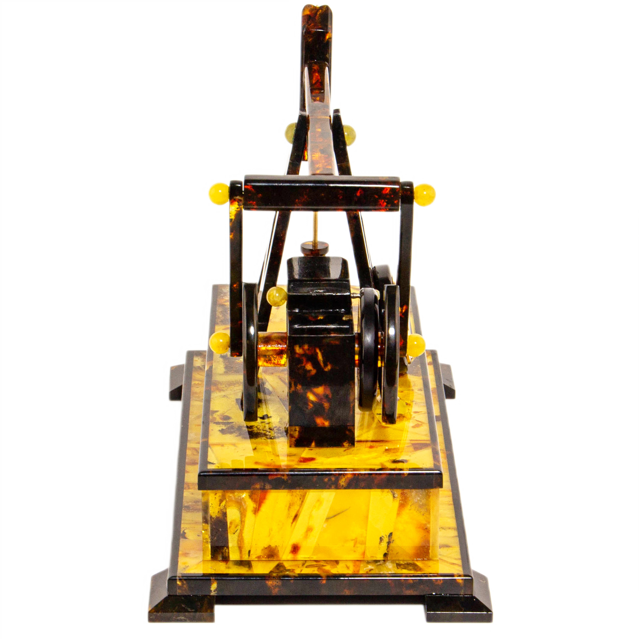 Изделие не оставляет равнодушным и своим основанием, выполненным из тёмного и светлого янтаря, где контрасты подчеркивают природную игру света. Это словно дань уважения природе, которая, несмотря на технологии и прогресс, остаётся источником всех богатств.