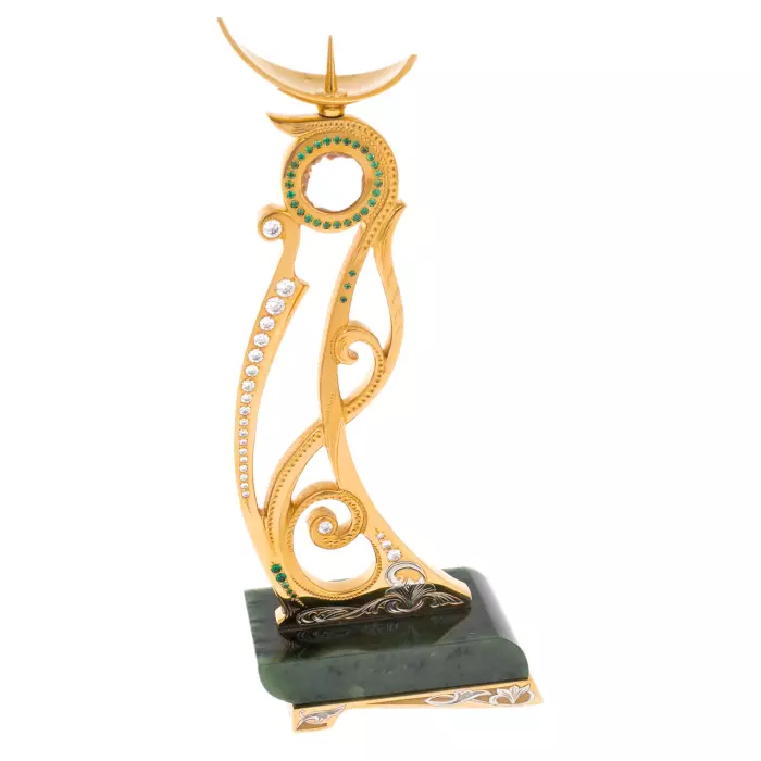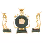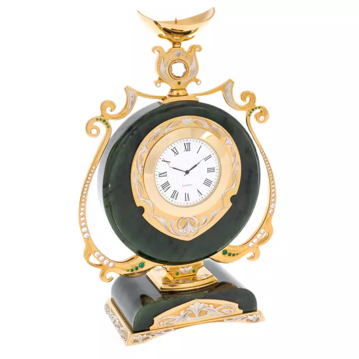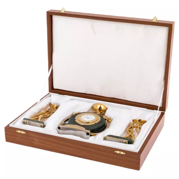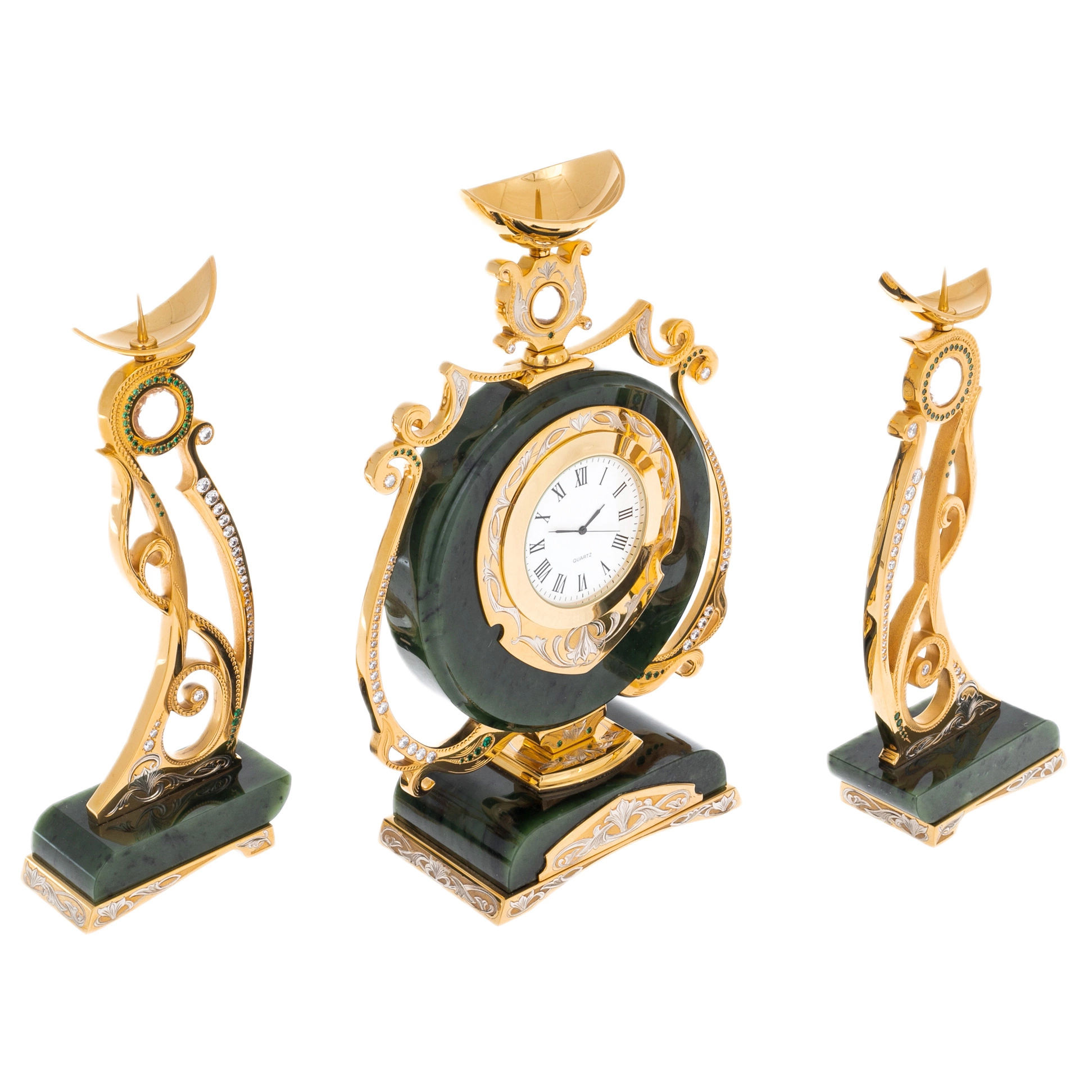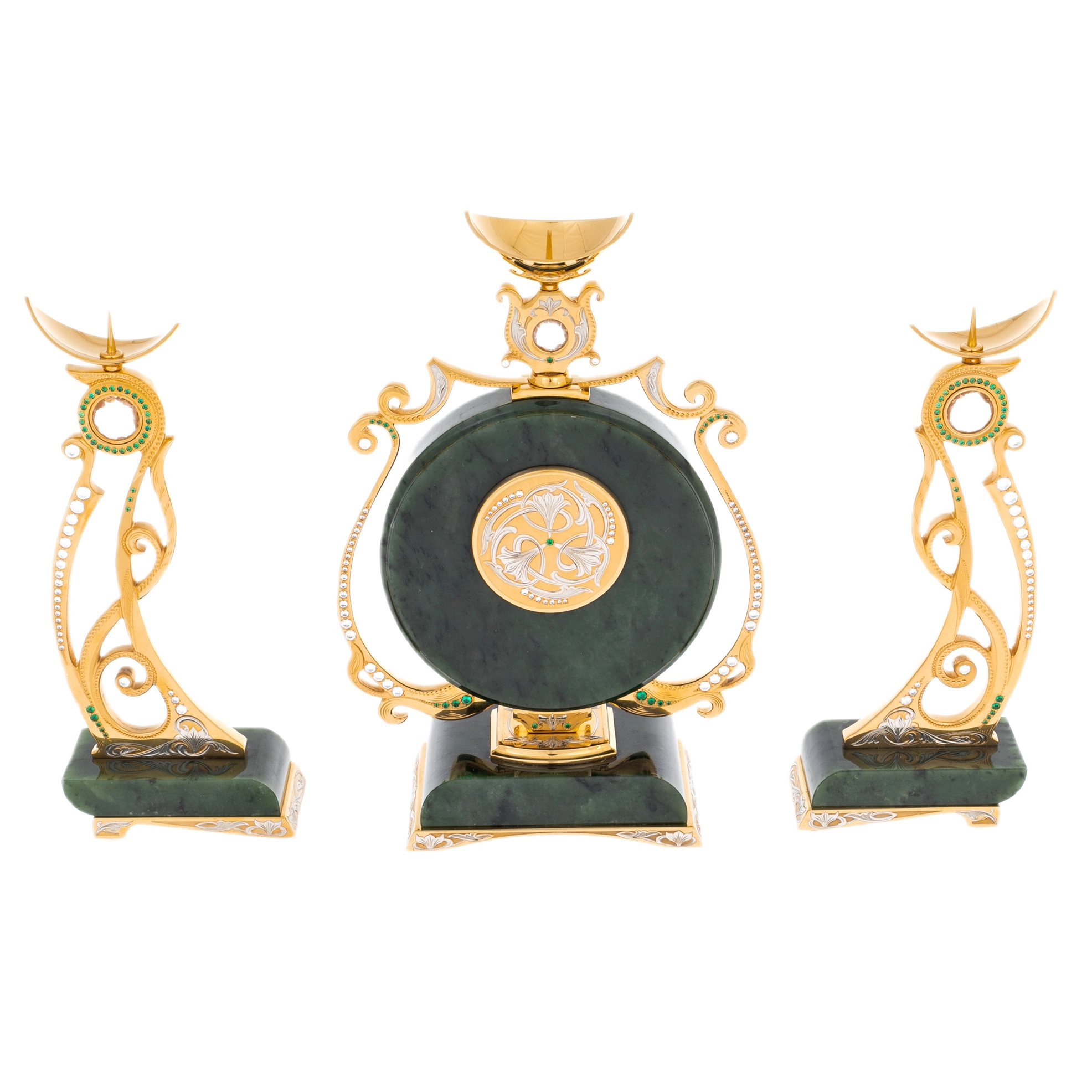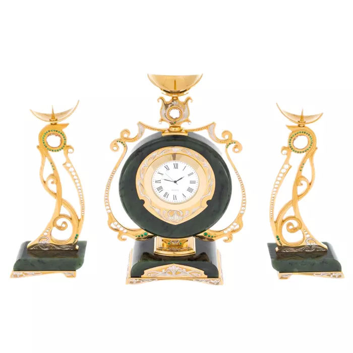 Нефритовые основания подчёркивают благородство металла с золочёной отделкой. Орнаментальные элементы выполнены с характерной для златоустовской школы тщательностью: растительные мотивы, плавные завитки, декоративные вставки светлых и изумрудных оттенков, аккуратно инкрустированные по периметру. Циферблат с классическими римскими цифрами обрамлён тонкой декоративной рамкой, поддерживающей общий ритм композиции. Верхние чаши канделябров и часов образуют лёгкий акцент, придавая ансамблю вертикальную динамику и ощущение парадности.