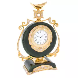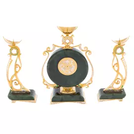 Каминный набор из нефрита «Роскошь» — выразительный ансамбль из часов и двух канделябров, созданный мастерами Златоуста для интерьеров, в которых ценят декоративную изысканность и художественную выразительность. Центральная композиция построена вокруг круглого корпуса часов, заключённого в глубокий тёмно-зелёный нефрит с естественным природным рисунком. По сторонам — два изящных подсвечника с плавными, почти скульптурными линиями, образующими гармоничную симметрию.