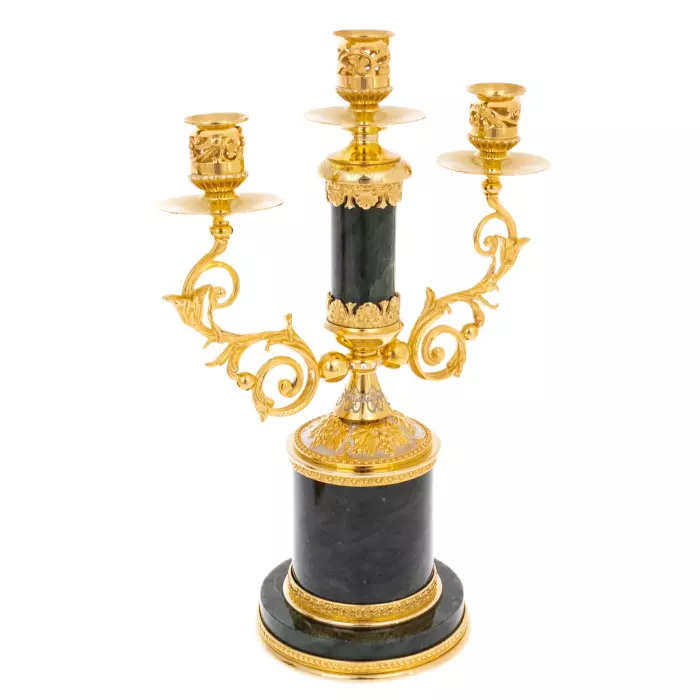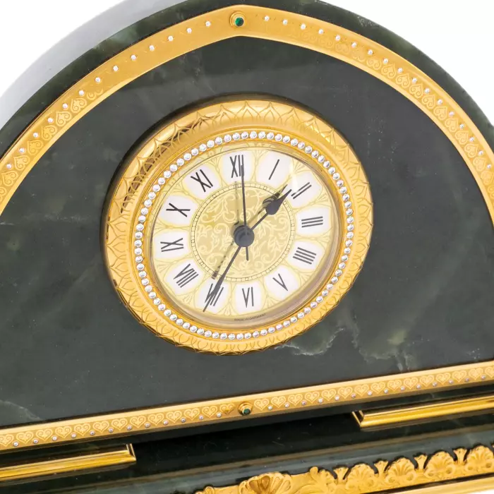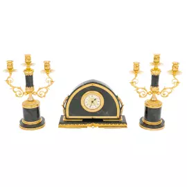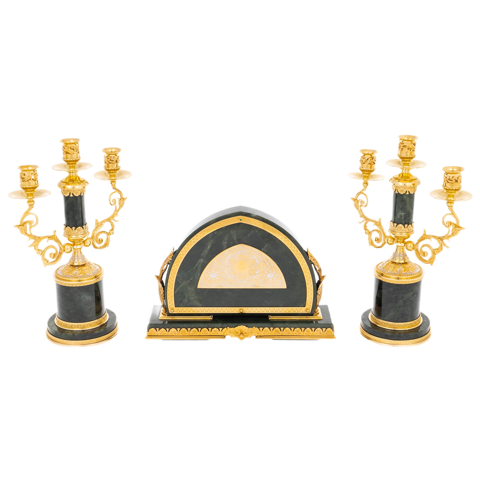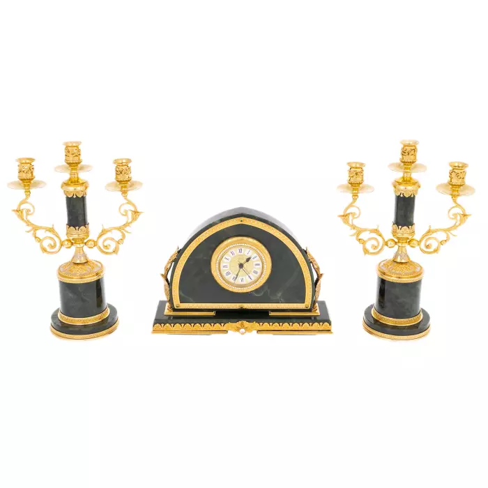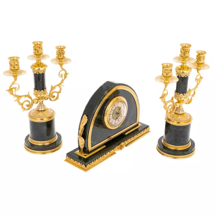 Нефритовые элементы тщательно отобраны по тону и рисунку, благодаря чему поверхность сохраняет природную глубину и мягкий блеск. Металлические детали украшены орнаментальной гравировкой, позолотой и декоративными поясами, подчёркивающими архитектурность форм. Часы обрамлены изящной каймой, циферблат с классической разметкой органично вписан в строгую полукруглую композицию. Канделябры отличаются выразительными завитками рожков и устойчивым основанием, обеспечивающим не только эстетическую завершённость, но и функциональность.