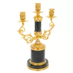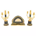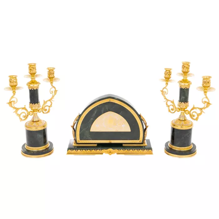 Каминный набор из нефрита «Величие» — парадная интерьерная композиция, объединяющая часы и два канделябра, выполненные в лучших традициях златоустовского художественного металла. В центре — настольные часы в массивном нефритовом корпусе благородного глубокого оттенка; по сторонам — симметричная пара трёхрожковых канделябров на цилиндрических основаниях. Сочетание полированного камня и золочёного металла формирует образ статусного предмета для кабинета, гостиной или зала переговоров.