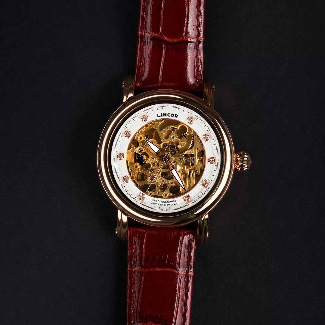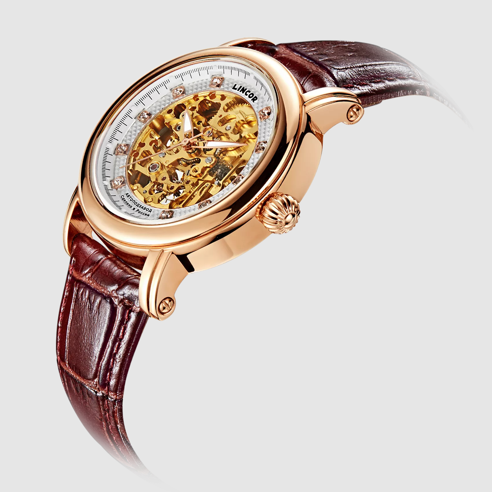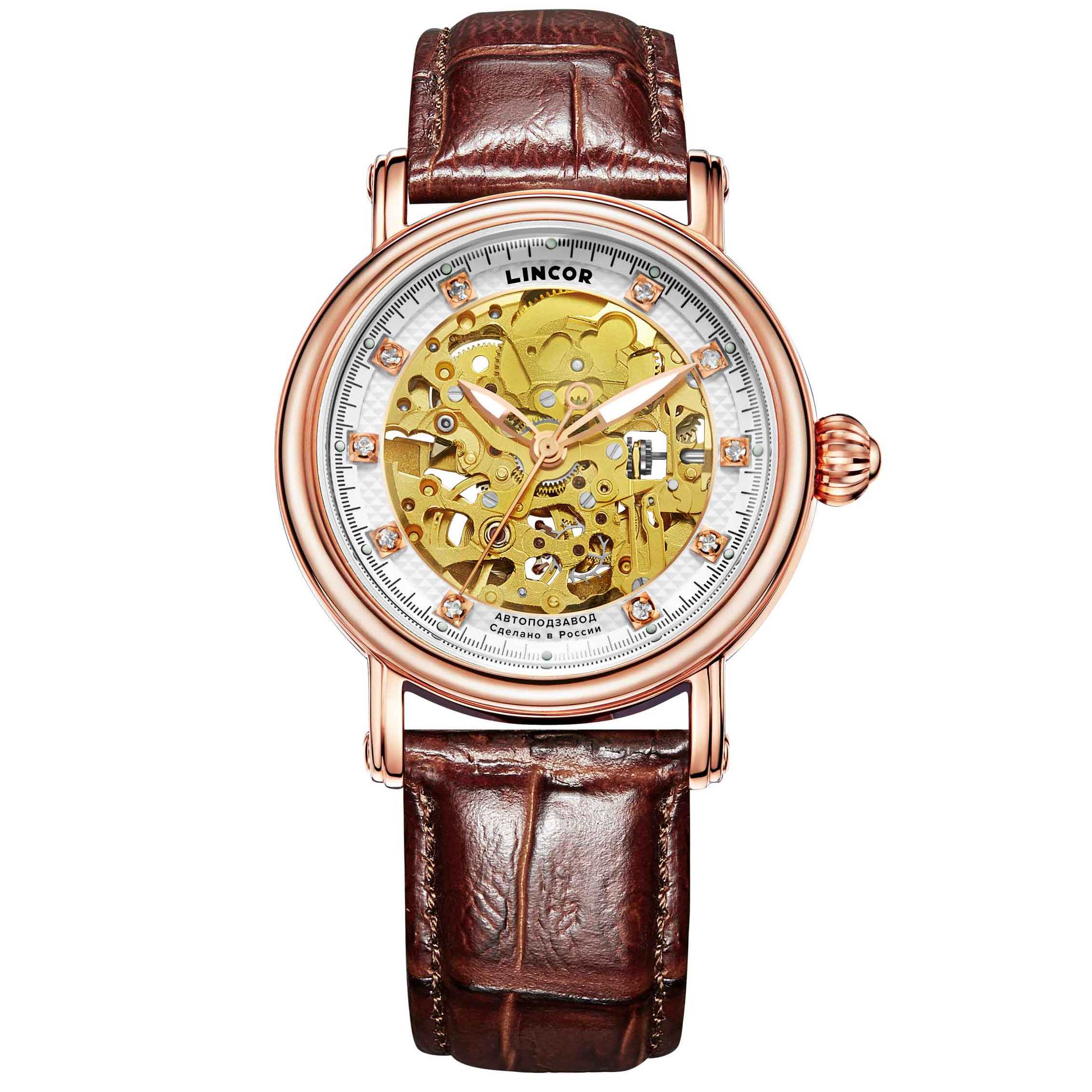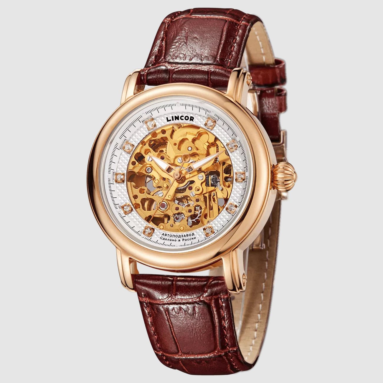 Наручные механические часы с автоподзаводом Lincor UNI бело-золотистые с коричневым ремешком
