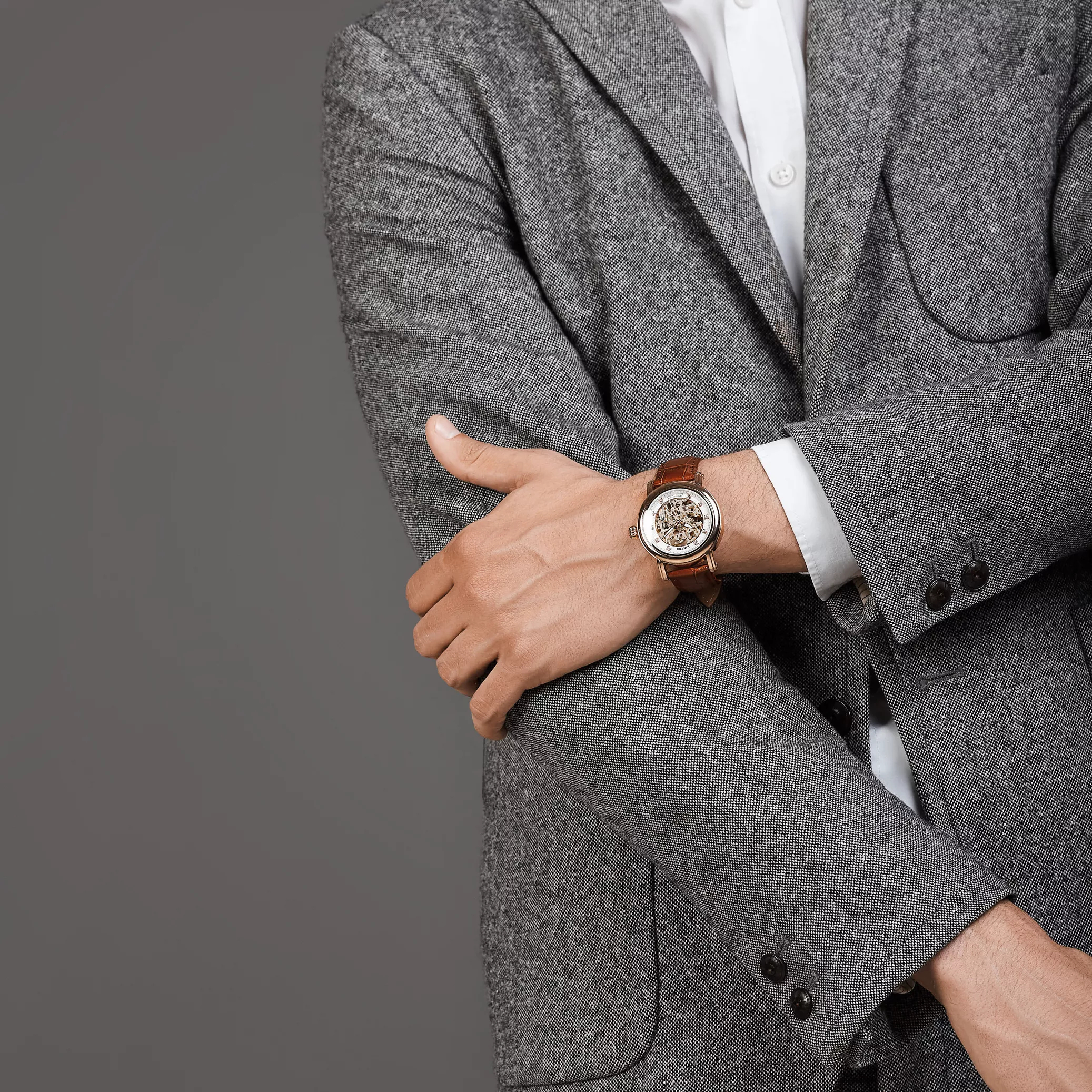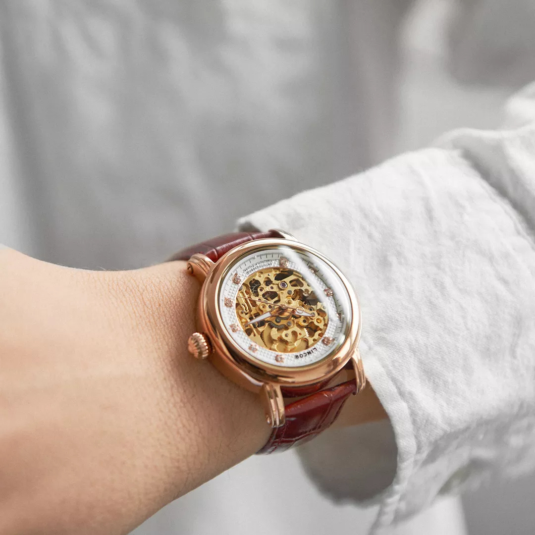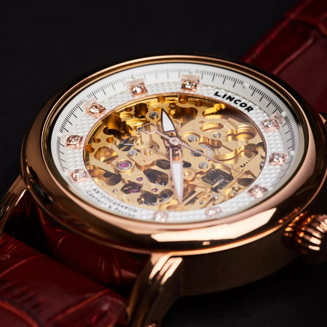 Наручные механические часы с автоподзаводом Lincor UNI бело-золотистые с коричневым ремешком