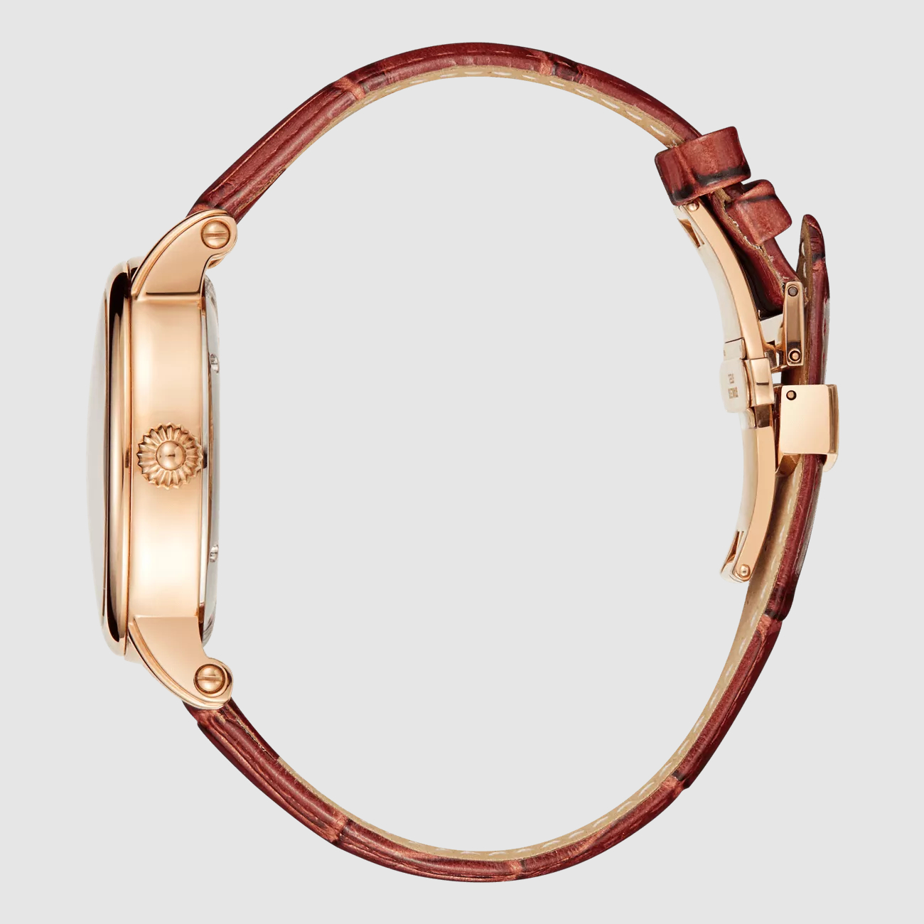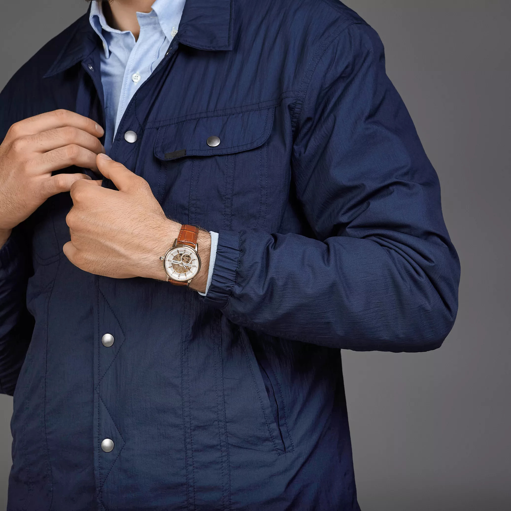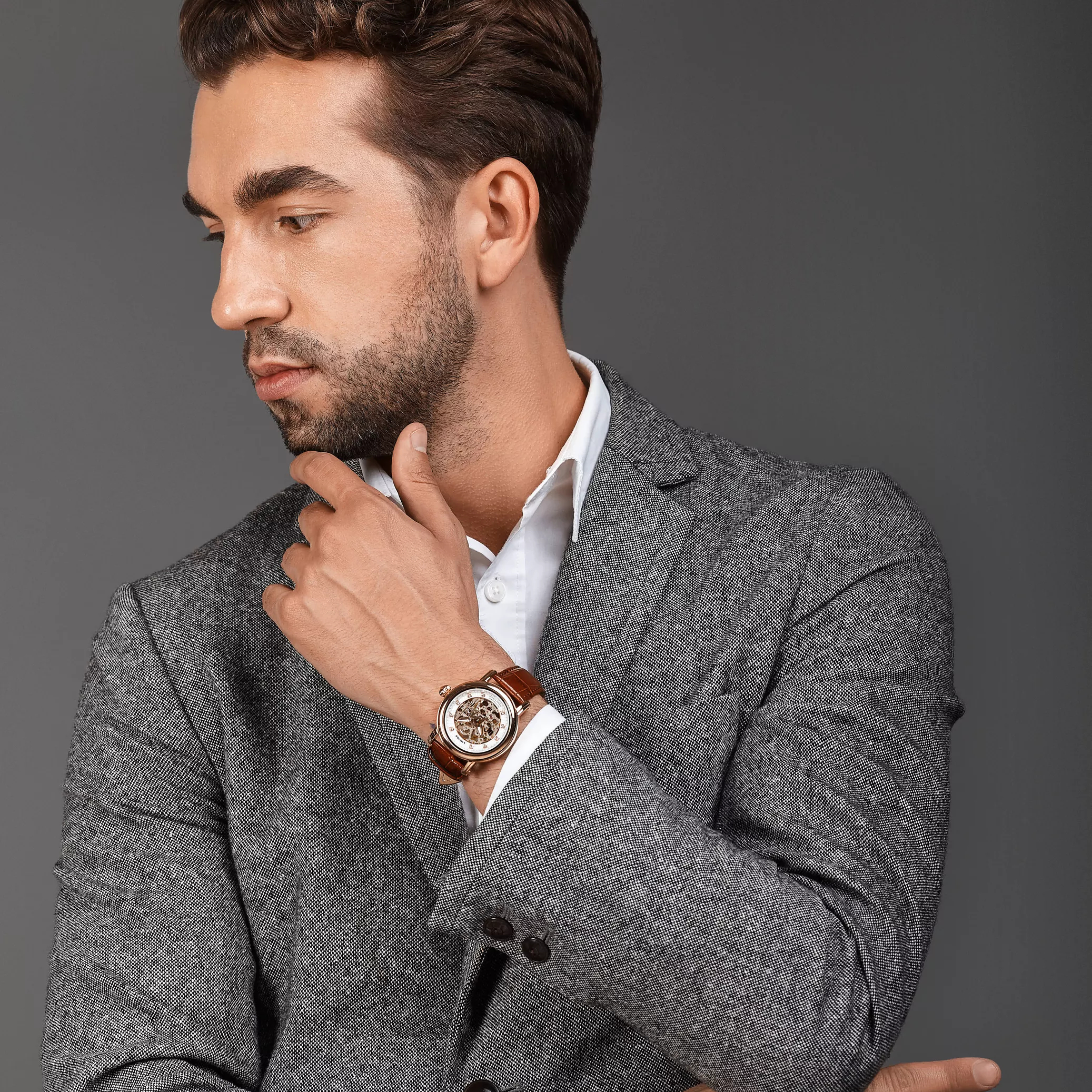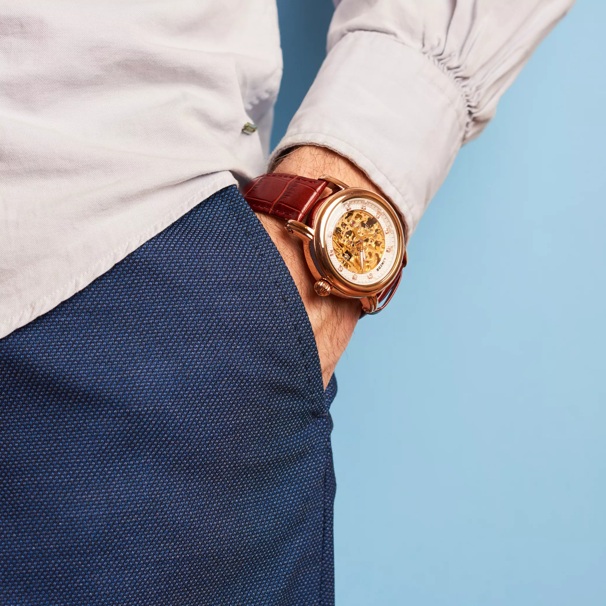 Наручные механические часы с автоподзаводом Lincor UNI бело-золотистые с коричневым ремешком