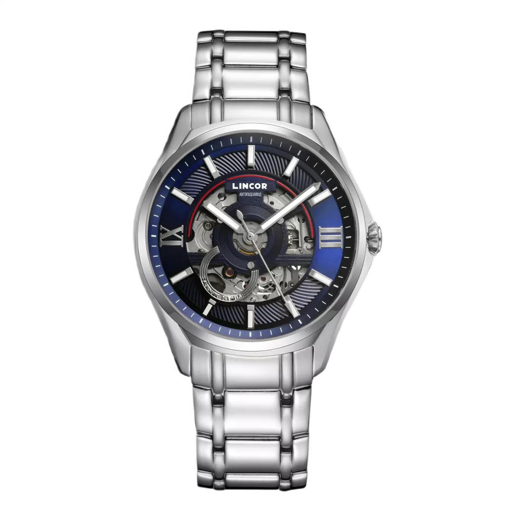 Наручные механические часы с автоподзаводом Lincor UNI синие с серебристым ремешком