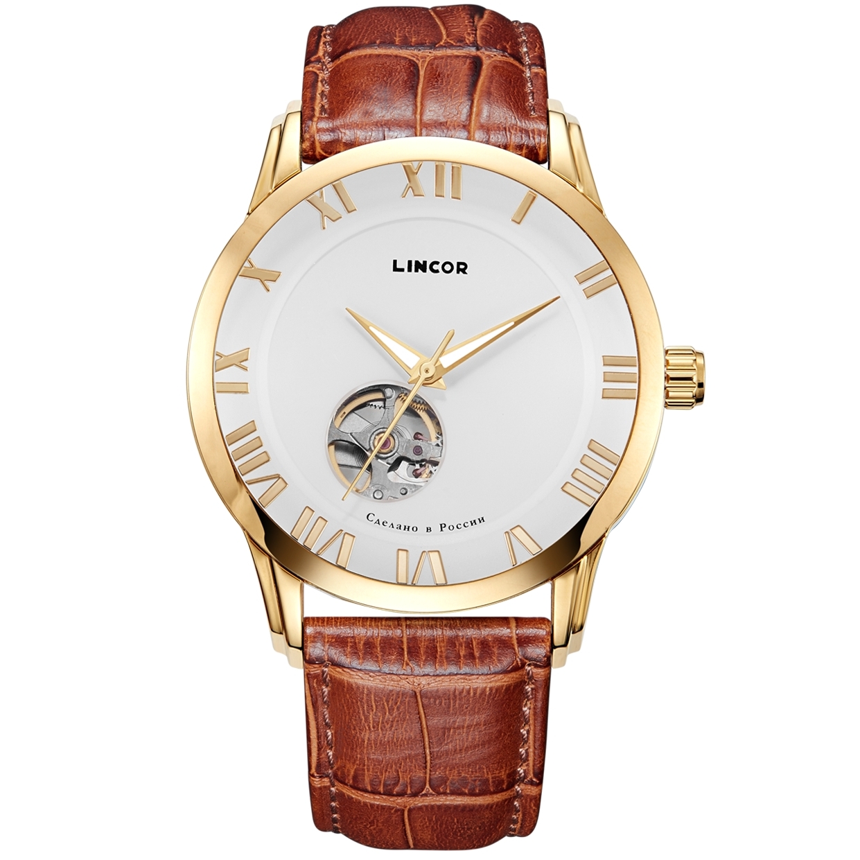 Наручные механические часы с автоподзаводом Lincor золотистые с коричневым ремешком
