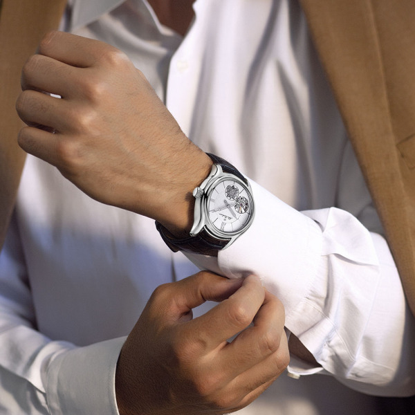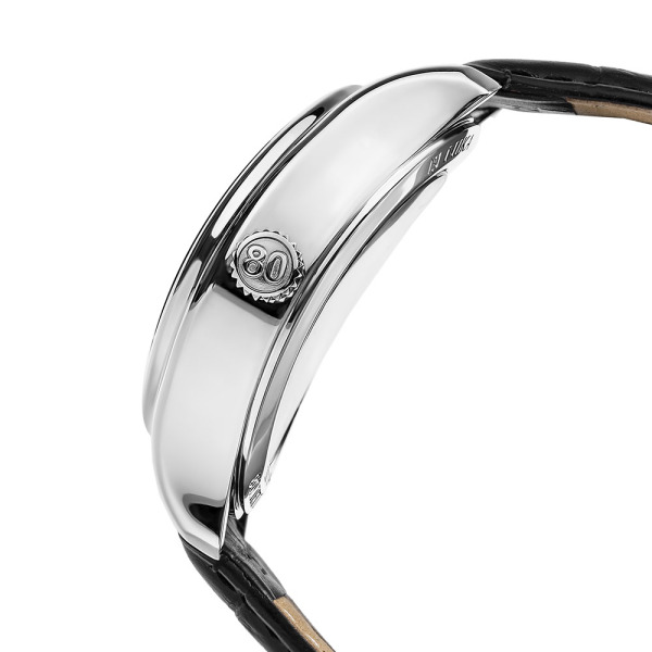 Эксклюзивность подчеркивают гравировки: число «80» на заводной головке и ручная гравировка «80 лет Победы» на прозрачной задней крышке, сквозь которую виден искусный механизм. Черный ремешок из кожи аллигатора завершает образ, добавляя благородства и комфорта, а сапфировое стекло гарантирует абсолютную защиту часов, оставаясь эталоном прочности и престижа