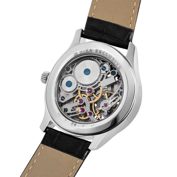Завершает концепцию открытая задняя крышка, предлагающая дополнительный ракурс для созерцания часового мастерства. Образ дополняет широкий черный ремешок из кожи крокодила, придающий часам сдержанную роскошь, а сапфировое стекло гарантирует абсолютную защиту циферблата, оставаясь эталоном прочности и престижа.