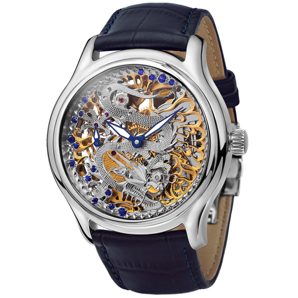 16 сапфиров, расположенных изящным полукругом вокруг дракона, подчеркивают благородство композиции, играя на свету своими гранями. Скелетонированный механизм позволяет наблюдать, как оживает дракон на часах с каждым движением стрелок, а небольшая секундная стрелка, расположенная сбоку, напоминает о точности этого хронометра с запасом хода 46 часов.
