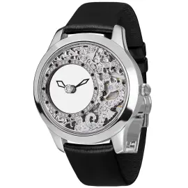 Nika Серебряные наручные часы "NIKA EXCLUSIVE 1814.32.9.00C" Серебряные наручные часы "NIKA EXCLUSIVE 1814.32.9.00C" В этих наручных женских часах воплощена магия часового искусства, где технологические инновации встречаются с ювелирным мастерством. Корпус из серебра 925 пробы с благородным блеском подчеркивает изящность и статус владелицы, а черный ремешок из сатина на кожаной подкладке идеально подчеркивает премиальность модели. Уникальный гибридный механизм — запатентованное изобретение часового завода NIKA — представляет собой технологический прорыв. Часовые мастера вручную соединили кварцевую точность с изяществом механики, создав принципиально новый тип механизма. Главная особенность — полная невидимость в прозрачном стеклянном круге циферблата. Благодаря этому стрелки будто бы парят в воздухе, создавая иллюзию, что время движется само по себе, без видимого механизма. Циферблат представляет собой дизайнерское совершенство. Прозрачный круг с парящими стрелками окружен скелетонированной композицией в виде волн океана и морского конька. Каждый элемент созданы с помощью ручной гравировки. Циферблат украшен россыпью фианитов. Задняя крышка также украшена гравировкой в морской тематике. Сапфировые стекла с антибликовым покрытием обеспечивают идеальную прозрачность и надежную защиту этого хрупкого совершенства. Цвет и фактура ремня, а также упаковка часов могут отличаться от фото.