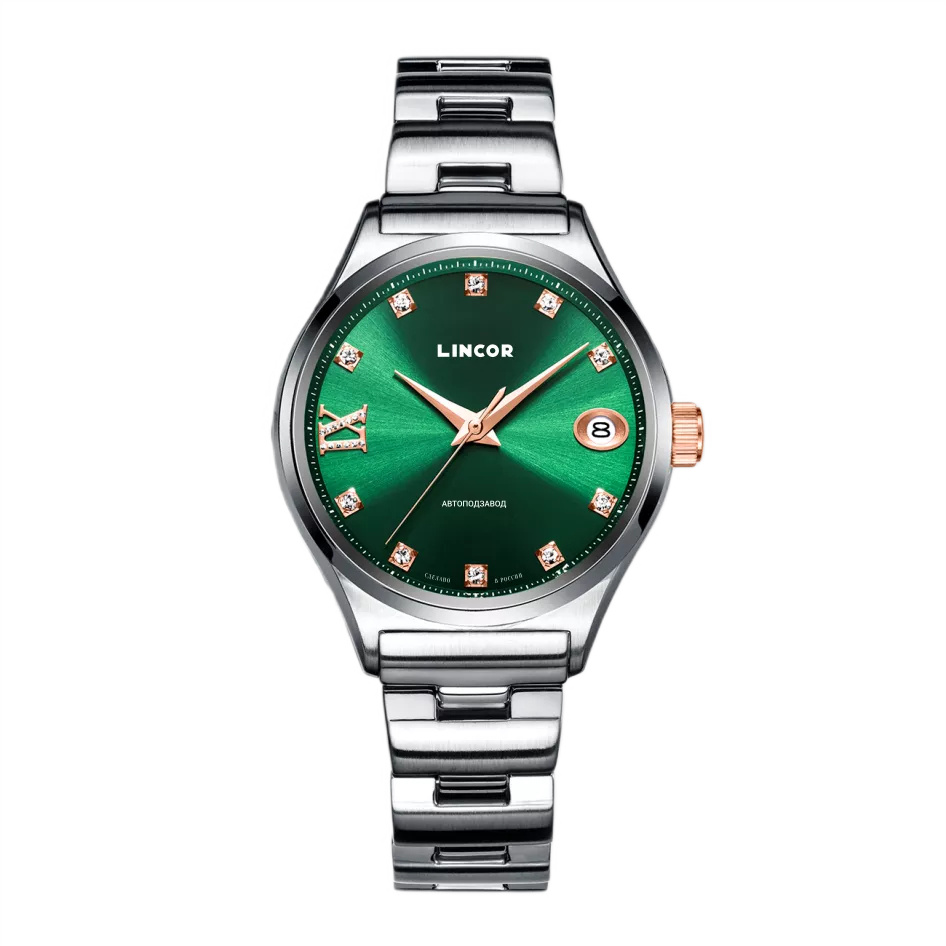 Наручные механические часы с автоподзаводом Lincor UNI зеленые с серебристым ремешком и фианитом