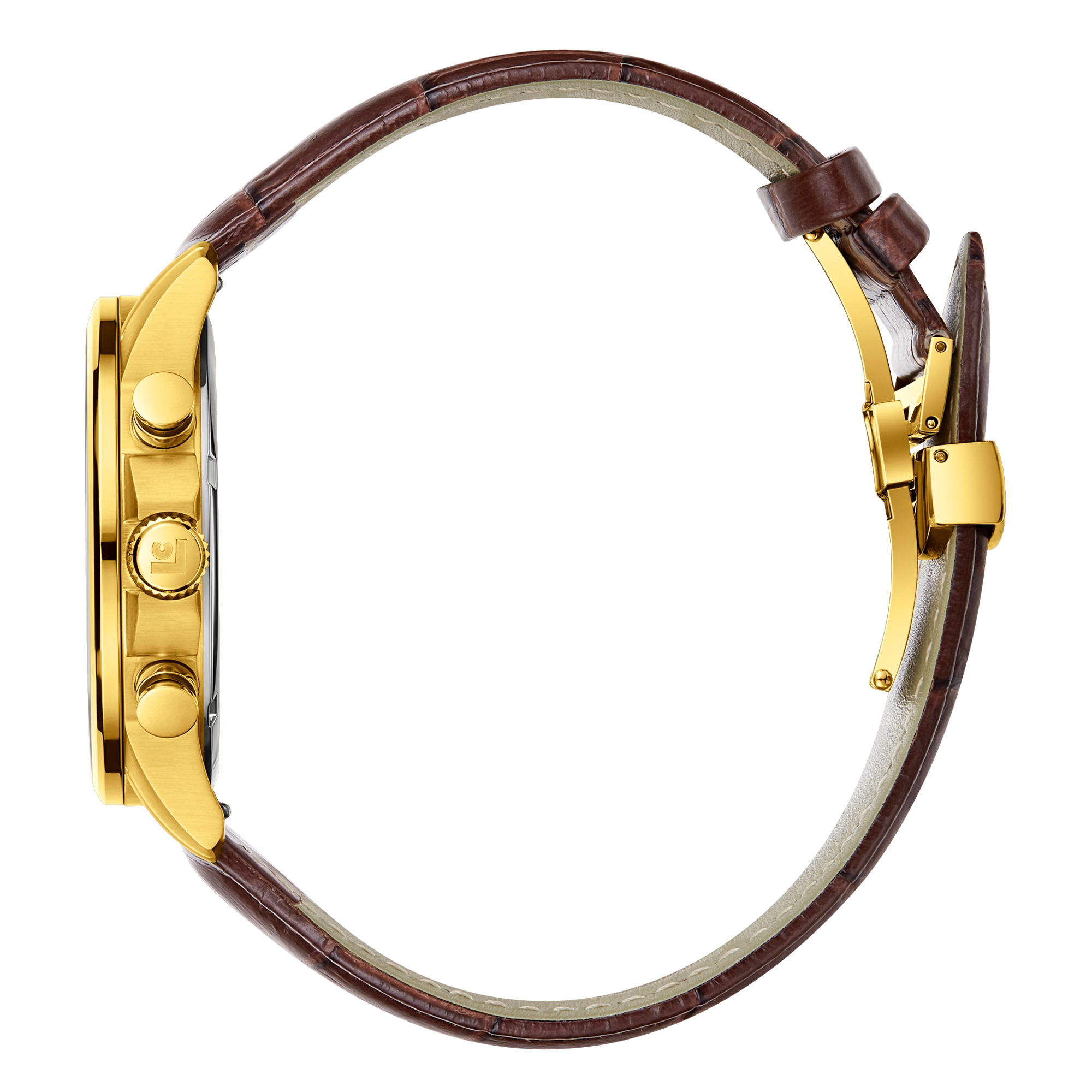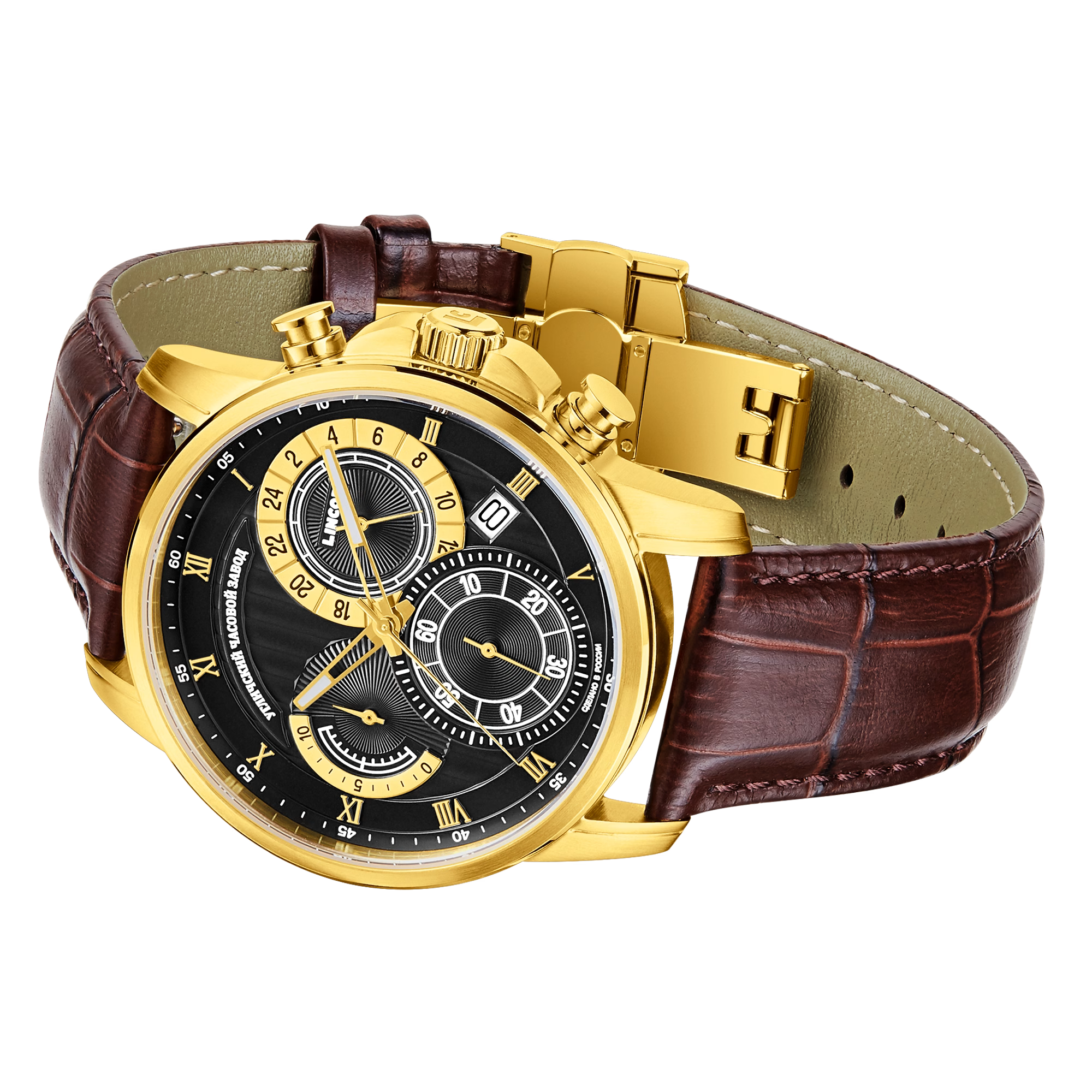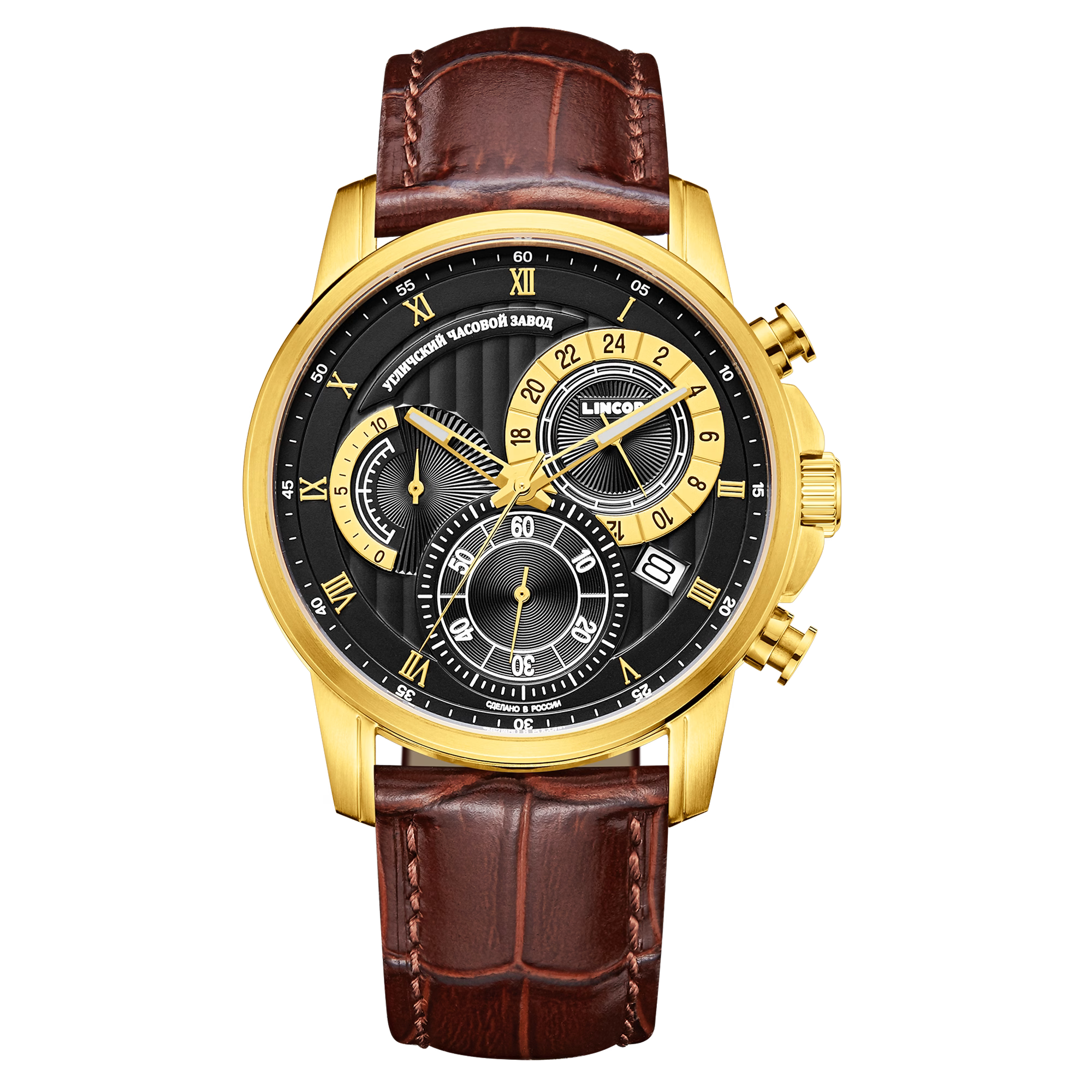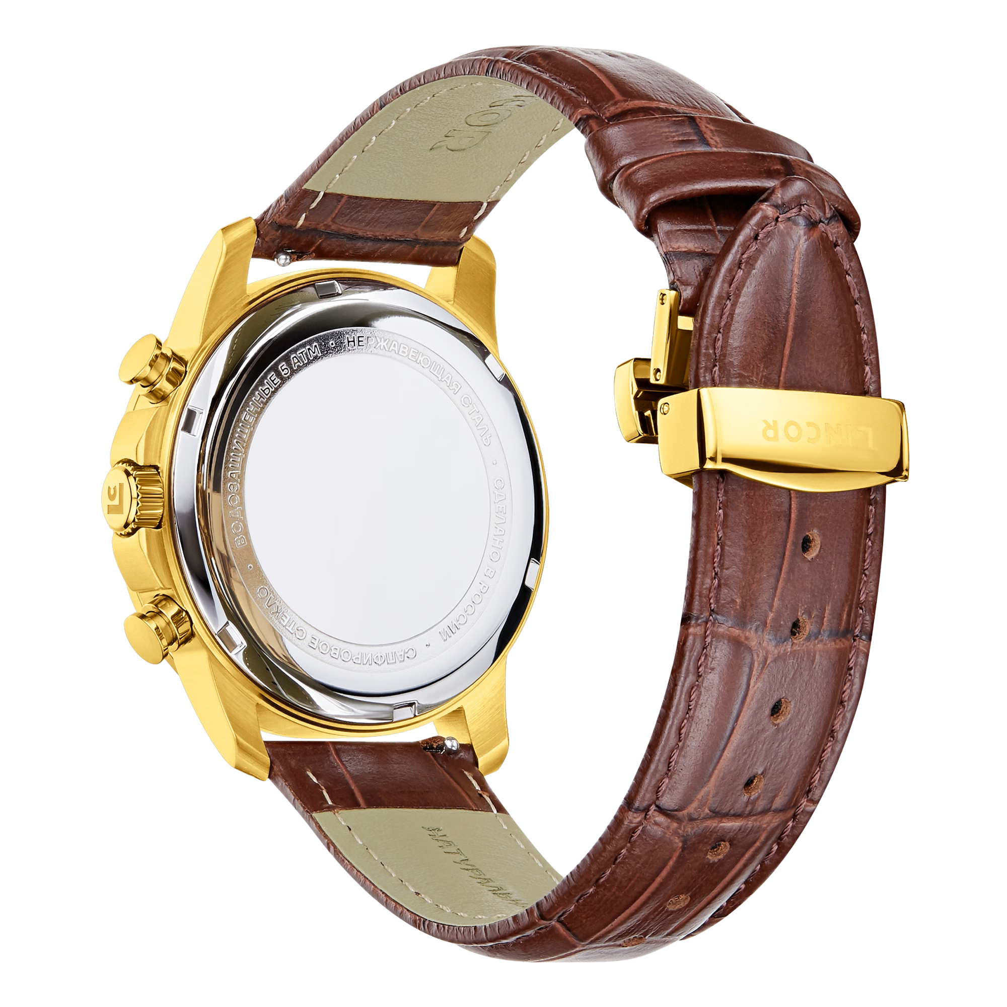 Наручные кварцевые часы Lincor 4123 с хронографом, золотисто-черные с коричневым ремешком
