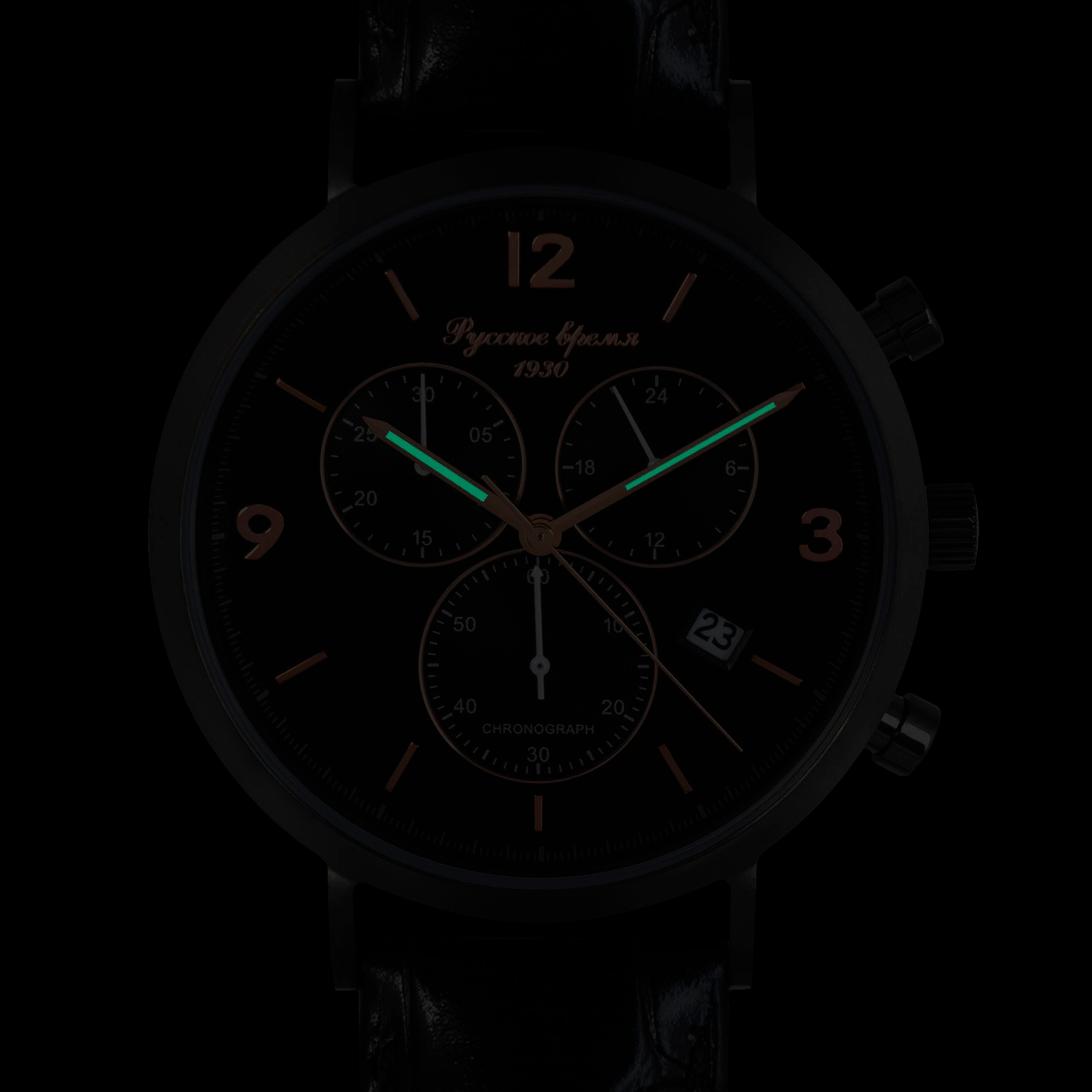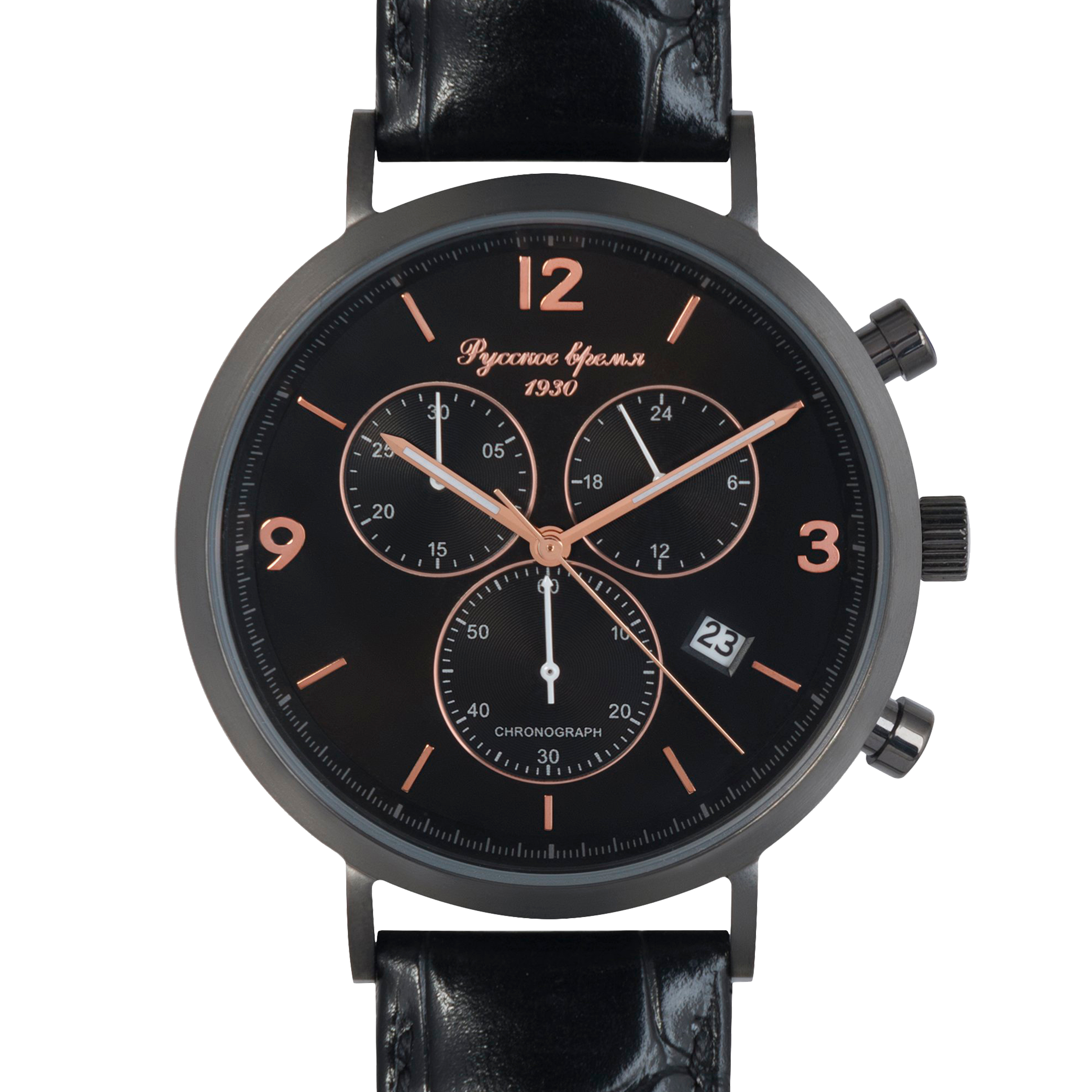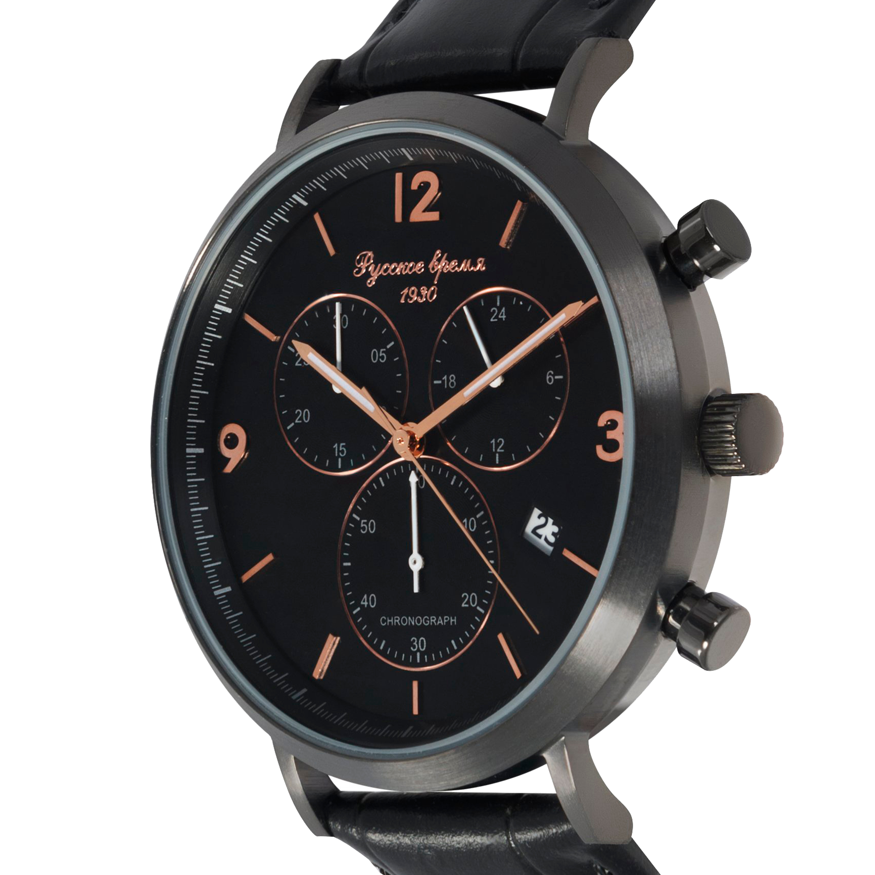 Магнетической притягательностью отличаются полностью черные наручные часы Русское время. Они выглядят стильно, роскошно и очень необычно. Строгий черный циферблат дополнительно оснащен окном даты и высококачественным хронографом. Последний просто необходим тем, кто увлекается спортом. Корпус – нержавеющая сталь, часовой кварцевый механизм – от японской компании Дополнительное достоинство – прочное минеральное стекло. Водозащита 3 АТМ.