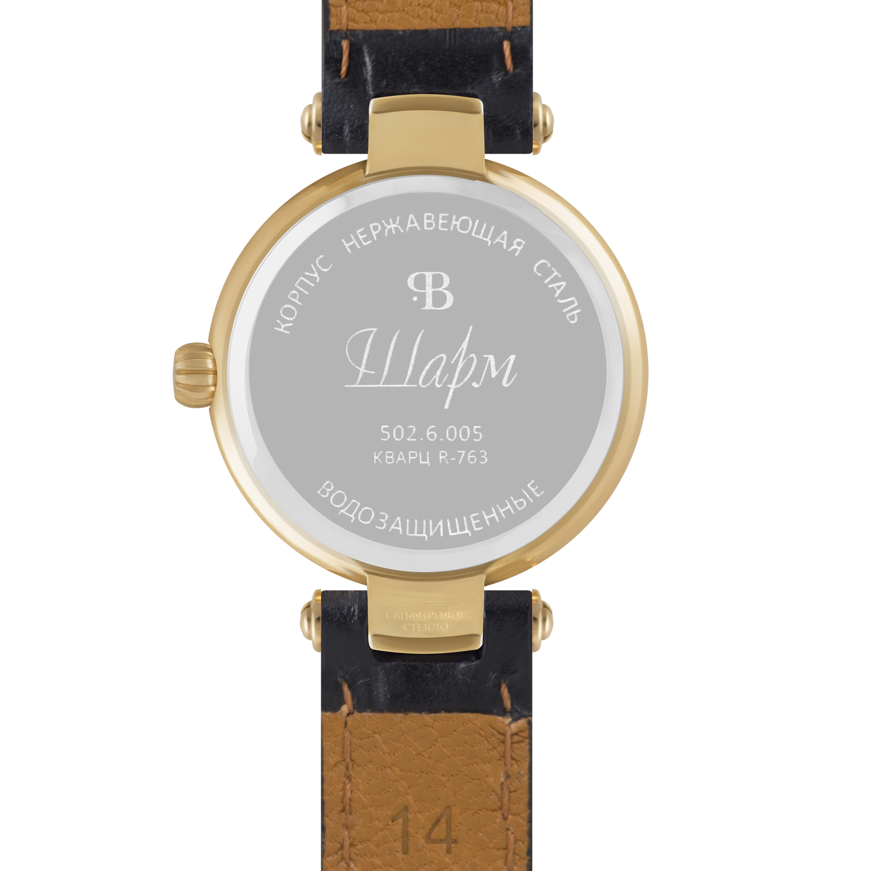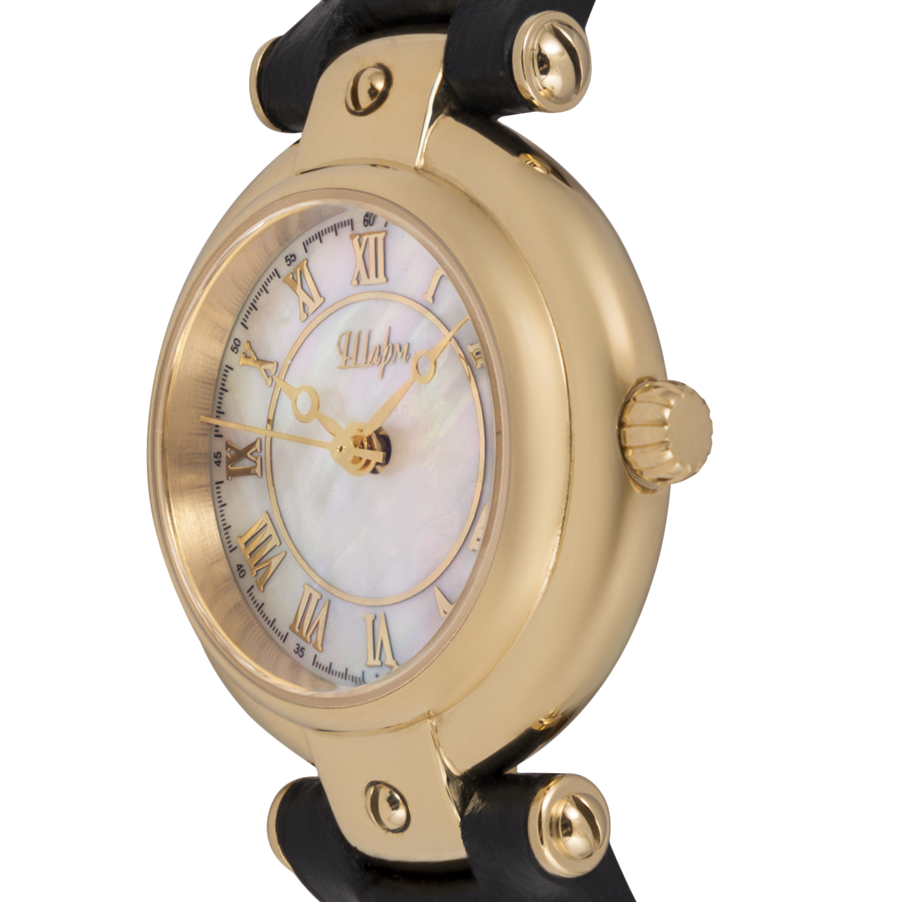 Наручные кварцевые часы Шарм перламутрово-золотистые, с черным ремешком, желтое золото