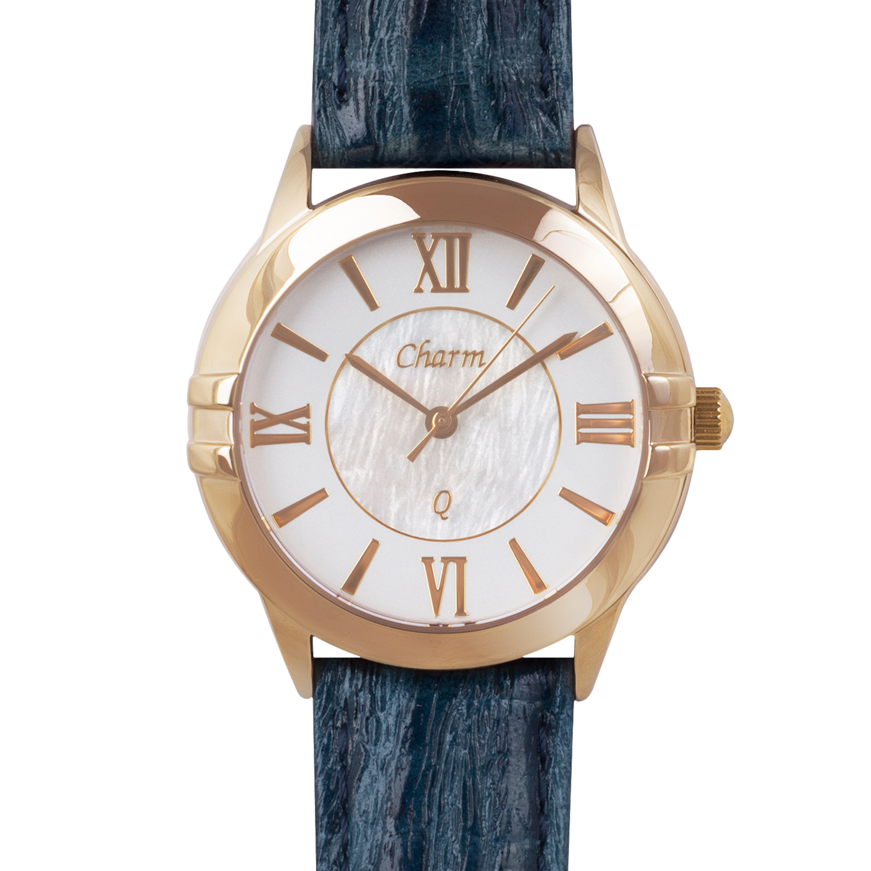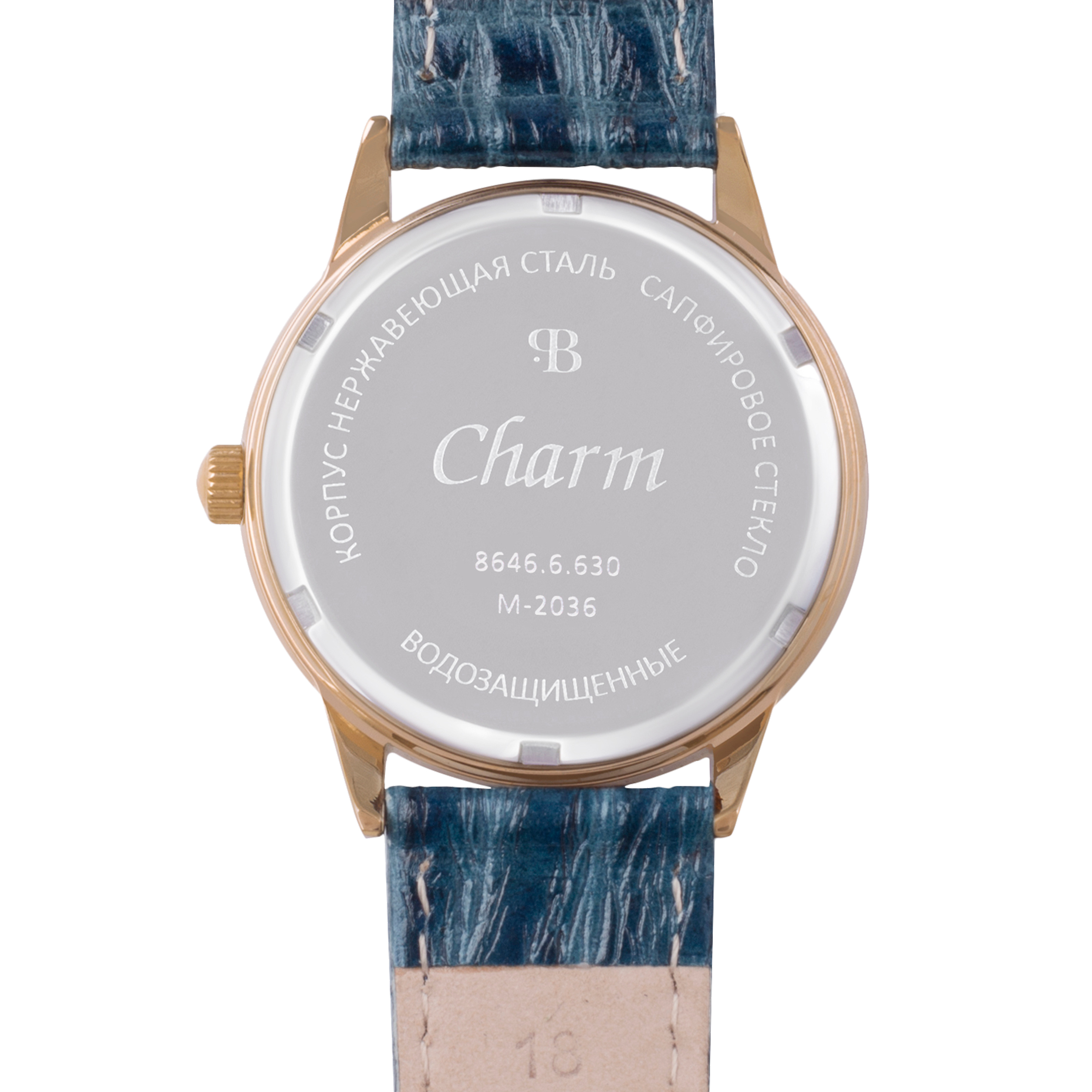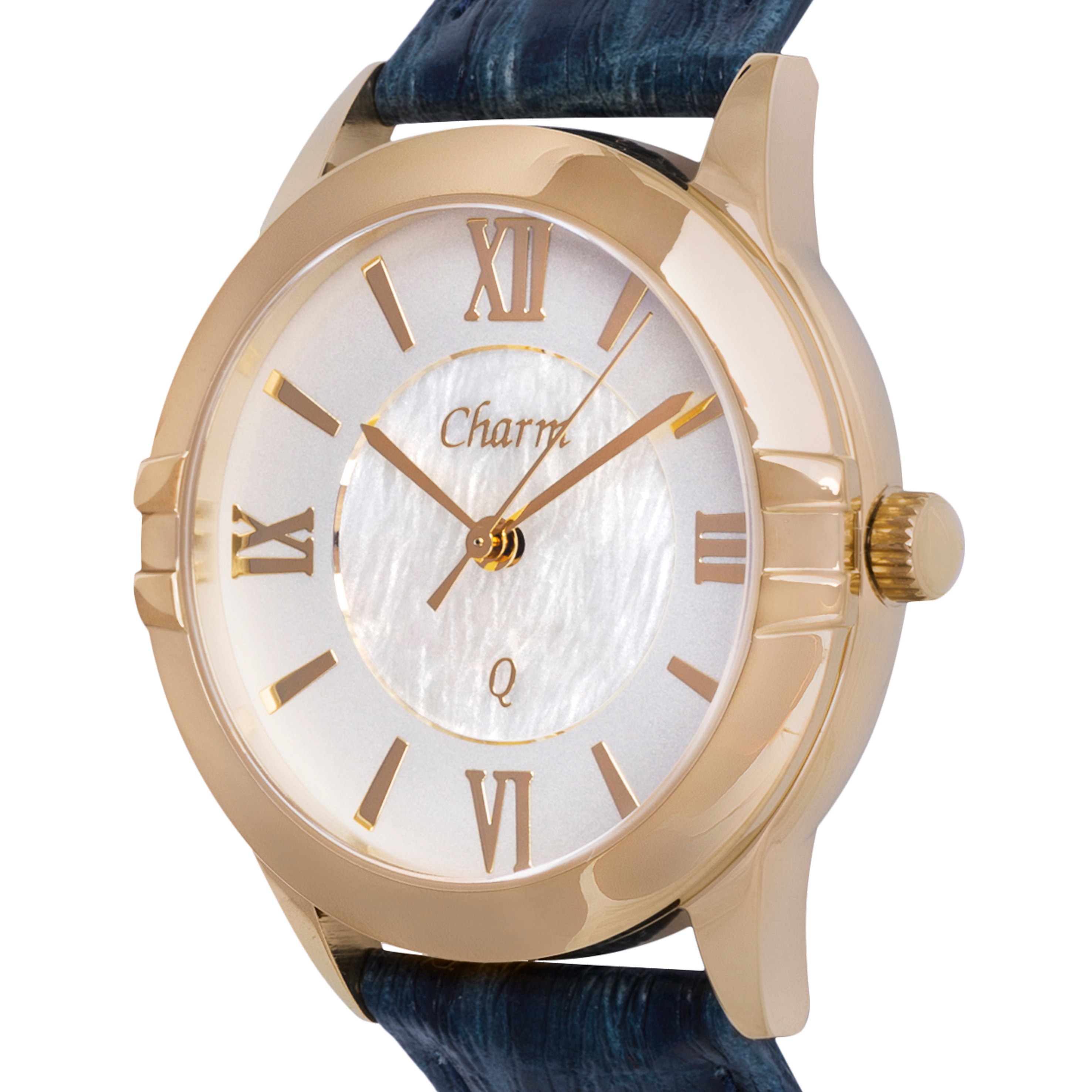 Наручные кварцевые часы Шарм перламутрово-золотистые, с синим ремешком