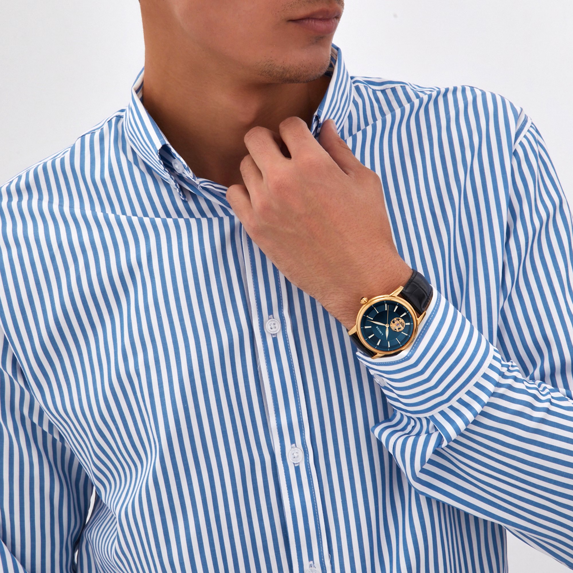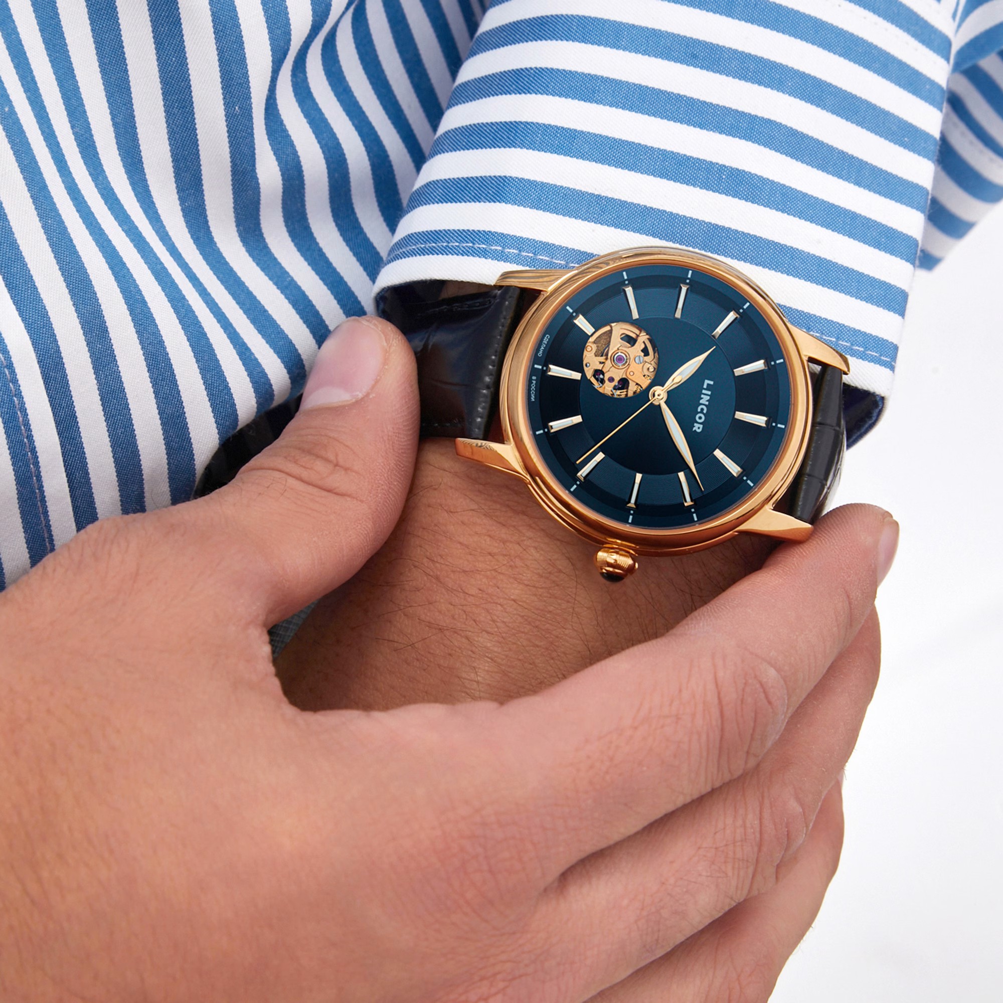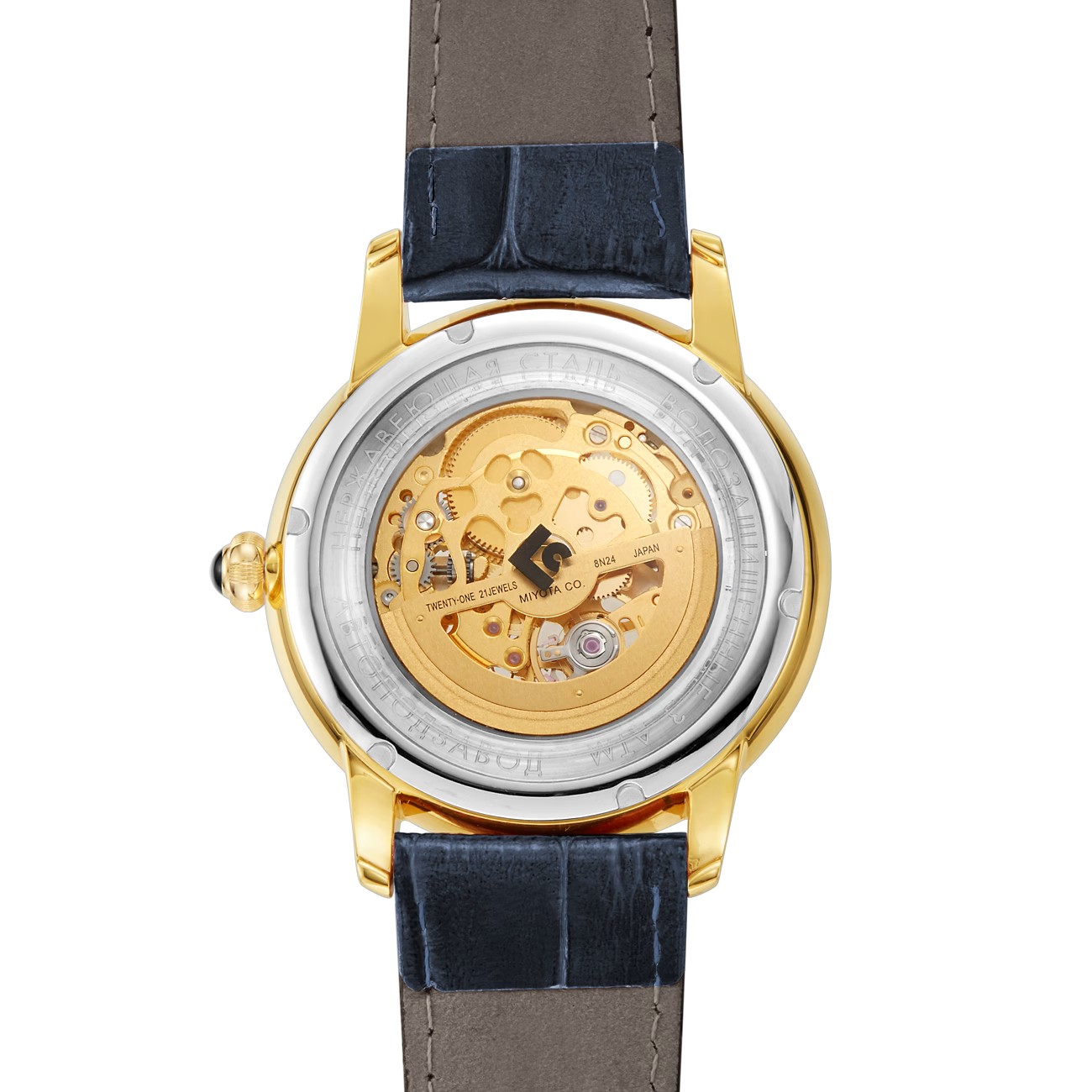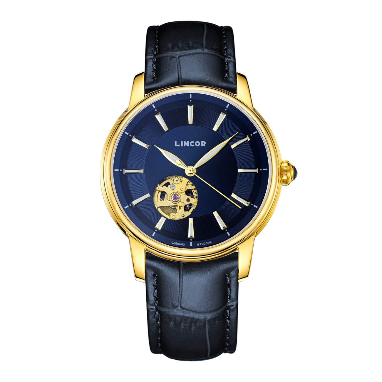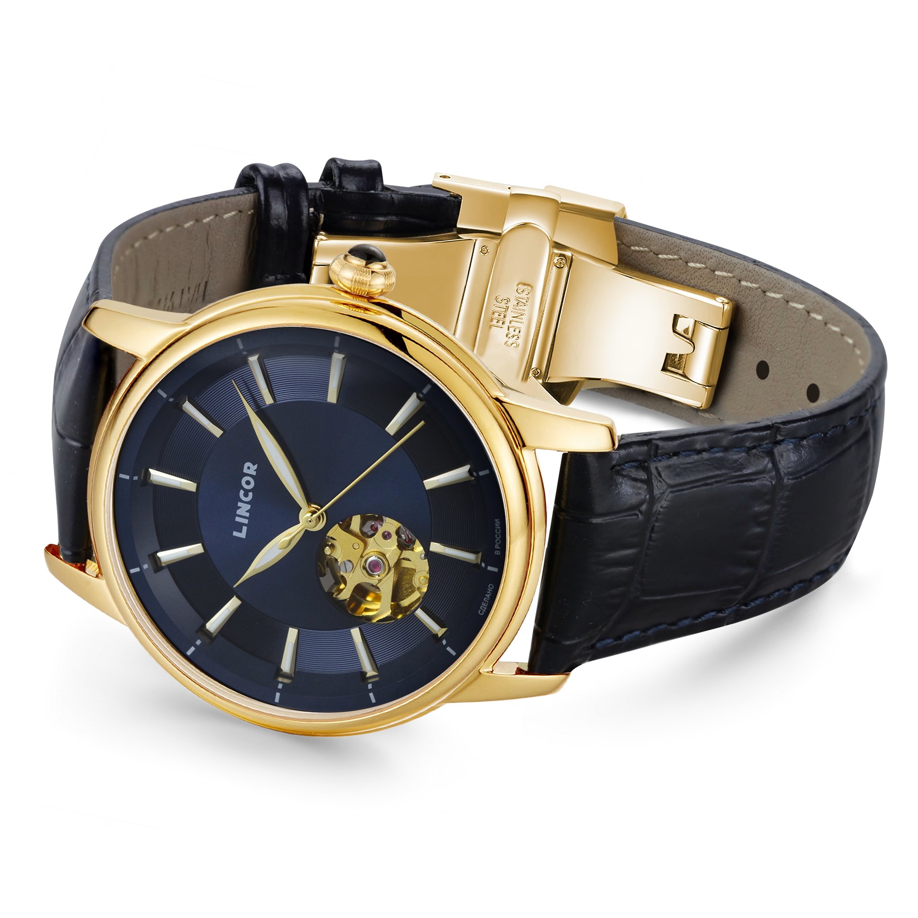 Наручные механические часы Lincor 1183 с автоподзаводом, золотисто-синие с синим ремешком