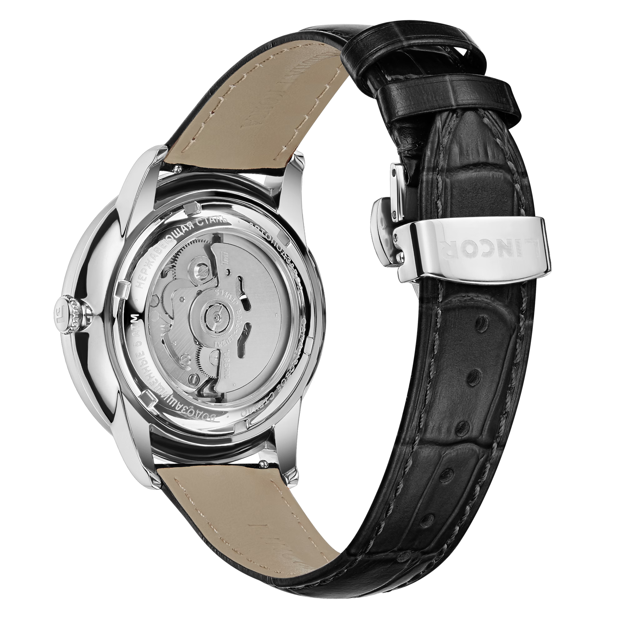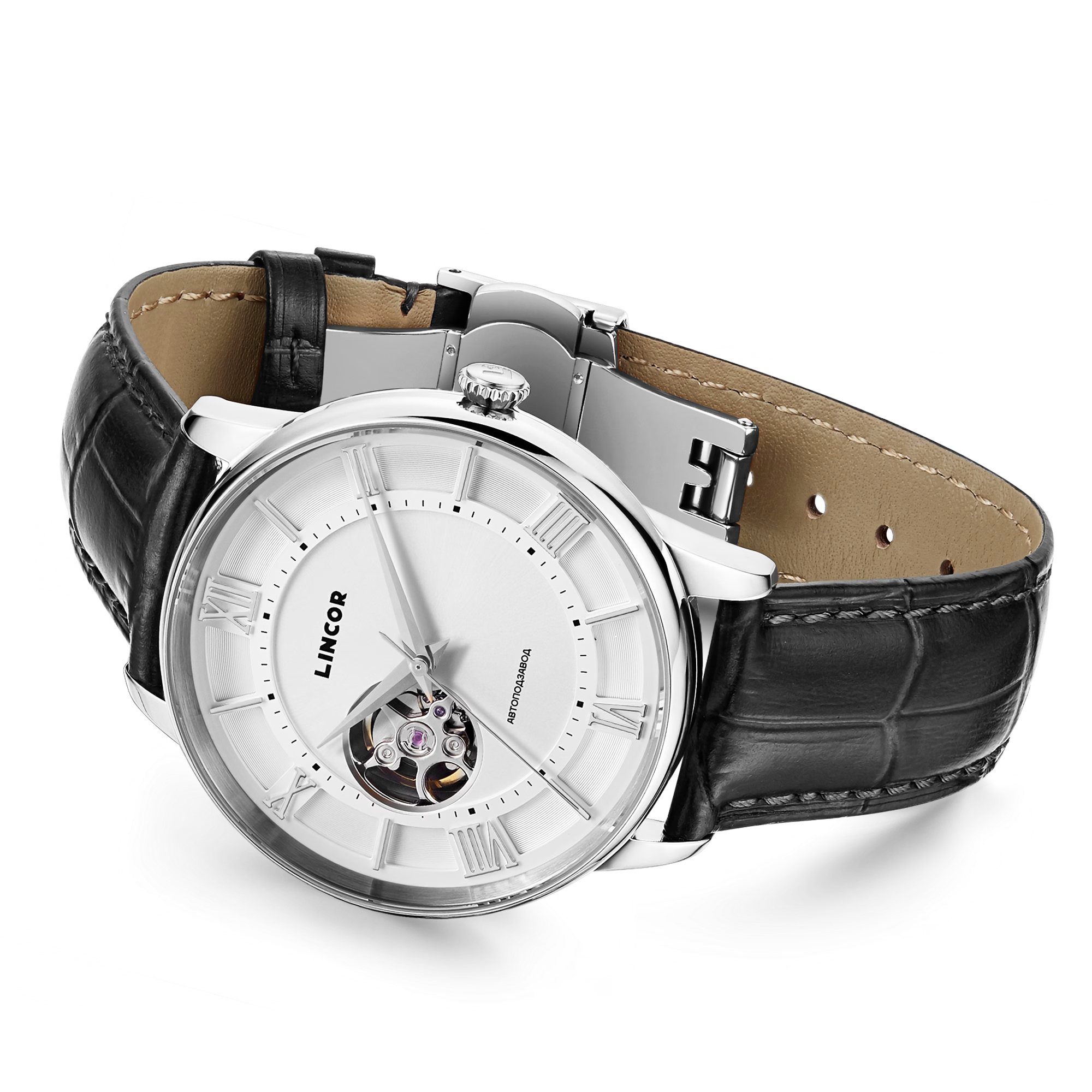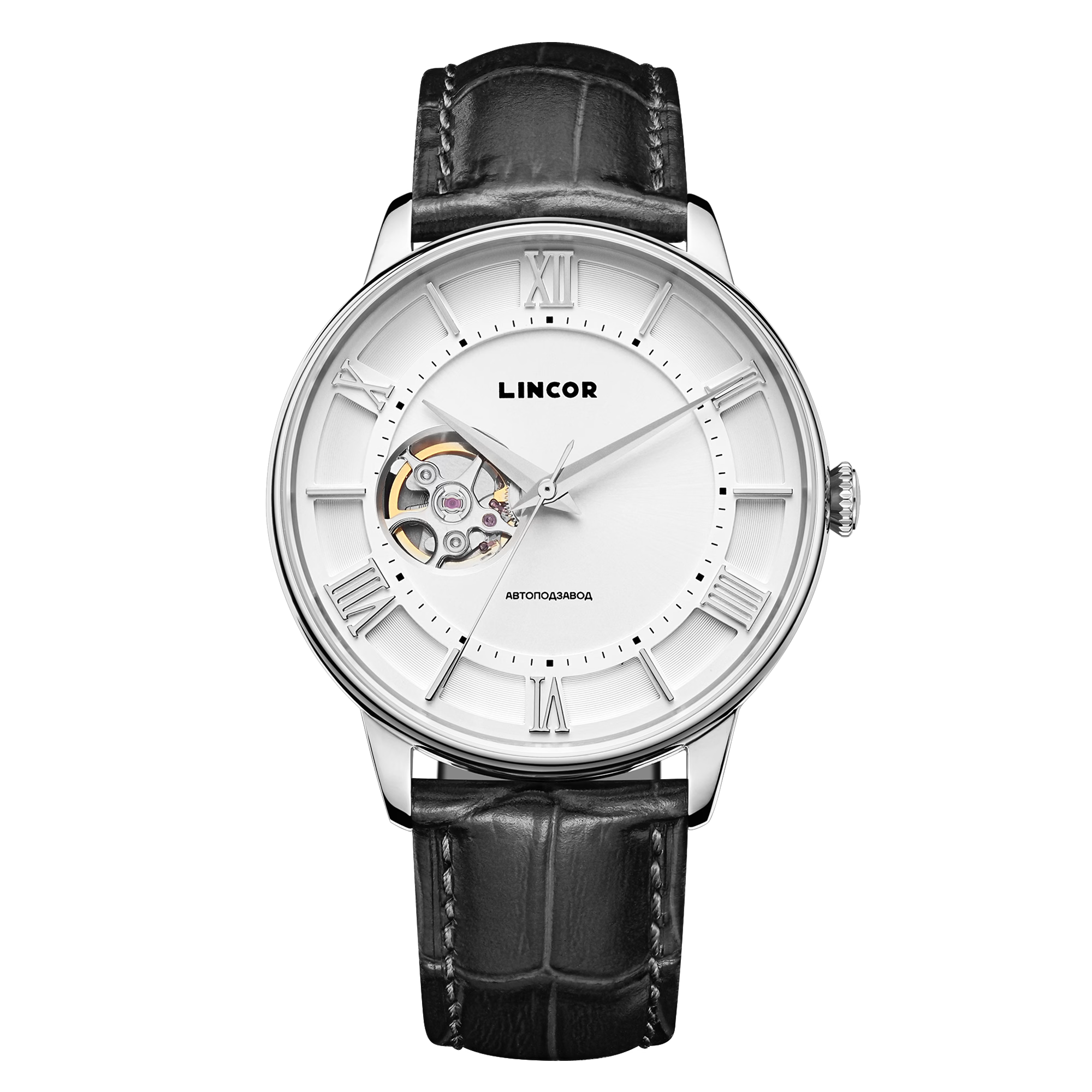 Наручные механические часы Lincor 1927 с автоподзаводом, серебристые с черныым ремешком