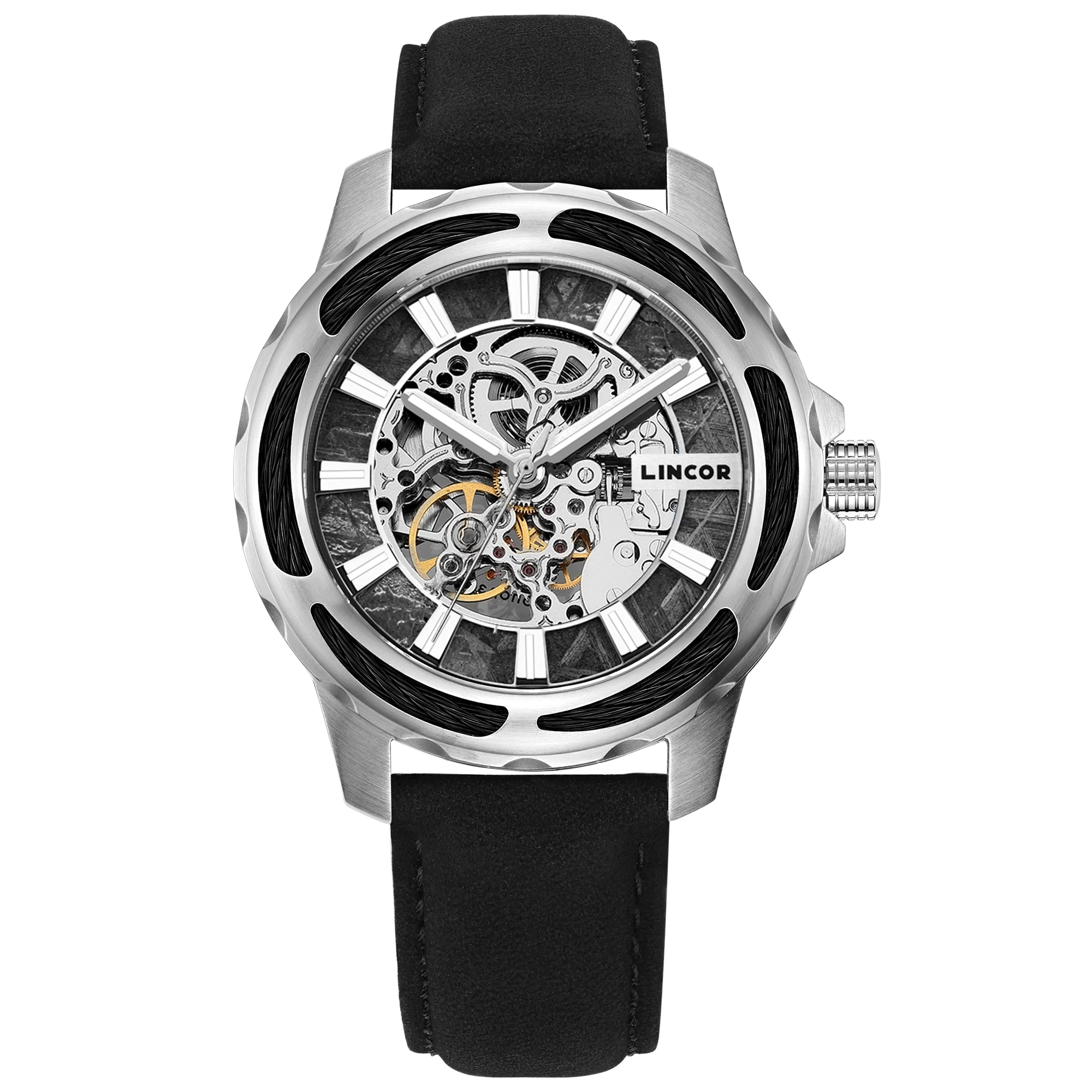 Наручные механические часы Lincor 4110 "Cosmos Метеорит" с автоподзаводом, серебристые с черным ремешком
