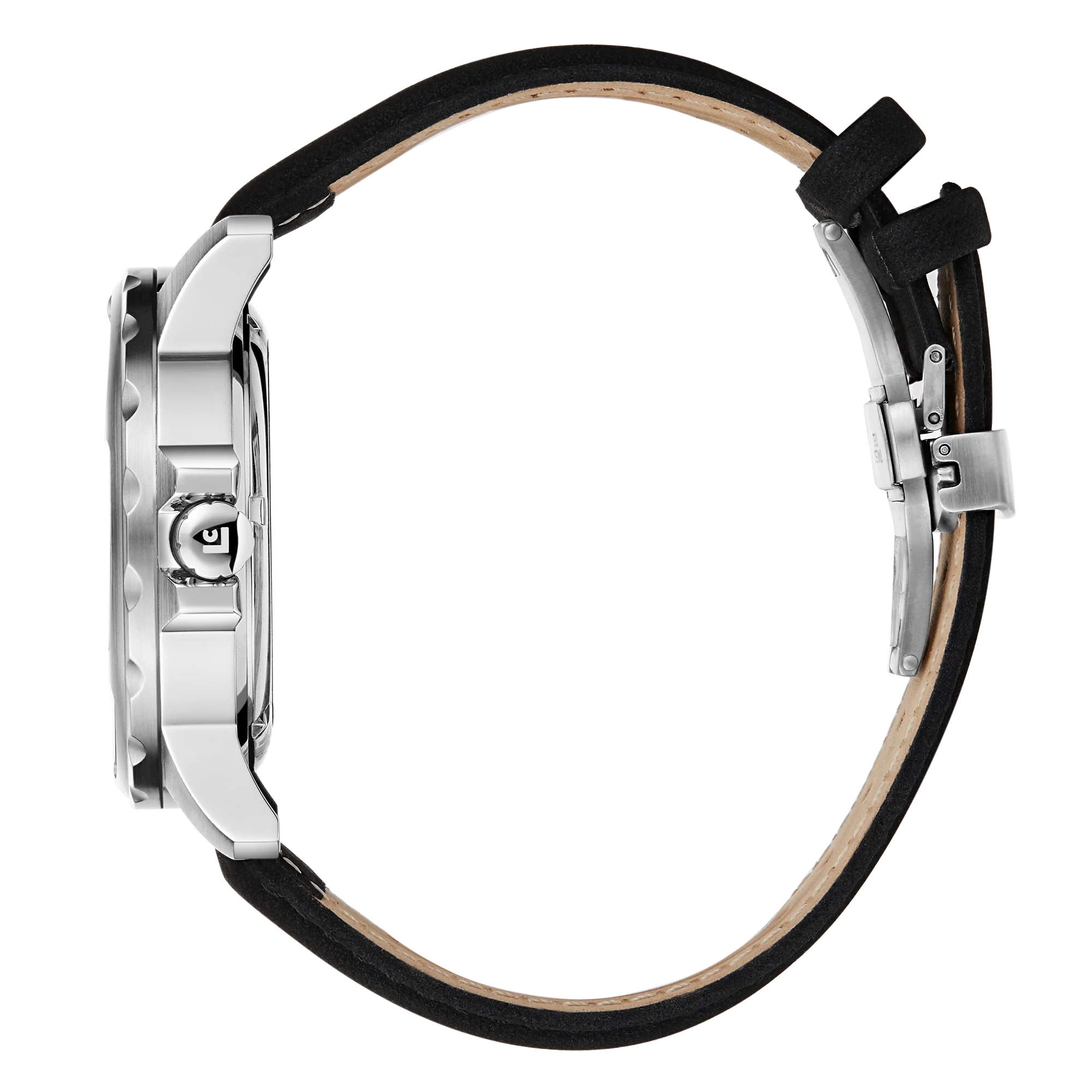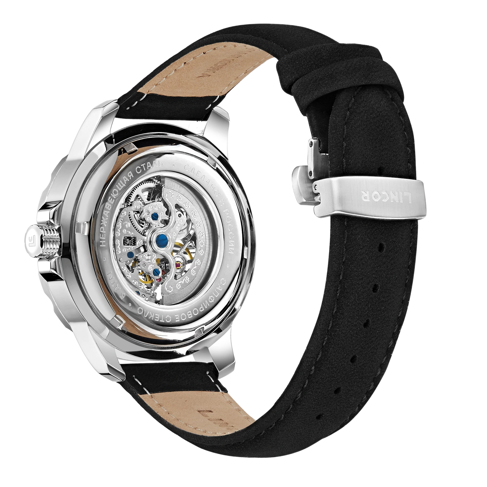 Ремешок из натуральной кожи черного цвета не только обеспечивает комфорт, но и служит завершающим штрихом общей композиции. Он обрамляет серебряный корпус, создавая гармонию цвета и текстуры, которая подчеркивает изысканность изделия. Застежка из нержавеющей стали обеспечивает надежную фиксацию и добавляет уверенности в каждой детали.