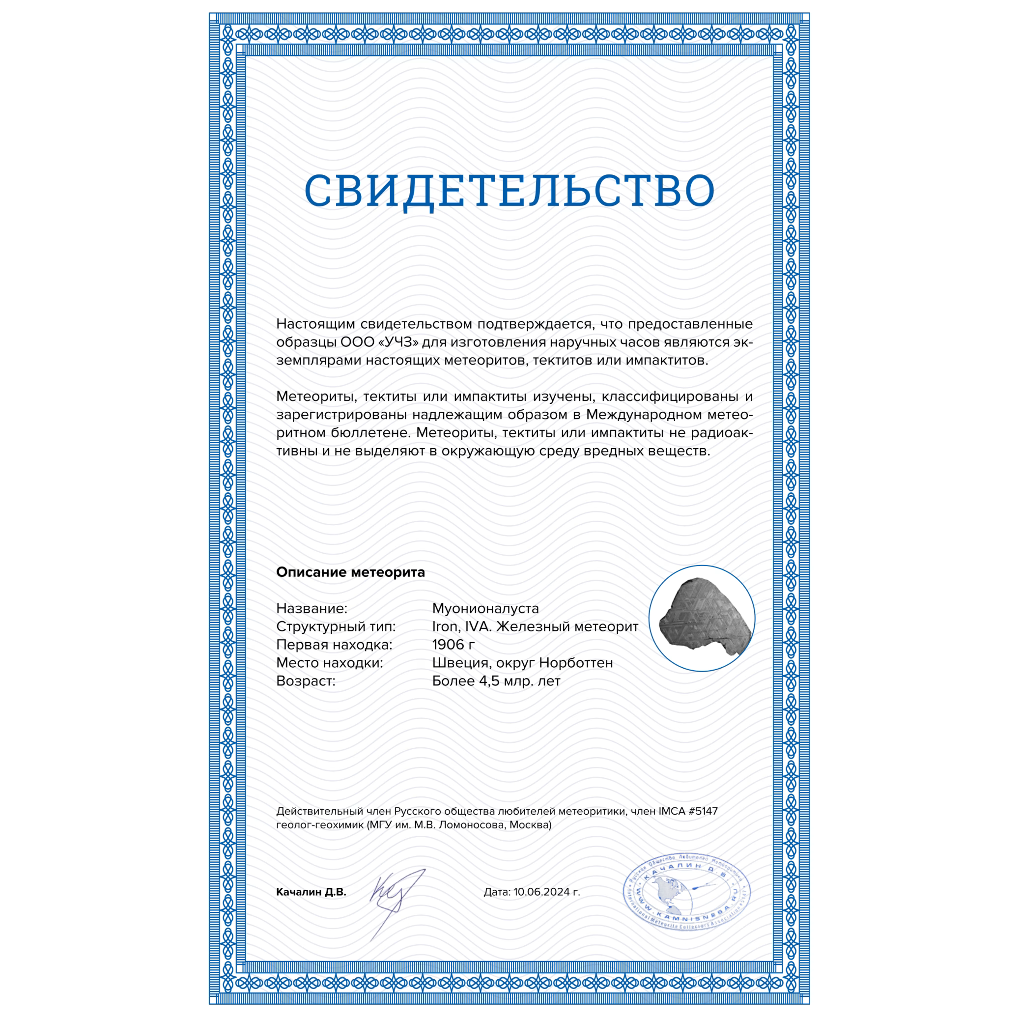 Для наших часов были использованы фрагменты одного из древнейших метеоритов Муонионалуста, обнаруженного в 1906 году недалеко от границы с Финляндией и названного в честь протекающей в тех местах реки Муони. На поверхности циферблата хорошо видны переплетающиеся полосы – видманштеттеновы линии. Такой узор формируется на протяжении миллионов лет в процессе кристаллизации металла в холоде космического пространства, и его используют при исследовании как важный диагностический признак. По предположениям учёных этот метеорит упал на Землю порядка 1 миллиона лет назад, это значит, что он пережил 4 ледниковых периода, а его предположительный возраст составляет более 4,5 миллиардов лет.
