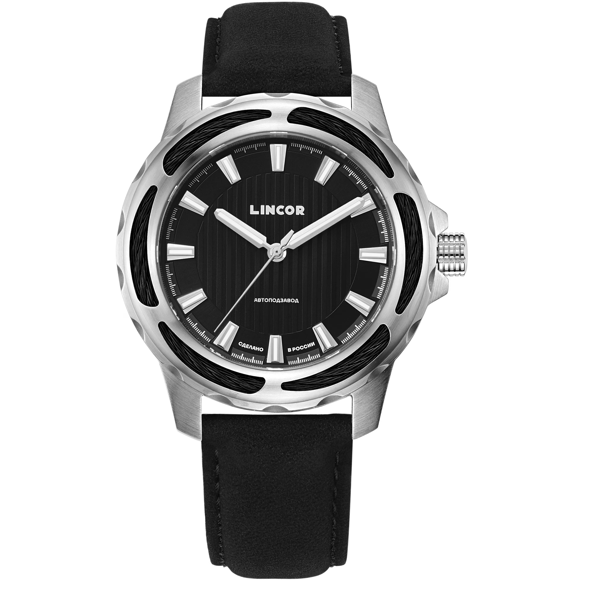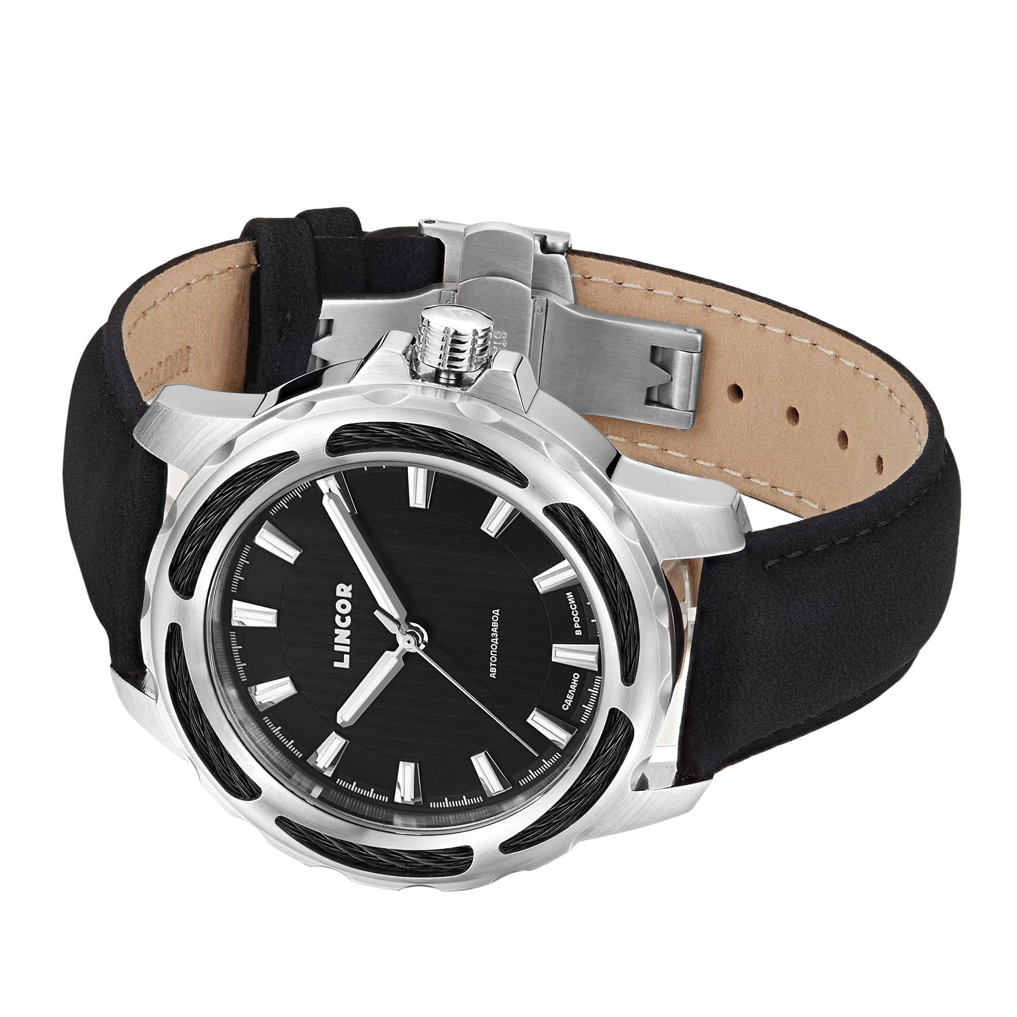 Наручные механические часы Lincor 4110 с автоподзаводом, серебристо-черные с черным ремешком