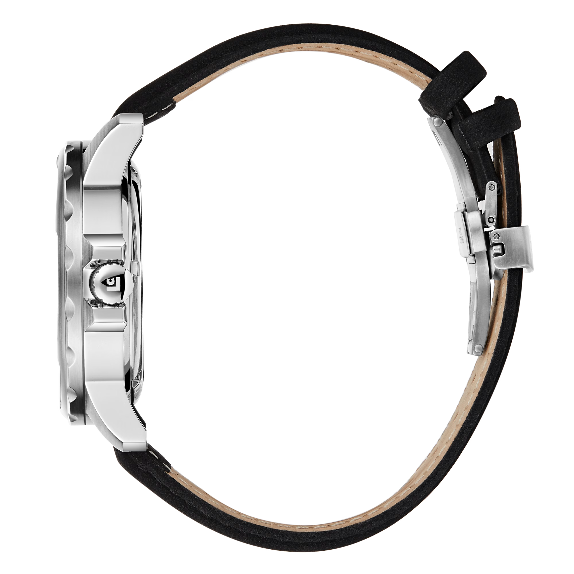 Брутальные мужские механические часы с автоподзаводом, которые станут надёжным и практичным спутником в любом образе. В оригинальный 47 миллиметровый корпус из нержавеющей стали установлено сапфировое стекло, устойчивое к появлению царапин. Ремешок чёрного цвета, изготовленный из износостойкого материала алькантара с внешней стороны и нубука - с внутренней, гармонично сочетается с металлическим канатом, обрамляющим фактурный корпус, и оттеняет объемные накладные индексы, на которые, как и на стрелки, нанесено люминесцентное покрытие. Прозрачная задняя крышка открывает вид на завораживающую работу механического механизма с автоподзаводом и запасом хода 35 ч., а водонепроницаемость 5 АТМ позволяет использовать часы в условиях повышенной влажности.