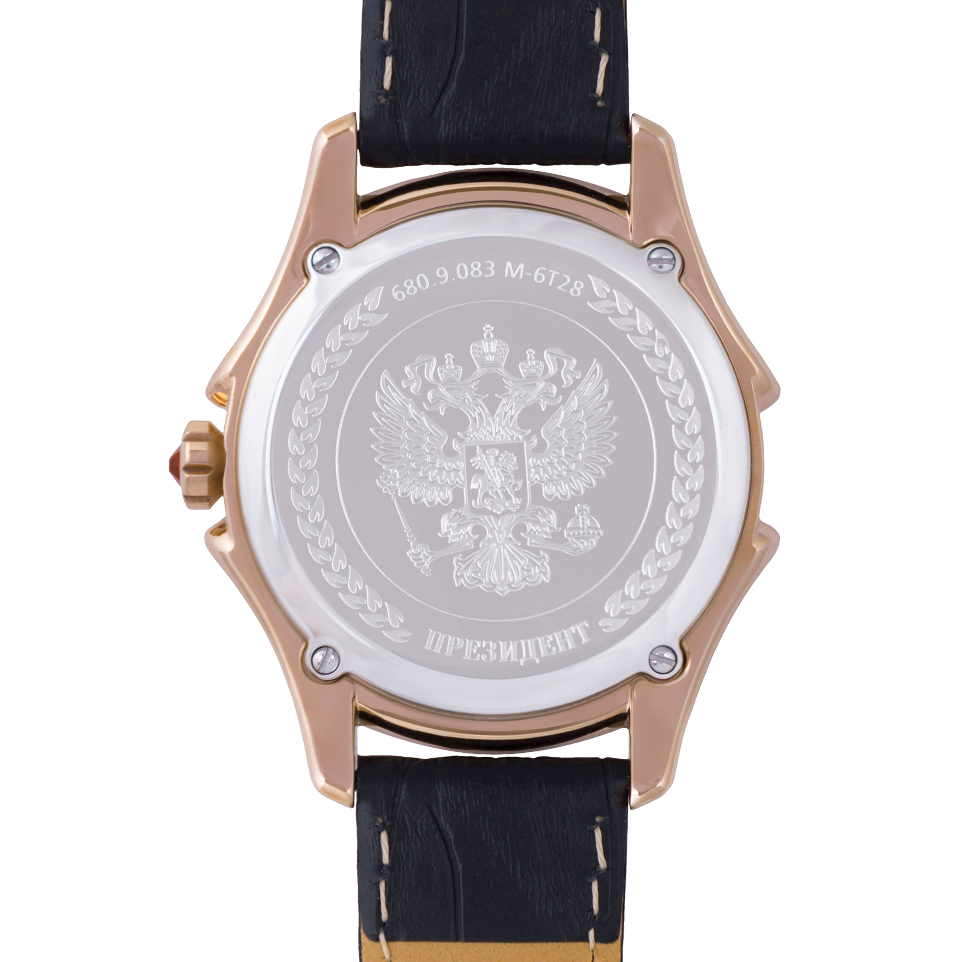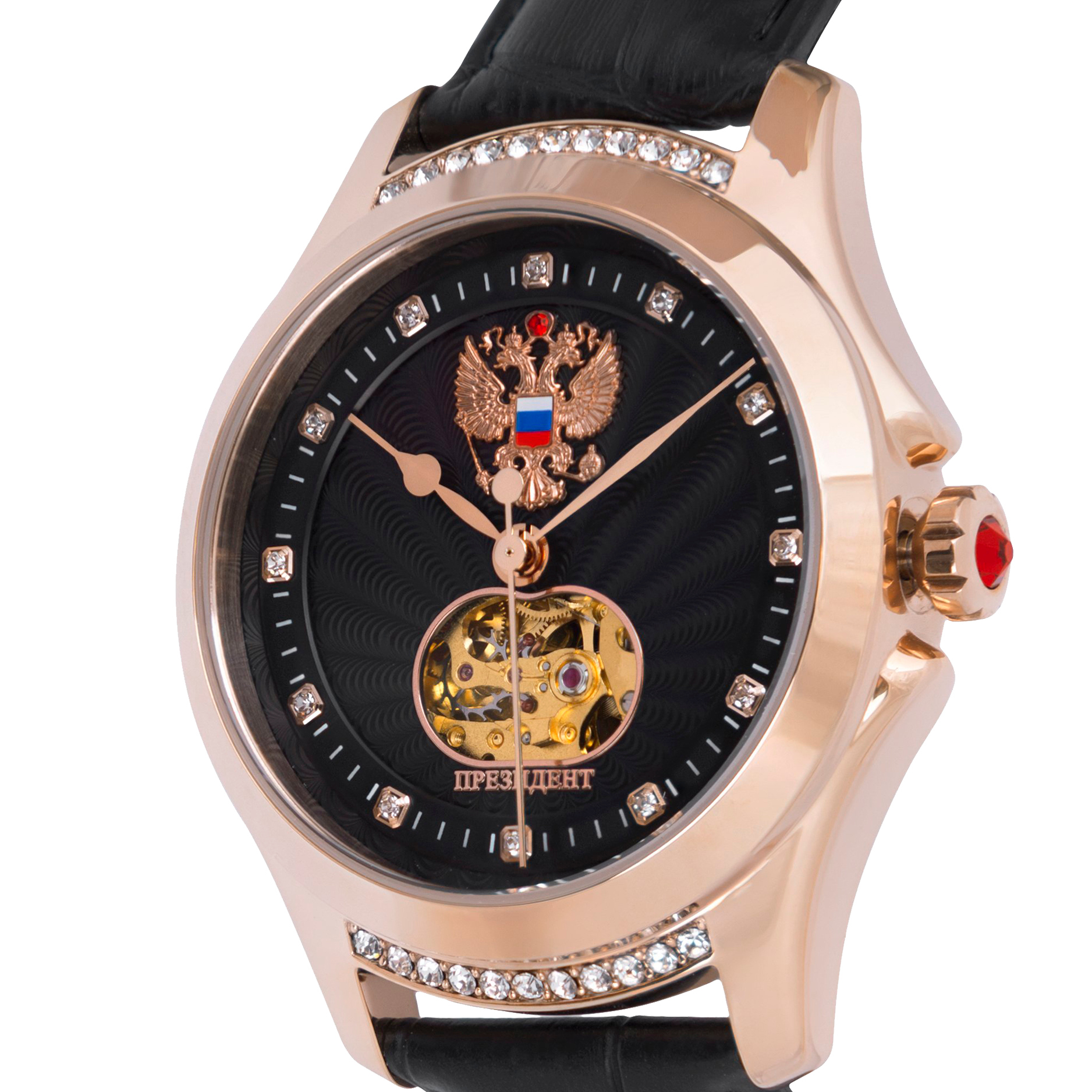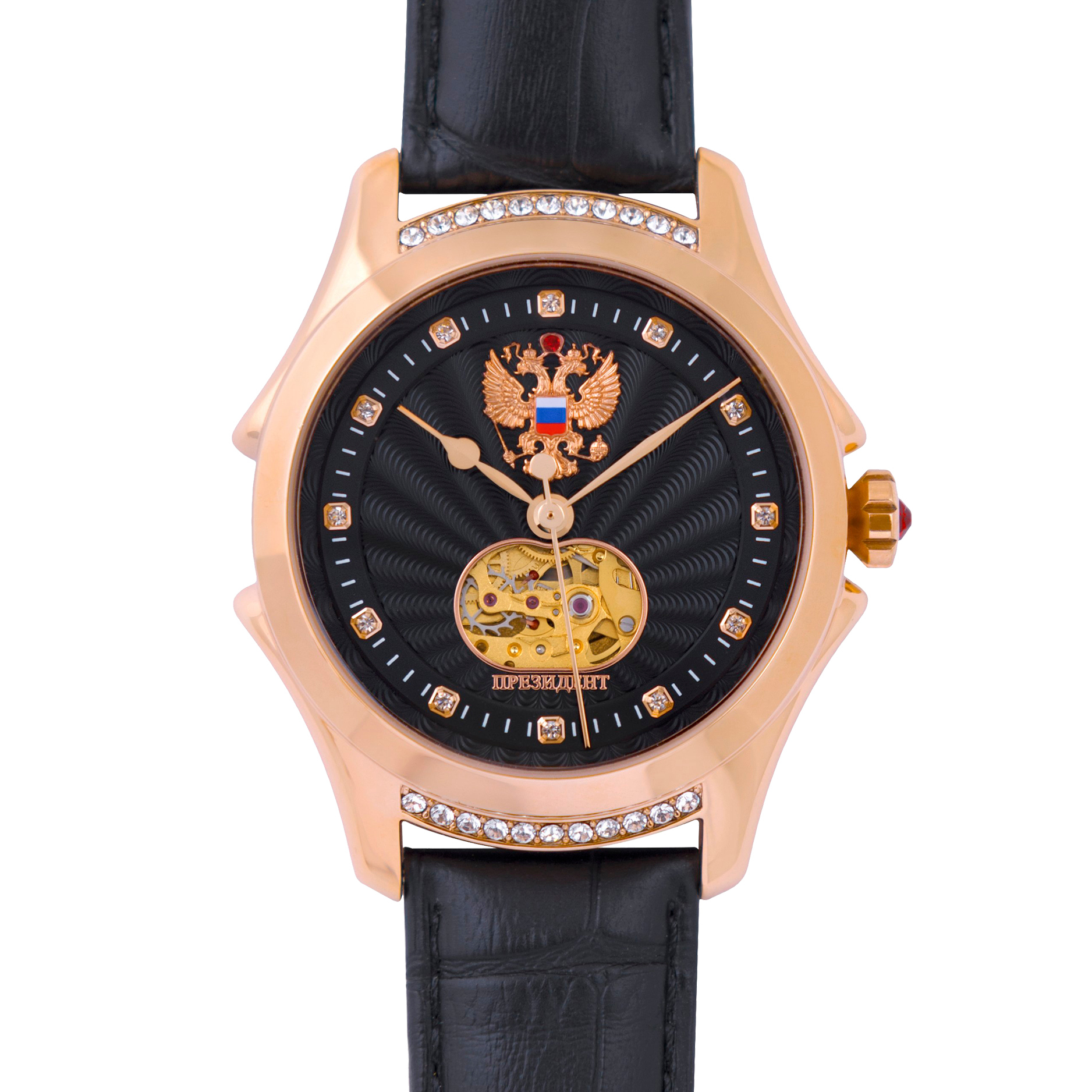 Стильные элегантные часы Президент идеально впишутся в образ активной и целеустремленной личности. Надежный позолоченный корпус из нержавеющей стали имеет лаконичную форму. Сдержанный декор из кристаллов Сваровски смягчает деловой характер модели, но не разрушает его. Красивый черный циферблат украшен государственной символикой и имеет открытое окно баланса. Удобный ремешок, выполненный из натуральной кожи, надежно фиксирует часы на запястье.