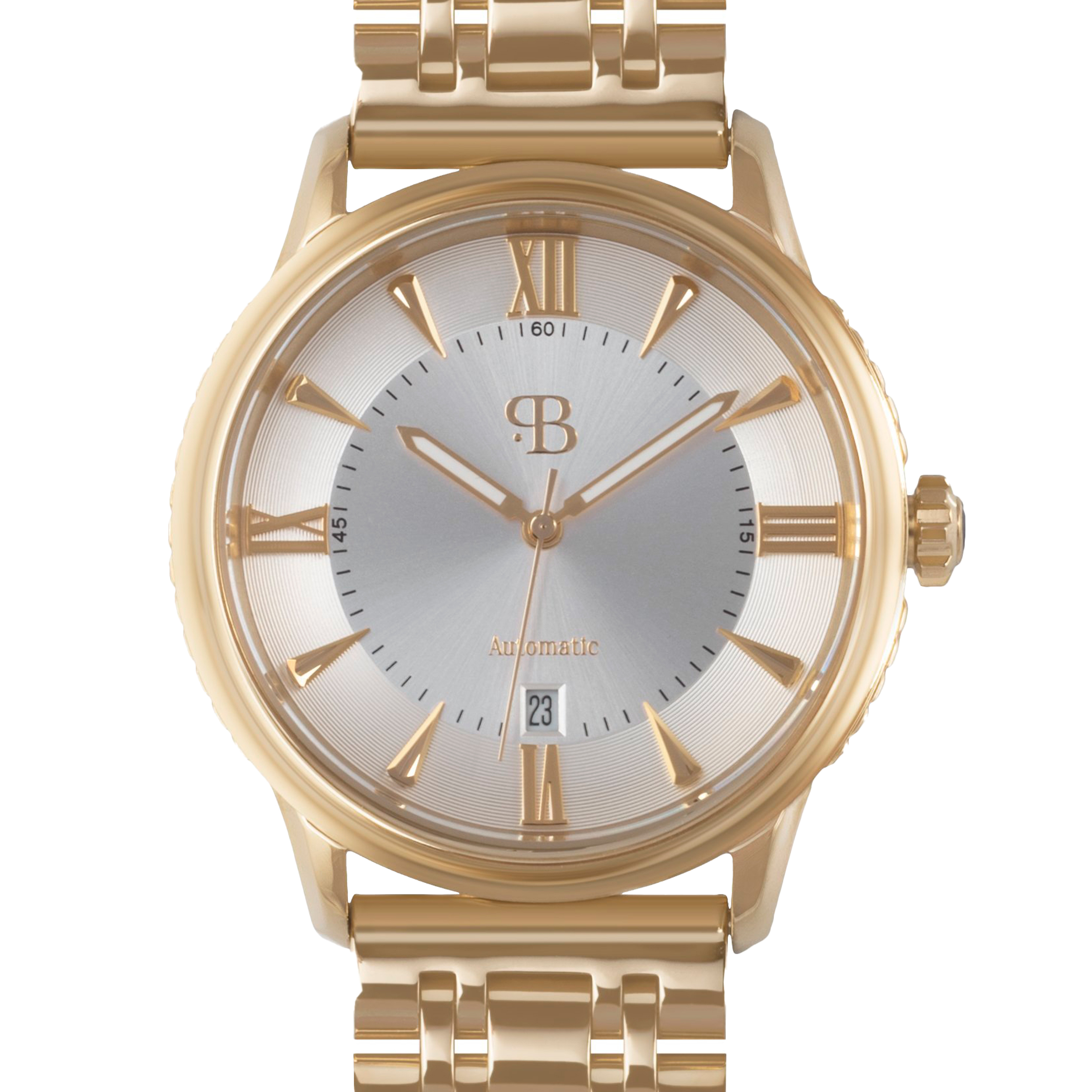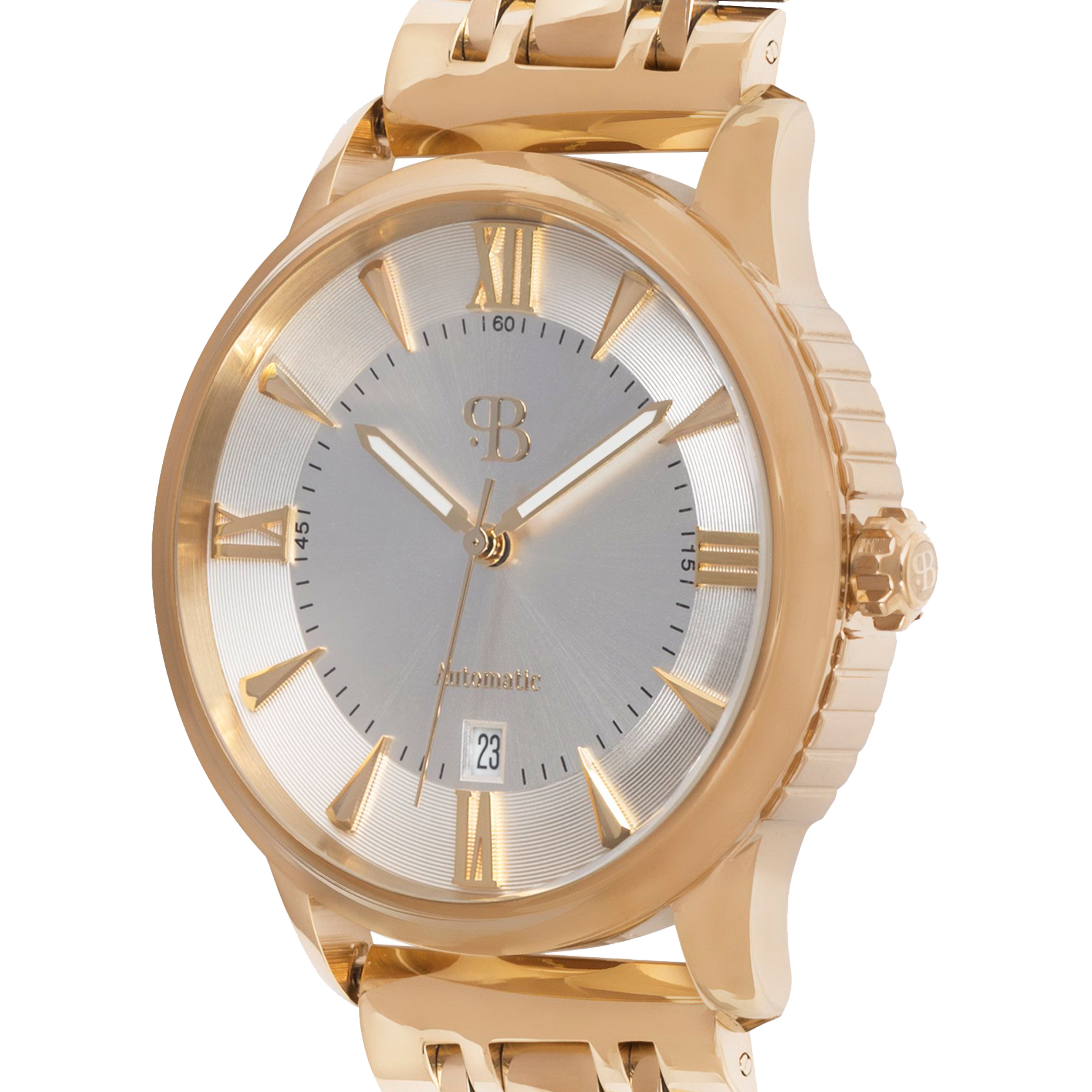Элегантный циферблат с золотистыми стрелками и белыми римскими цифрами покрыт прозрачным минеральным стеклом диаметром 42,5 миллиметра. Антибликовое минеральное стекло позволяет легко увидеть время при любых погодных условиях. Аналоговый дисплей управляется японским кварцевым механизмом для точного отсчета времени. Кожаный черный ремешок имеет удобную застежку и хорошо дополняет образ.