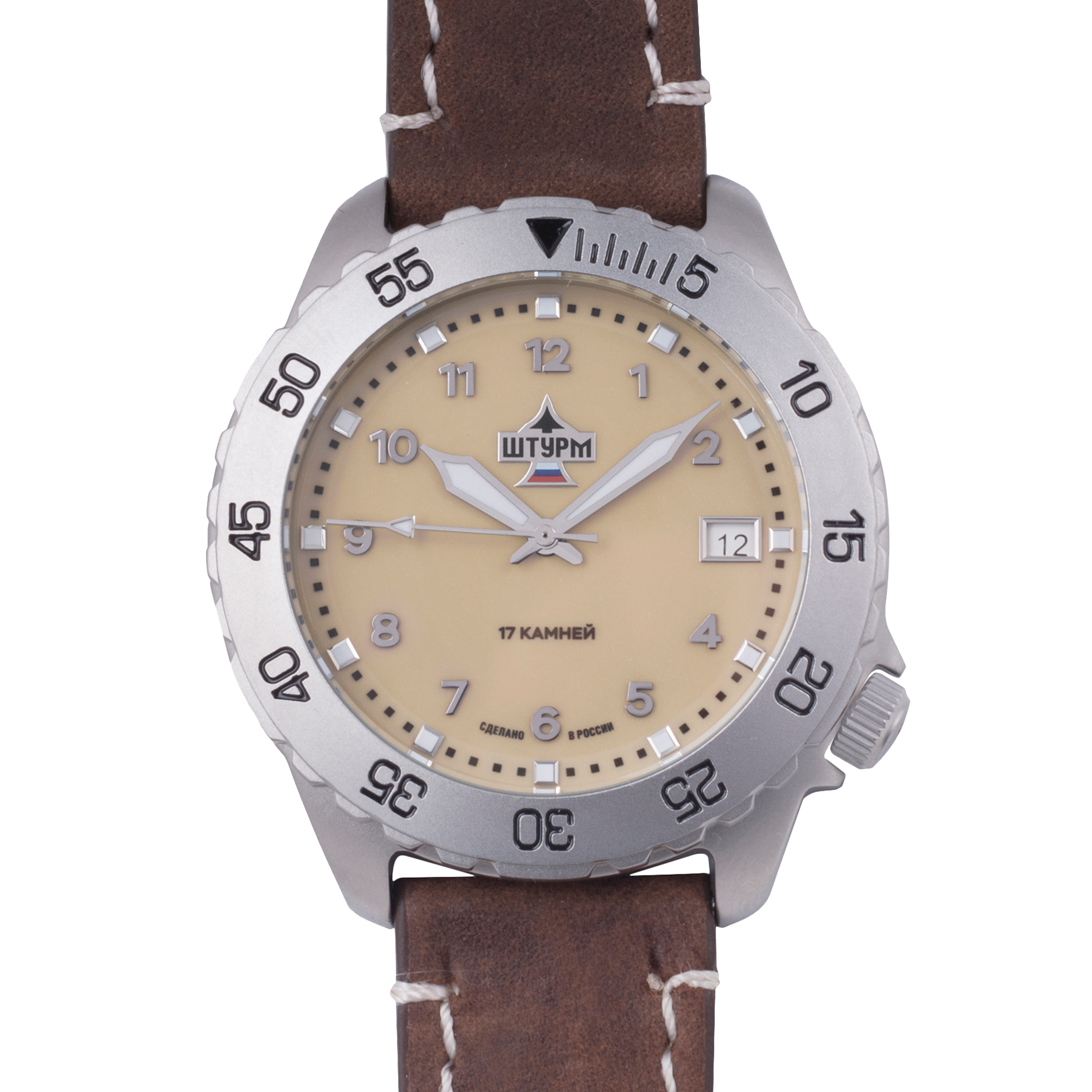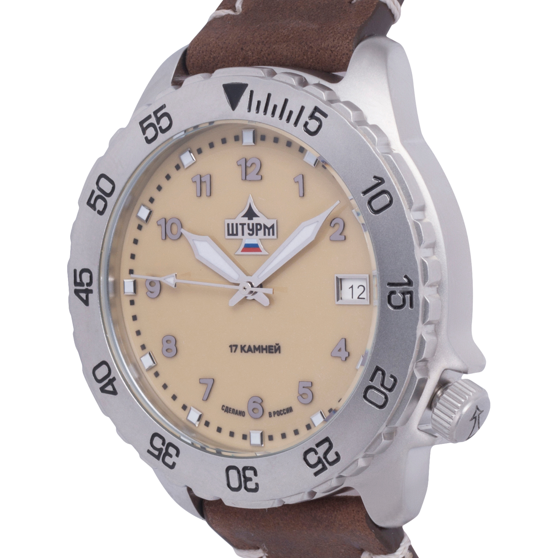 Наручные механические часы Штурм бежево-серебристые, с коричневым ремешком