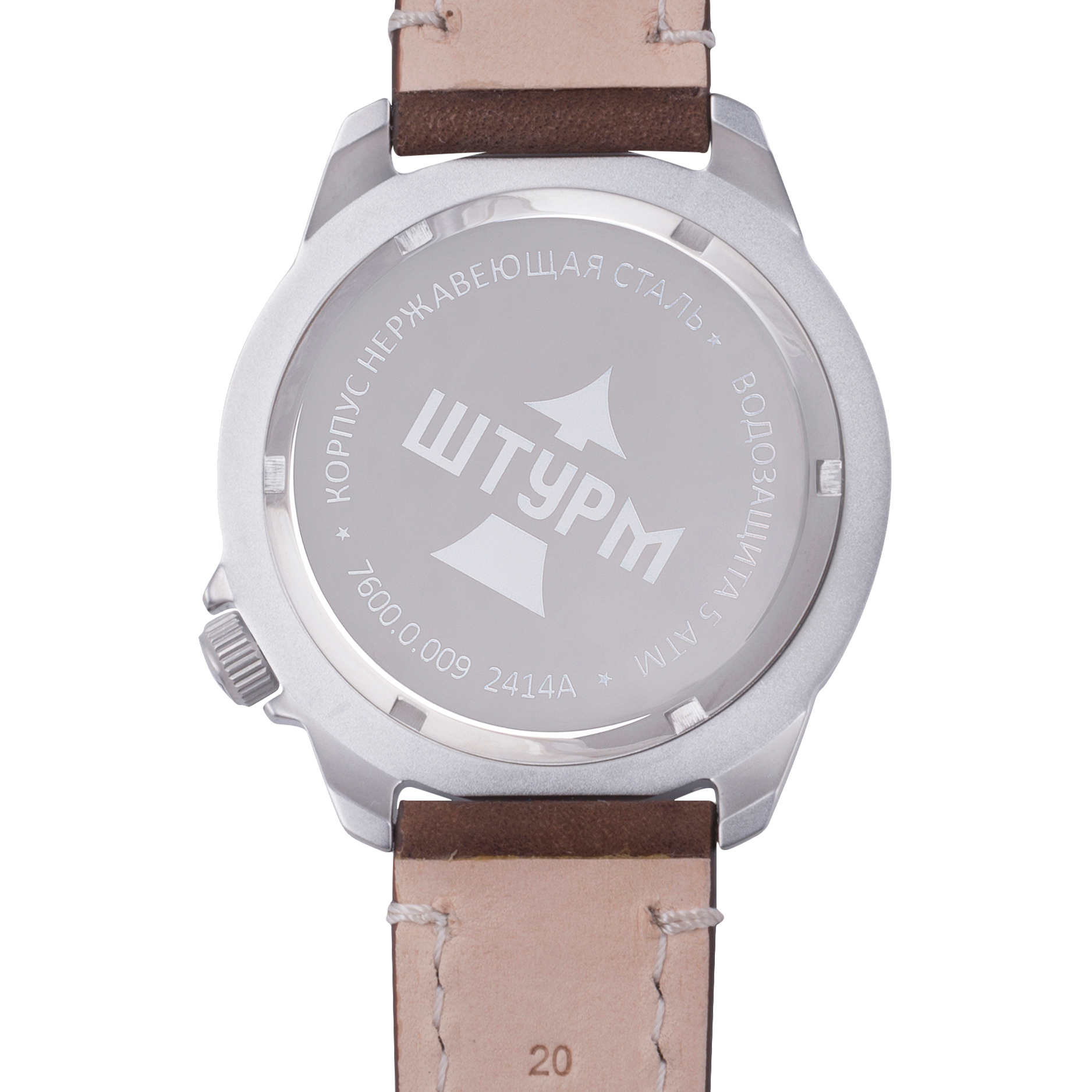 Часы механические Штурм в прочном стальном корпусе предназначены для настоящих мужчин, ведущих активный образ жизни и ценящих превыше всего надежность и качество. Нержавеющая сталь отлично защищает сверхточный механизм от ударов и прочих возможных повреждений, в том числе, и от проникновения воды, пыли и грязи. Прочное минеральное стекло не искажает изображение, под каким углом бы вы не взглянули на циферблат. Стекло не мутнеет, не царапается, сохраняет идеальную прозрачность долгое время. Функция автоматического подзавода увеличивает резерв хода часов. Завинчивающаяся заводная головка делает корпус герметичным.