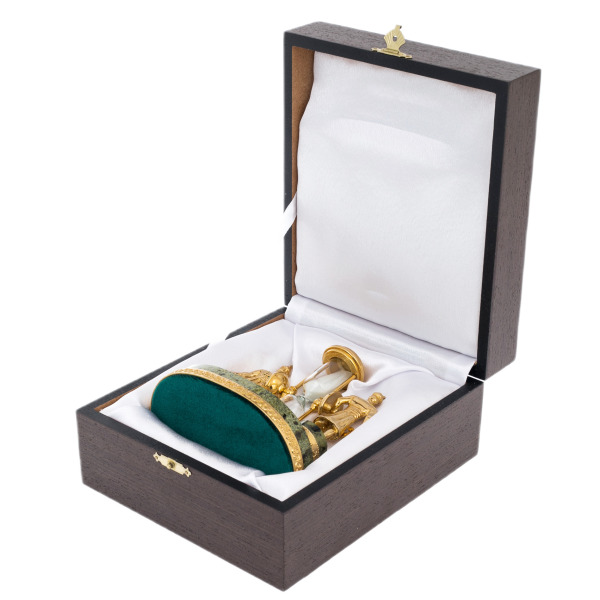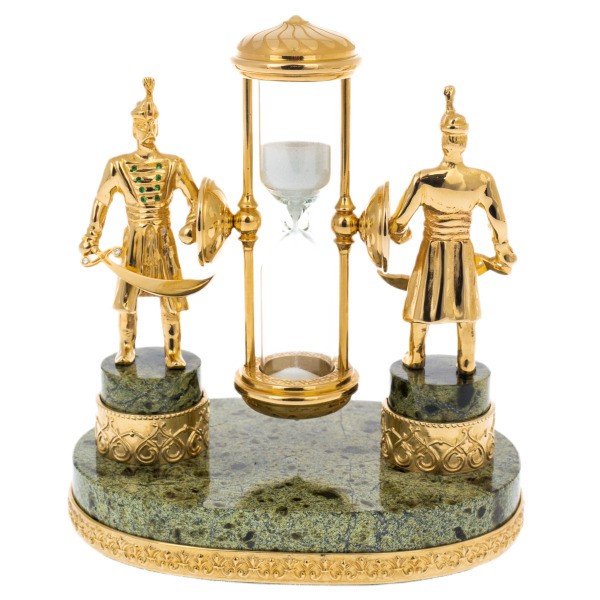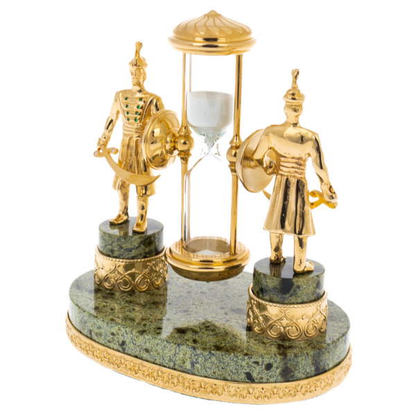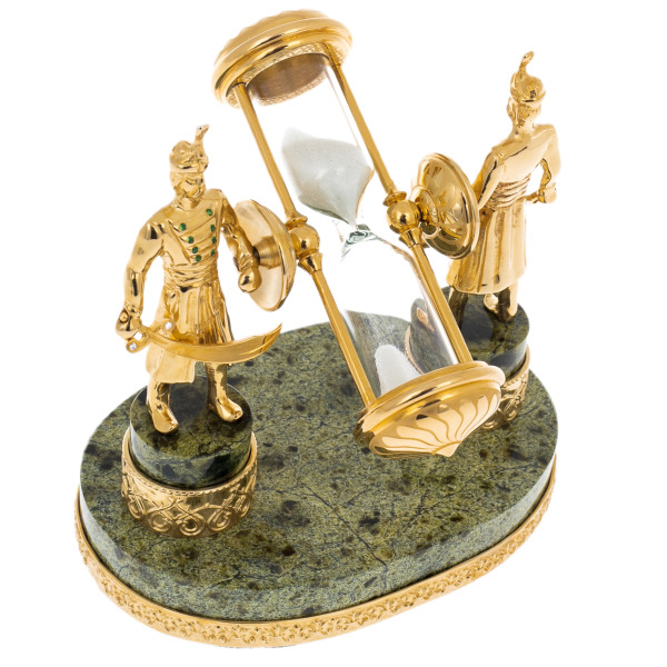 Песочные часы, размещённые на массивной подставке из змеевика, впечатляют не только природной фактурой камня, но и выразительной композицией из двух золочёных фигур воинов. Образ каждого из них передан с подчёркнутой пластикой: чеканные складки одежды, проработанные элементы вооружения, блеск щита и изгиб сабли создают ощущение присутствия древней стражи, оберегающей течение времени. Кристально чистая колба с ровной линией песка заключена в золочёный каркас с плавными архитектурными изгибами, задающими всей композиции гармоничный ритм.