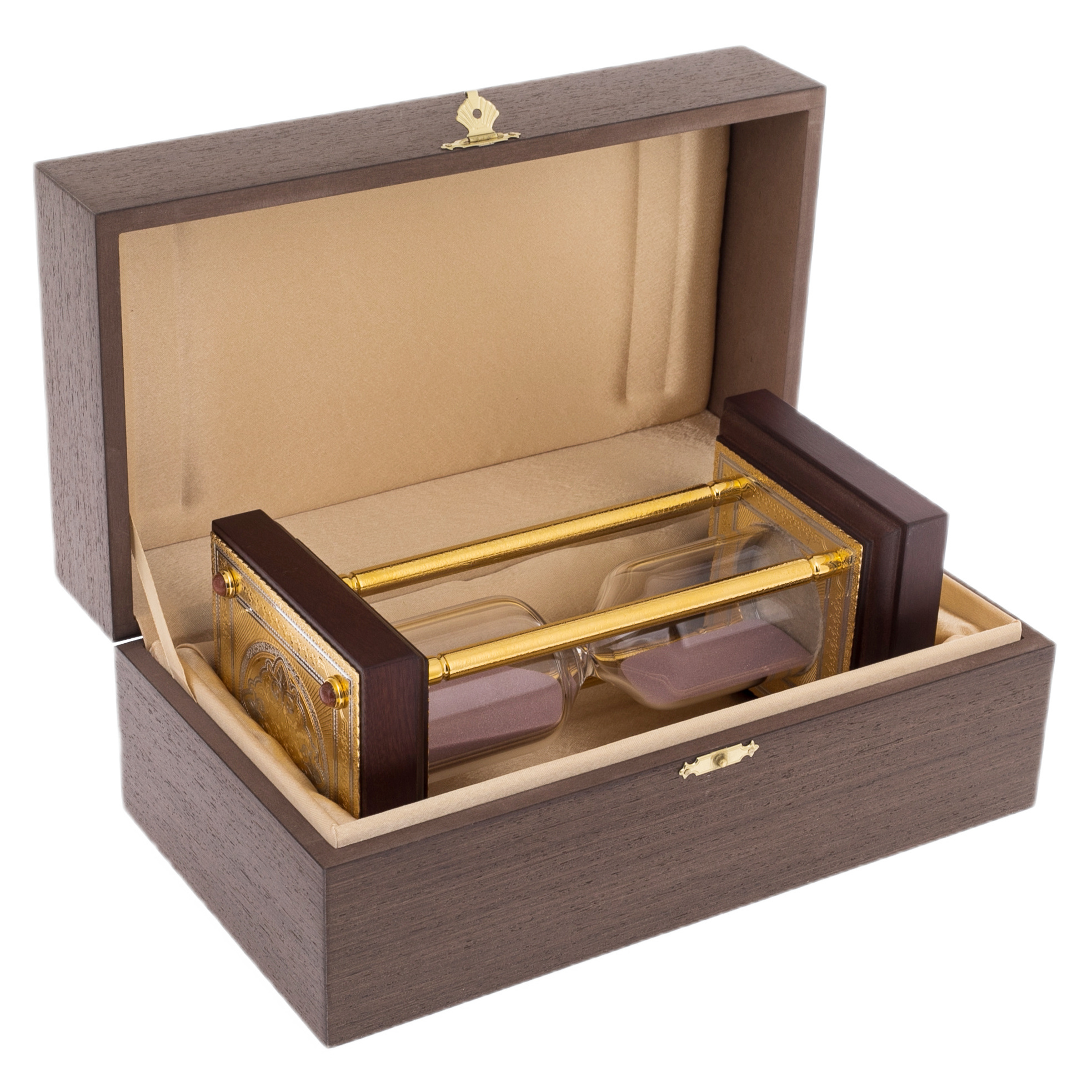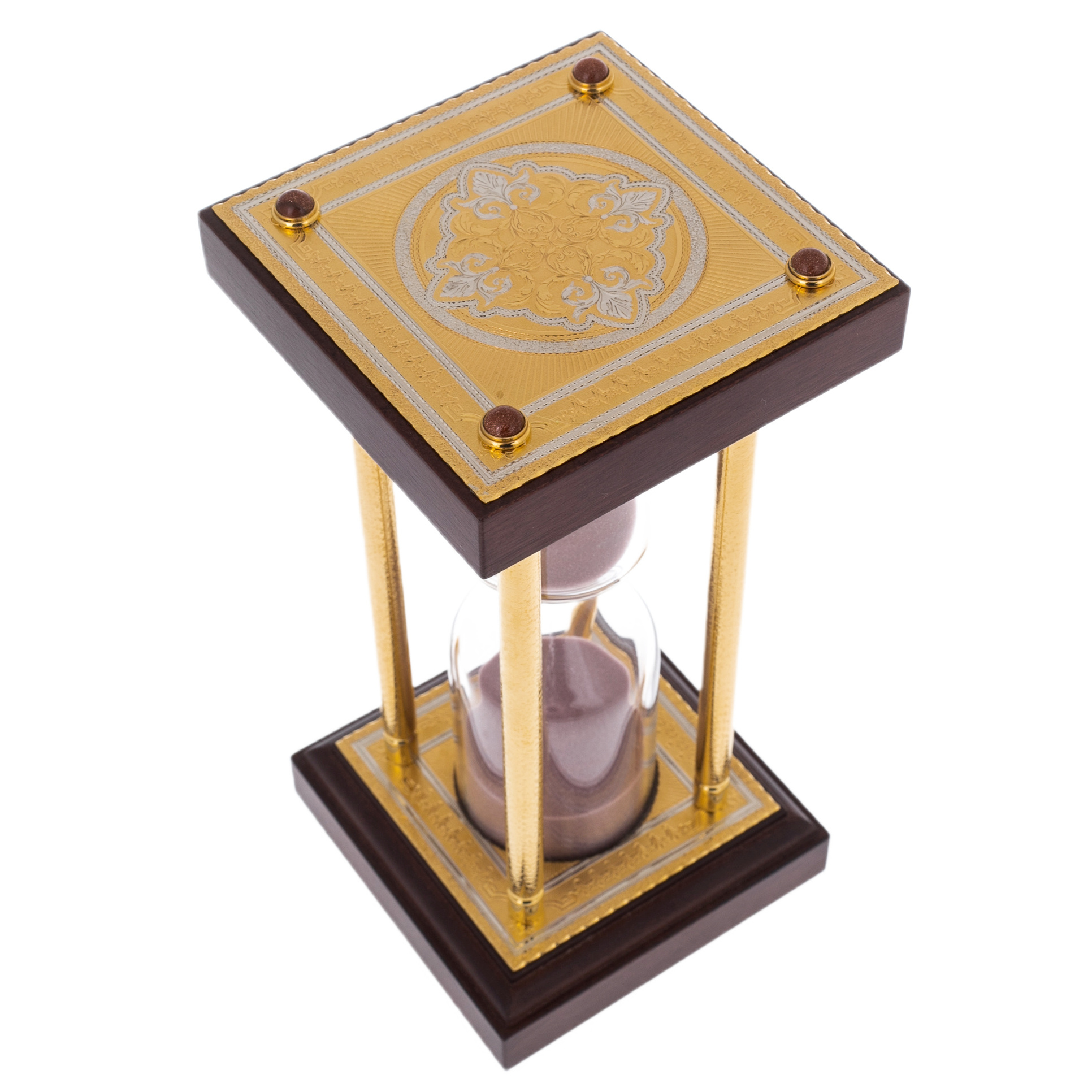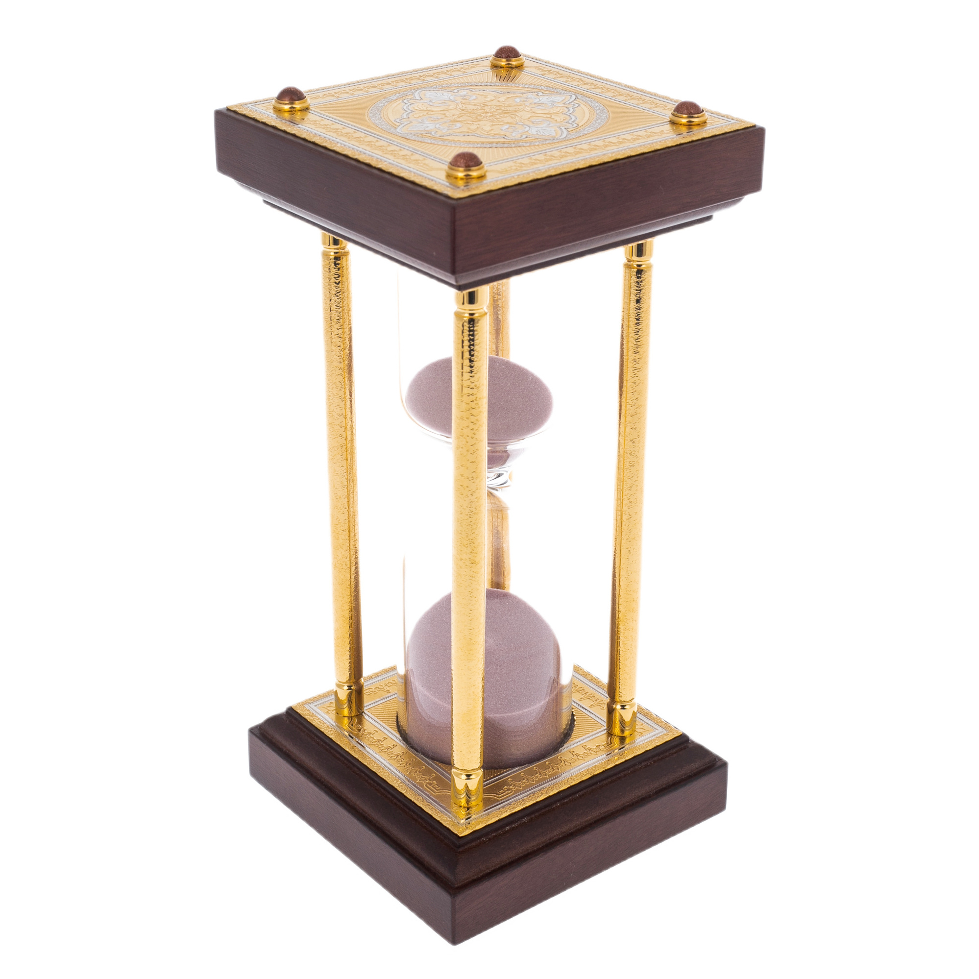 Часы "Время" из мастерских Златоуста — это не просто механизм измерения времени. Это предмет искусства, завораживающий своим великолепием. Основные элементы конструкции выполнены из редких материалов: дерево глубокой текстуры, изящно сочетающееся с золотым покрытием. Рамки верхней и нижней части украшены искусной гравировкой, олицетворяющей тонкость и сложность плетения времени.