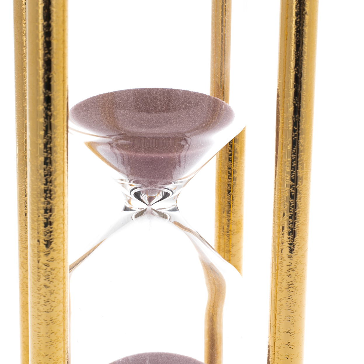 Колба из прозрачного стекла словно заключает в себе волшебство: розоватый песок медленно пересыпается, напоминая о зыбкости мгновений и важности каждого из них. Поддерживающие колонны сияют под лучами света, будто золотые струи, опоясывающие пространственно-временной поток, создавая иллюзию того, что эти часы могут остановить бег времени хотя бы на мгновение.