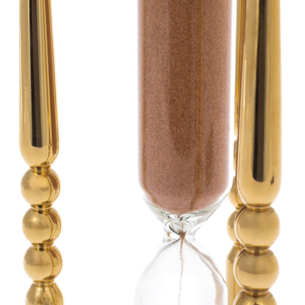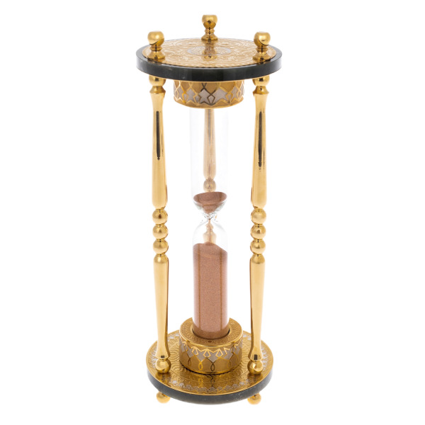 Основание из нефрита, камня императоров, служит фундаментом этому произведению искусства. Его глубокий зеленый оттенок, напоминающий величие первозданной природы, гармонично контрастирует с теплым сиянием золоченой латуни. Прямые колонны, украшающие конструкцию, словно опоры древнего храма, подчеркивают строгость линий и идеальную геометрию. Стеклянный сосуд, наполненный песком цвета пустынного золота, вызывает ощущение невидимой силы, что движет вечностью, — каждое зерно аккуратно отсчитывает мгновения, преисполненные значимости и глубины.