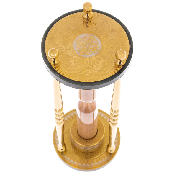 Узорчатые пластины с тонкой гравировкой венчают верхнюю и нижнюю части часов, становясь настоящим полотном для искусства резчиков. В них читается эхо традиций древней России, передаваемых мастерами Златоуста из поколения в поколение. Эти орнаменты, как руны времени, наделяют песочные часы тайным смыслом, понятным лишь избранным.