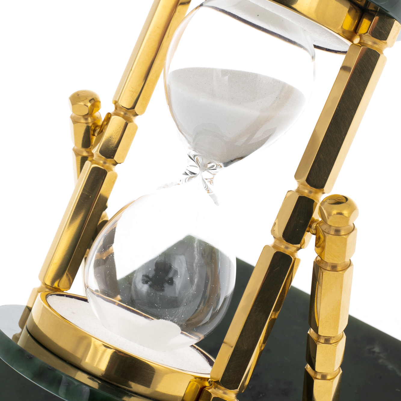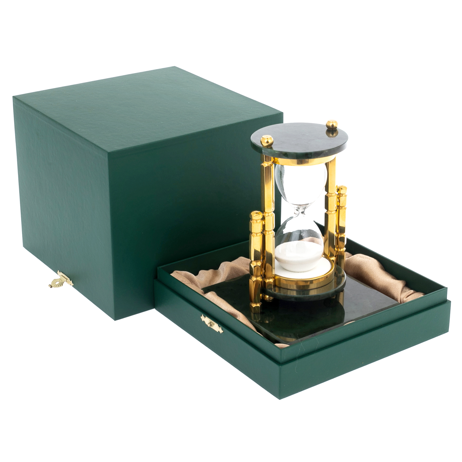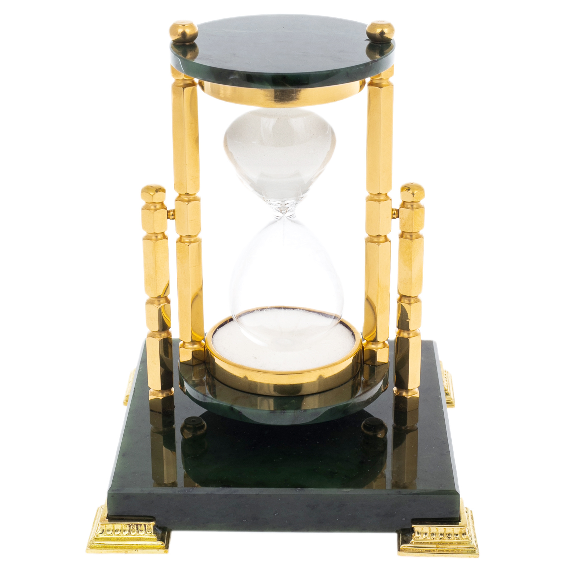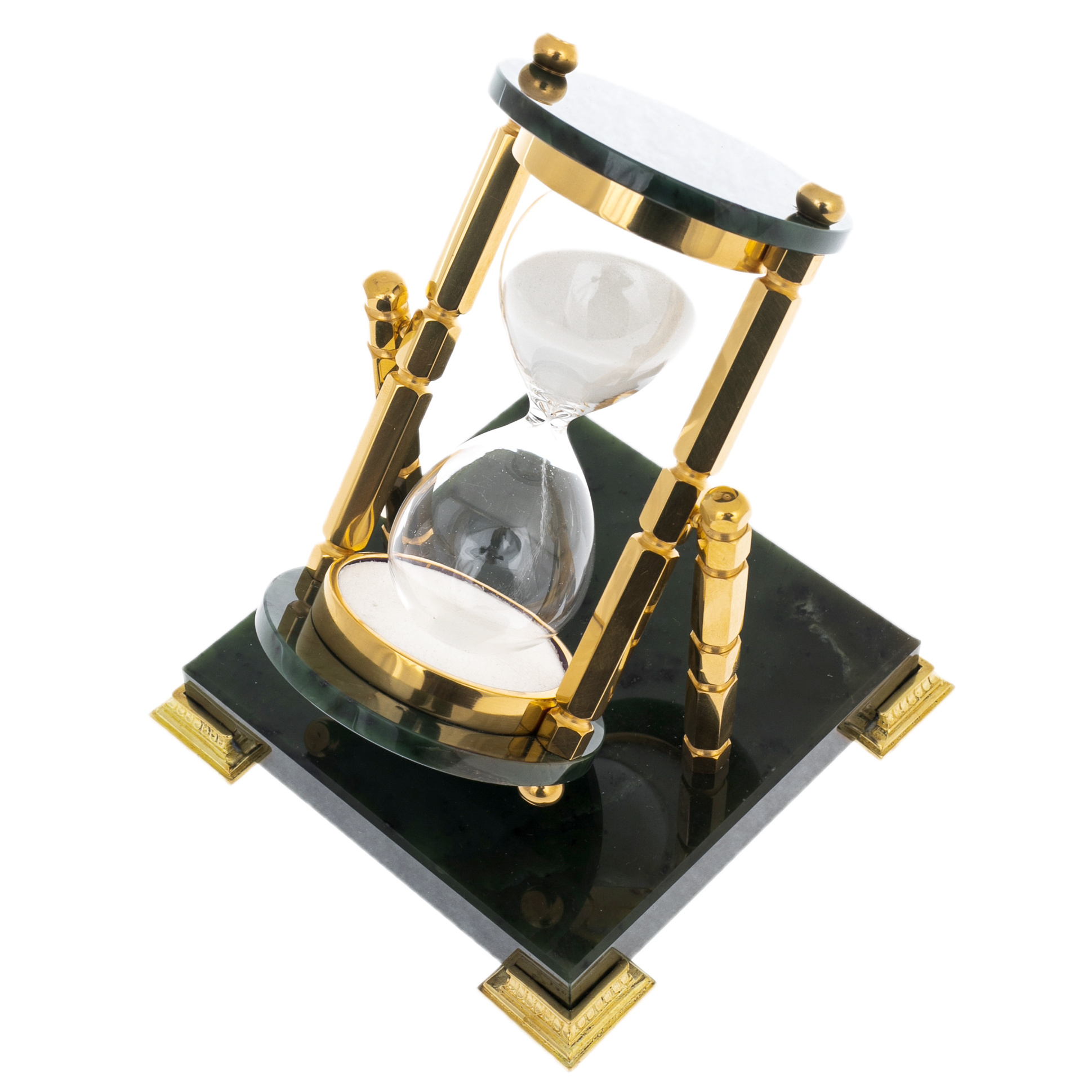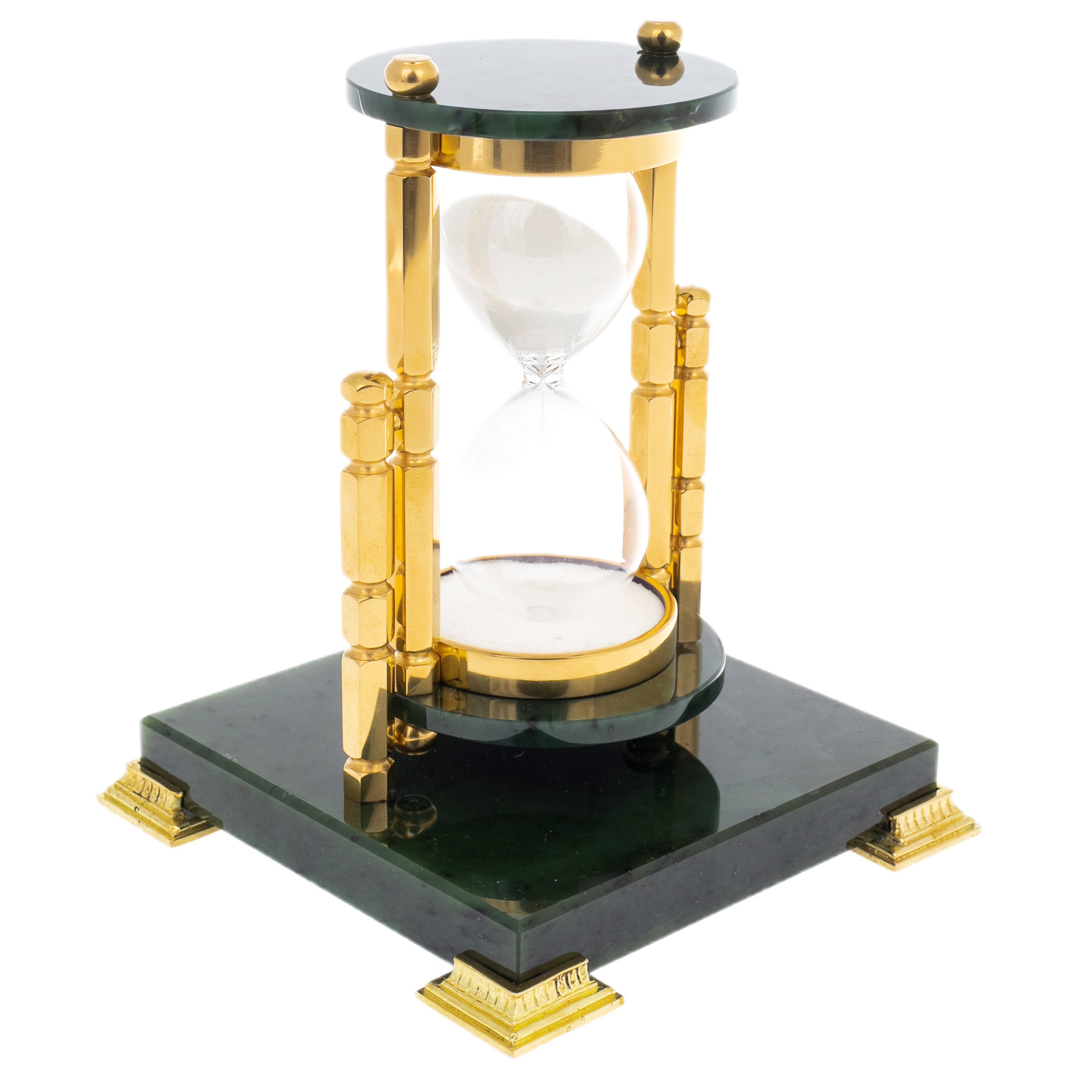 Песочные часы на 30 минут из Златоуста — изысканный настольный аксессуар, объединяющий высокое декоративное искусство и глубокую символику. Их архитектура опирается на строгую геометрию: стеклянная колба с белоснежным песком заключена между четырьмя массивными колоннами, отполированными до зеркального блеска и покрытыми золочением. Основание выполнено из благородного чёрного камня, придающего конструкции вес и устойчивость. Золотые декоративные ножки с витиеватым орнаментом завершают образ предмета, достойного кабинета руководителя или элегантного интерьера переговорной.