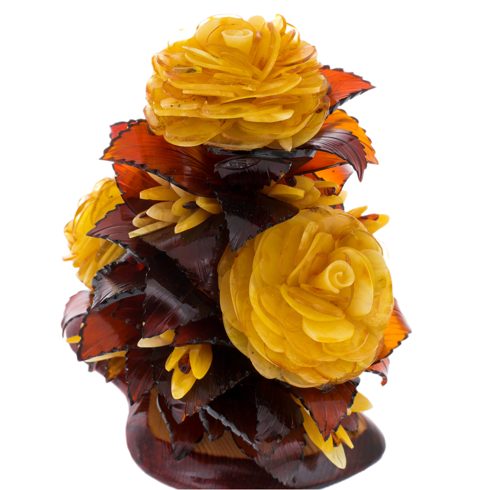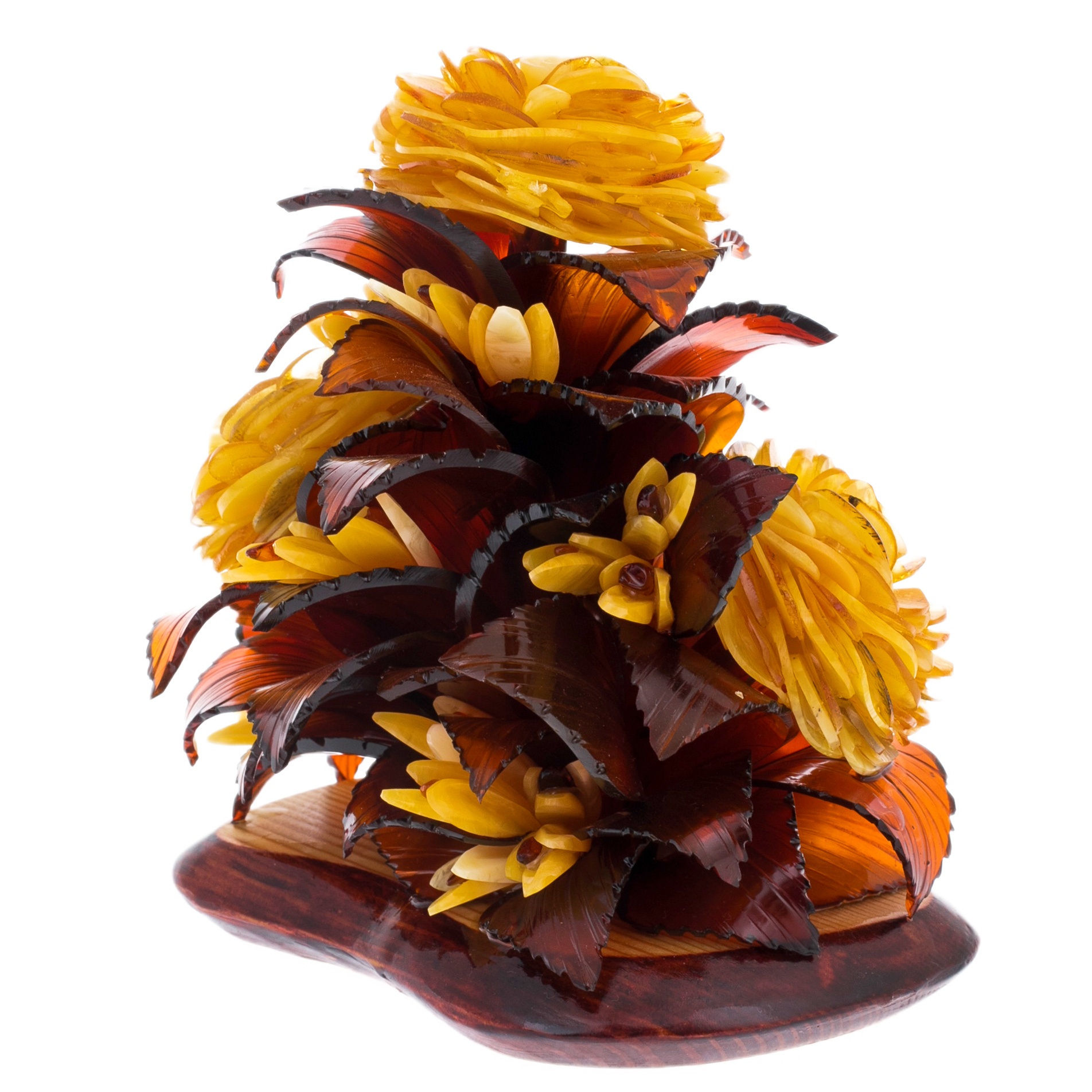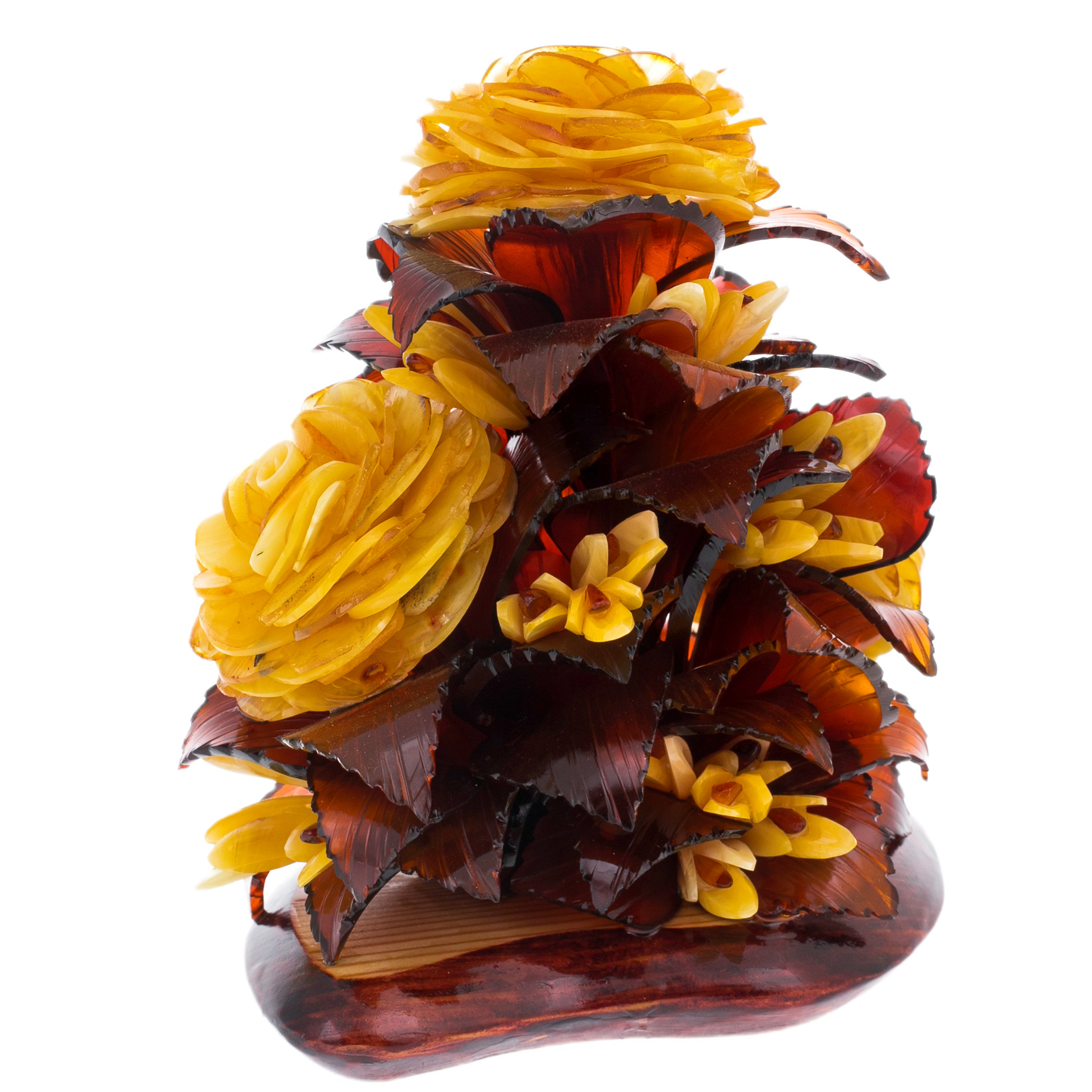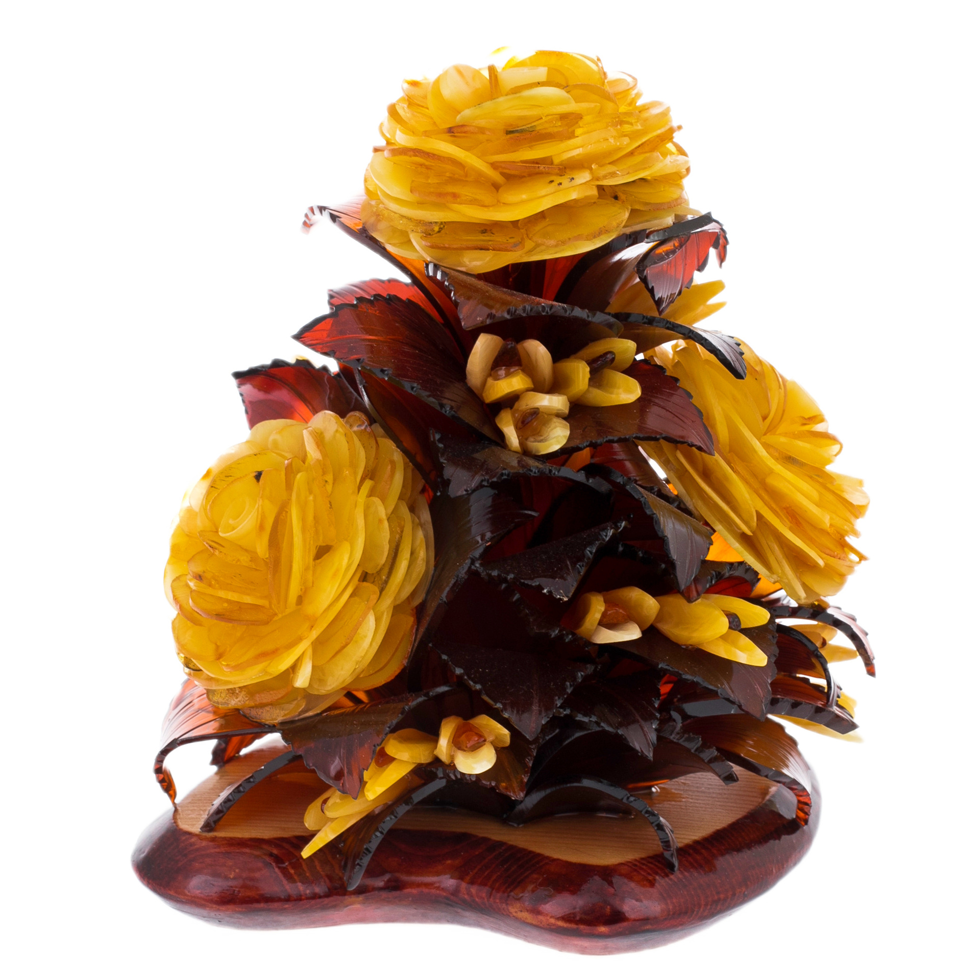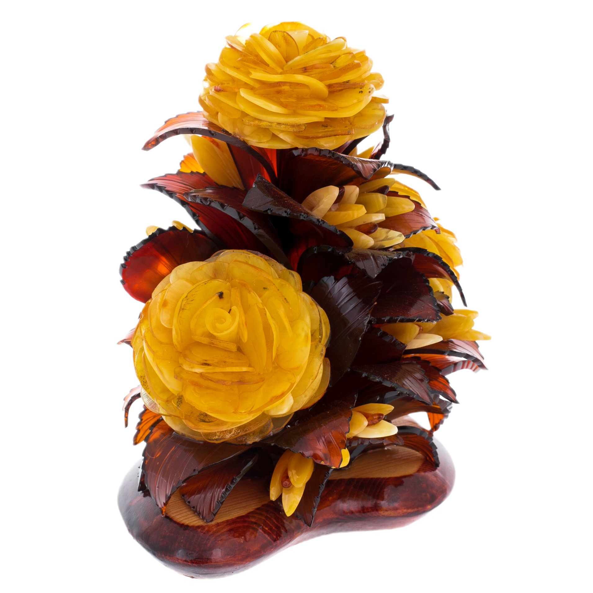 Цветочный букет авторской работы выполнен из натурального янтаря двух контрастных оттенков. Цветочные бутоны — солнечно-медовые, листья — цвета крепкого чая. Композиция покоится на янтарном основании.