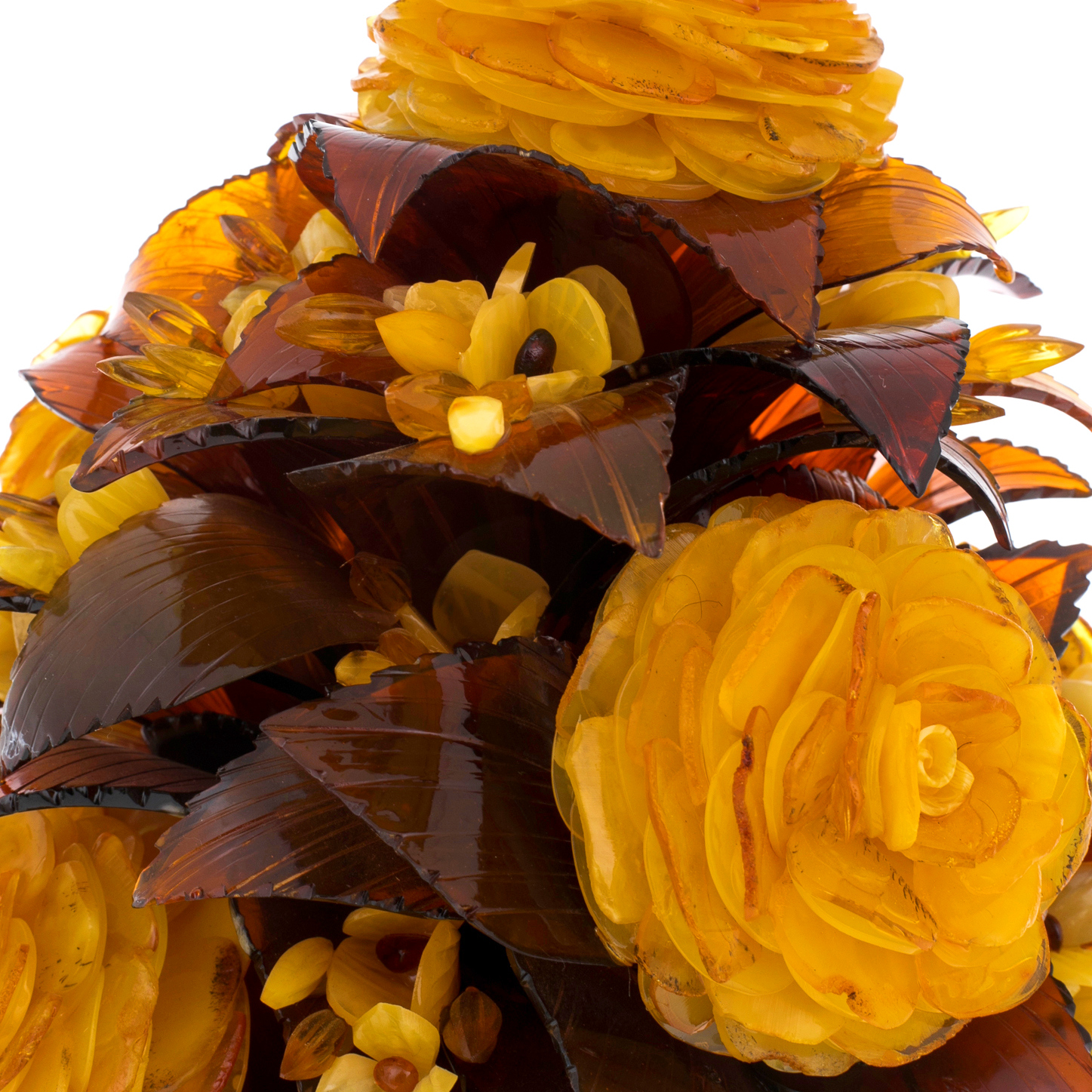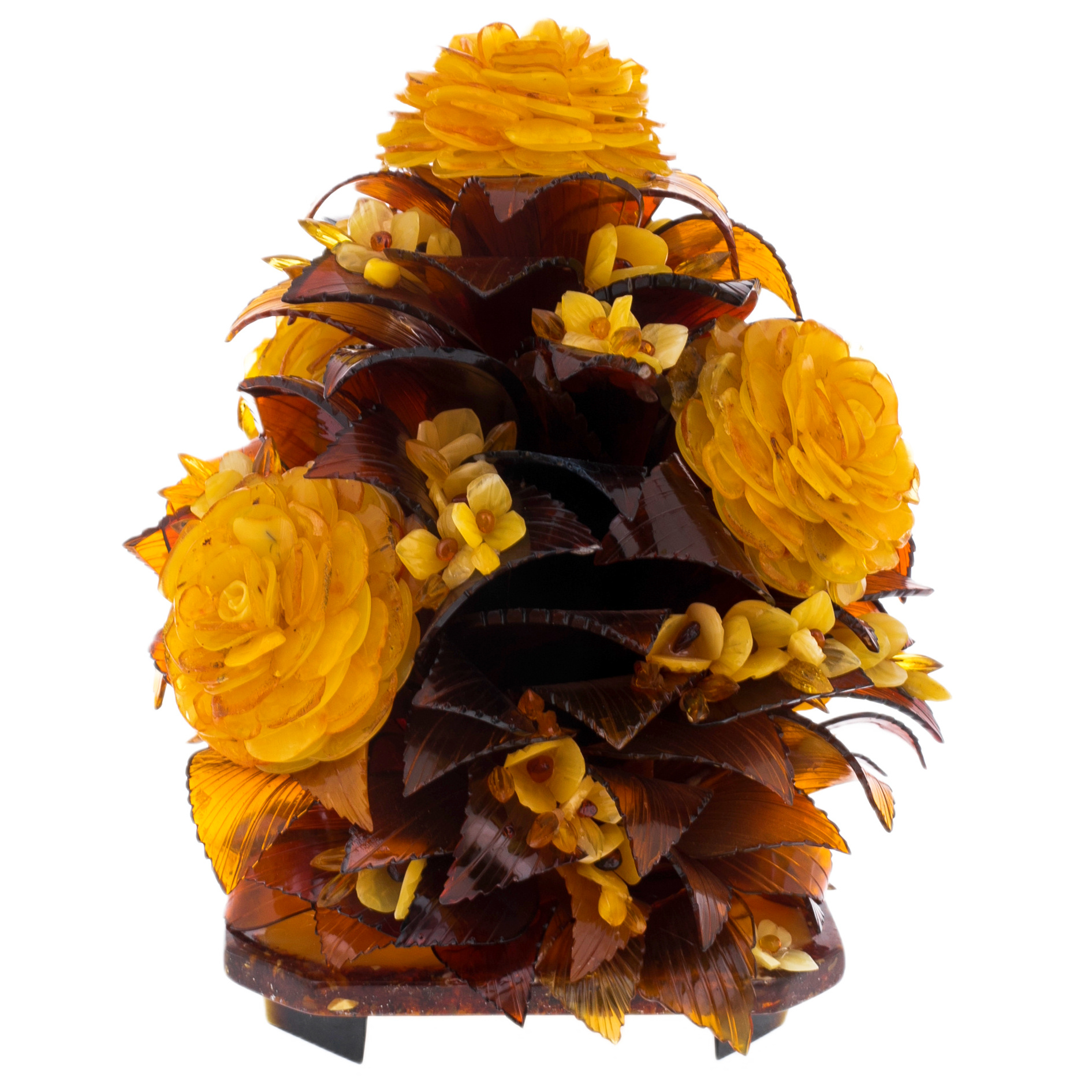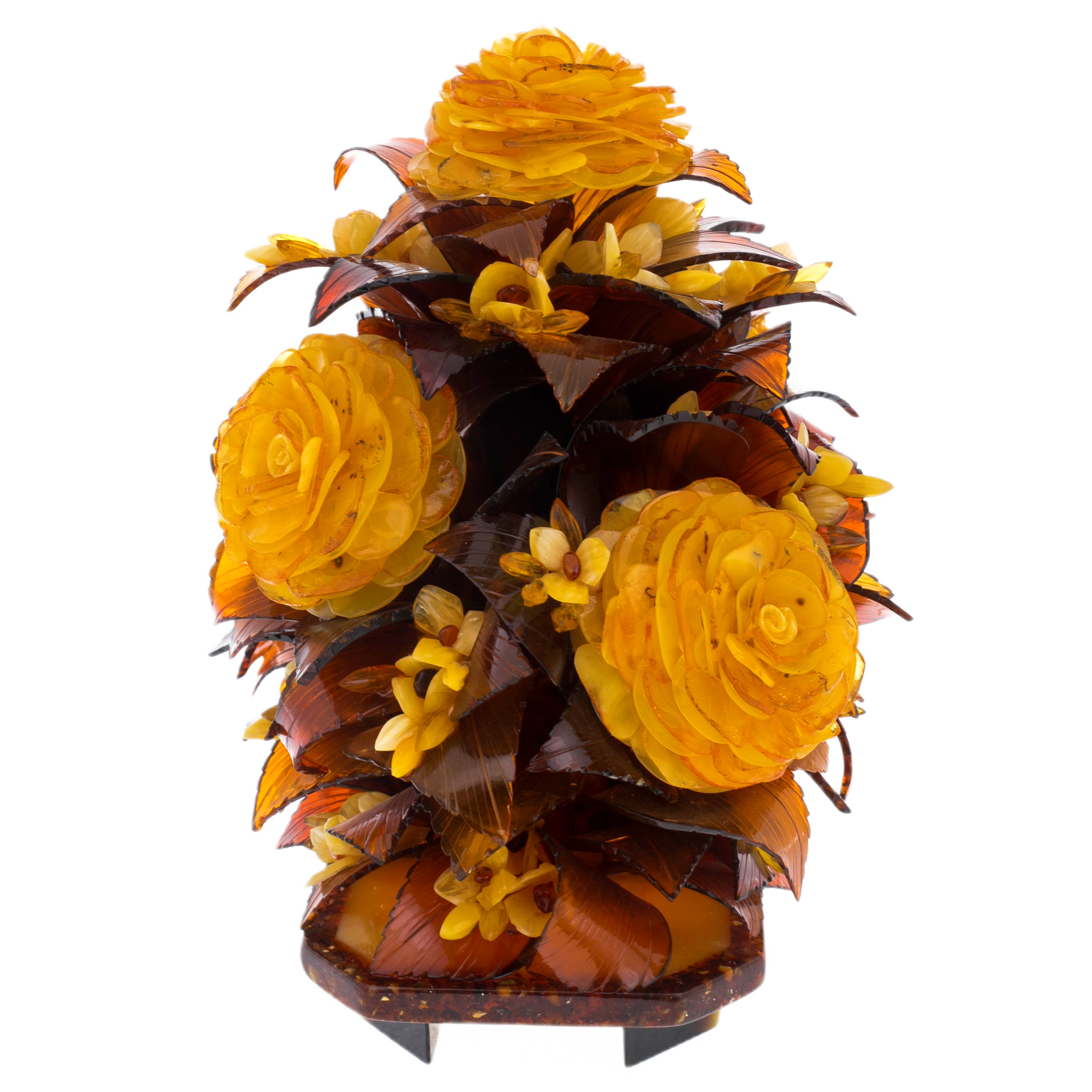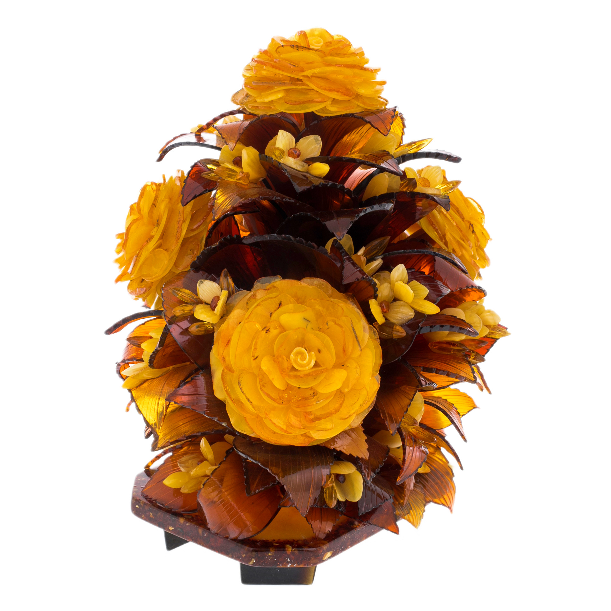 Янтарь, рожденный из древней смолы и несущий в себе миллионы лет истории, высоко ценится не только за природную красоту, но и за энергетические свойства. В культуре Востока и Европы этот минерал ассоциируется с очищением, солнечным светом и внутренней гармонией. Мастера, работавшие с данным материалом, бережно раскрыли его естественные оттенки и прозрачность, добившись скульптурной выразительности каждого лепестка и листа. Легкая асимметрия и множественность тонов придают икебане не только декоративность, но и художественную глубину.
