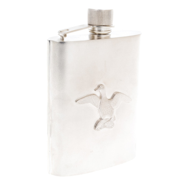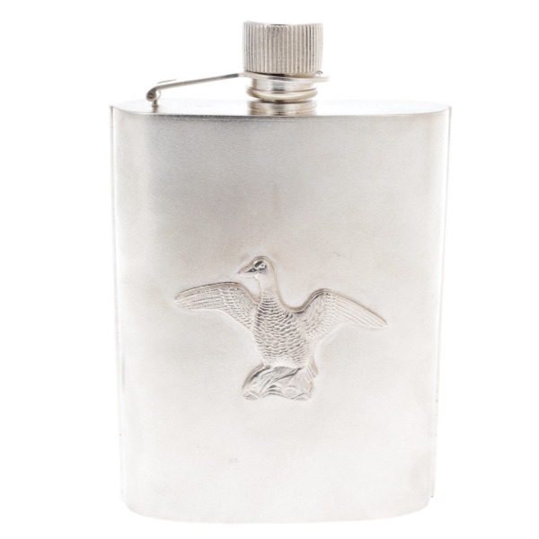 Изящная фляга из серебра — это воплощение строгости и благородства, искусная игра форм и текстур. Гладкий блеск металла манит к себе взгляды, подчеркивая мощь и уверенность, присущие настоящим лидерам. На лицевой стороне — рельефное изображение гуся, символизирующее свободу и мудрость. Его крылья раскрыты, готовые к полету — словно отражение амбиций владельца.