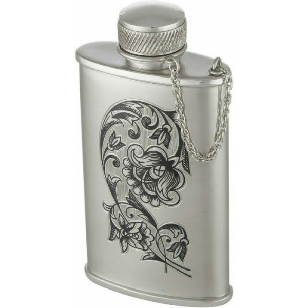 В оформлении фляги применена техника глубокой гравировки с чернением, создающей контраст между холодным светом серебра и тёмной глубиной орнаментальных бордюров. Мелкие декоративные элементы — будто капли или бутоны — выступают на фоне тёмной подложки, формируя ритм, напоминающий ранние образцы мужской ювелирной работы. Внимание к детали, чистота линий, идеальные пропорции — всё в этой фляге говорит о мастерстве и уважении к ремеслу.
