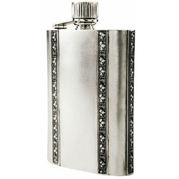 В оформлении фляги применена техника глубокой гравировки с чернением, создающей контраст между холодным светом серебра и тёмной глубиной орнаментальных бордюров. Мелкие декоративные элементы — будто капли или бутоны — выступают на фоне тёмной подложки, формируя ритм, напоминающий ранние образцы мужской ювелирной работы. Внимание к детали, чистота линий, идеальные пропорции — всё в этой фляге говорит о мастерстве и уважении к ремеслу.