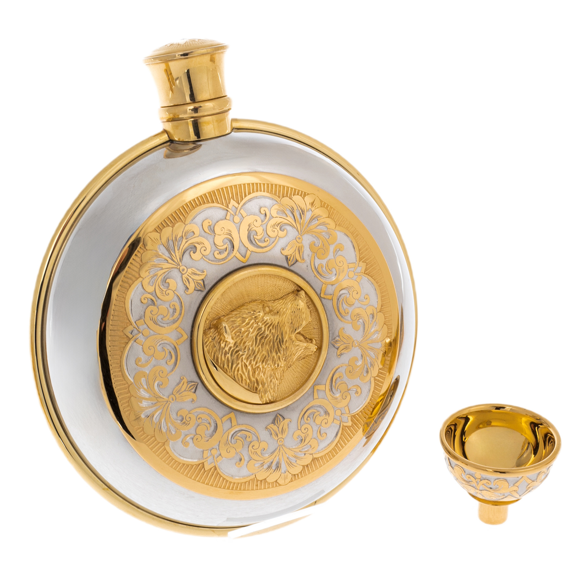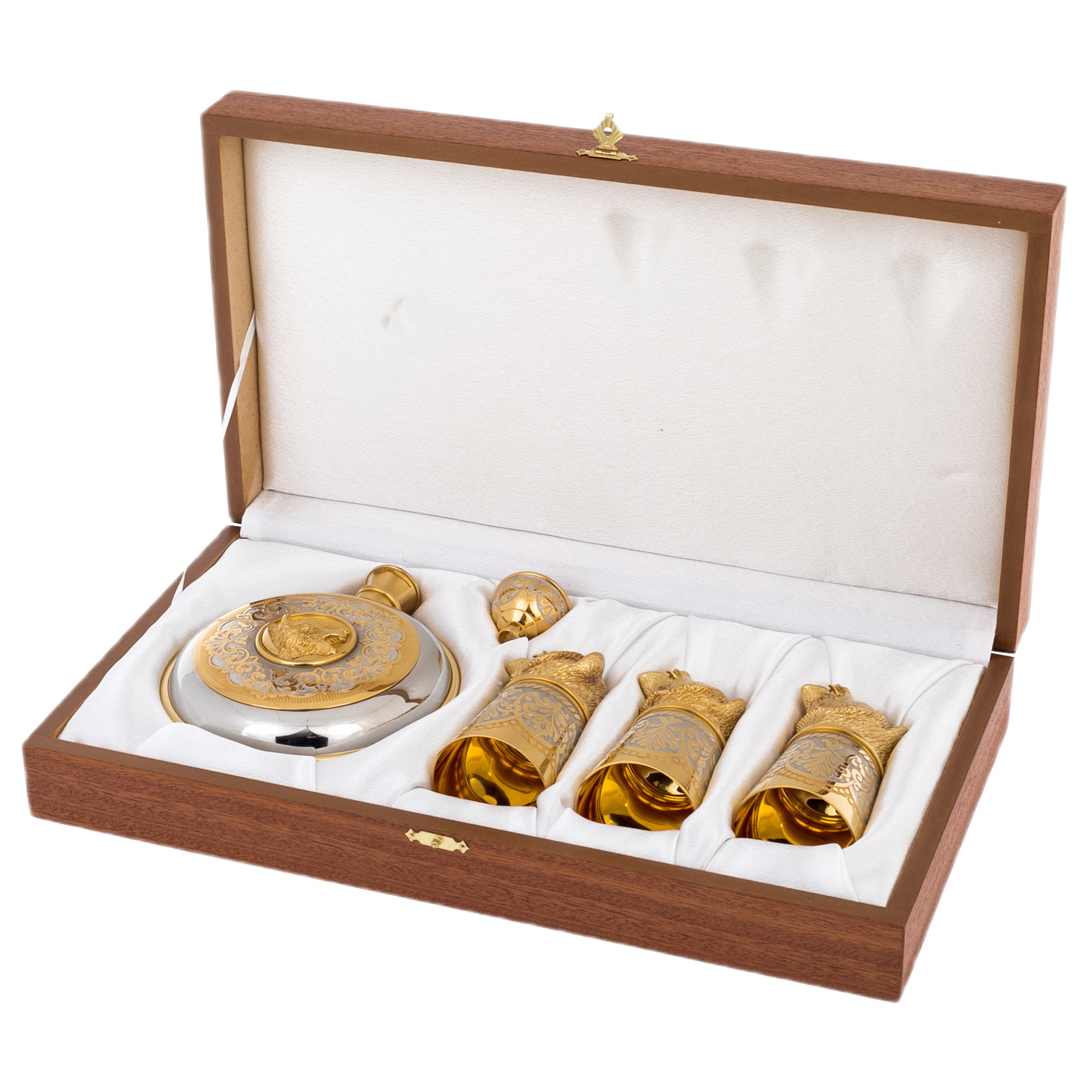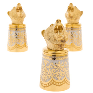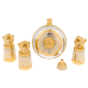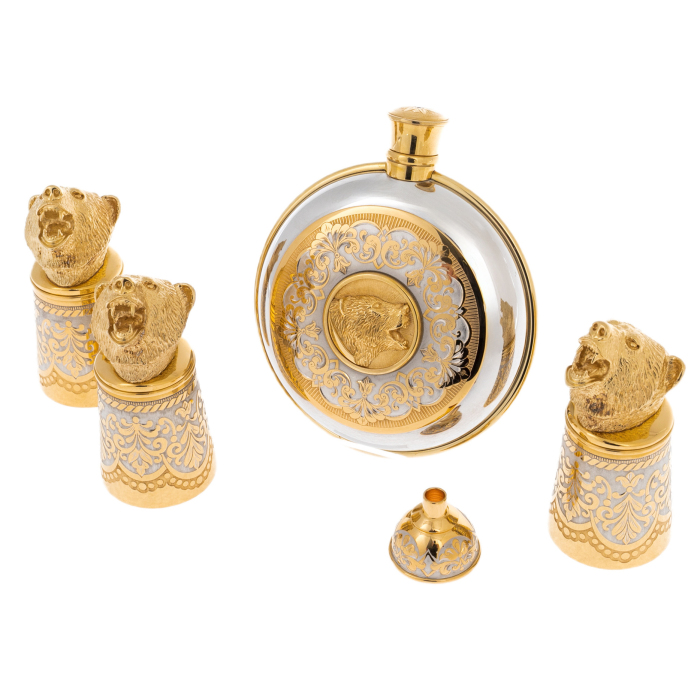 Фляга и рюмки изготовлены из латуни с никелированием и позолотой, украшены сложным гравированным орнаментом с растительными мотивами. Особое внимание привлекают миниатюрные скульптуры медвежьих голов — символа могущества и стойкости. Их выразительные черты переданы с филигранной точностью: будто слышится рёв хозяина тайги, застывшего в бронзовом мгновении.