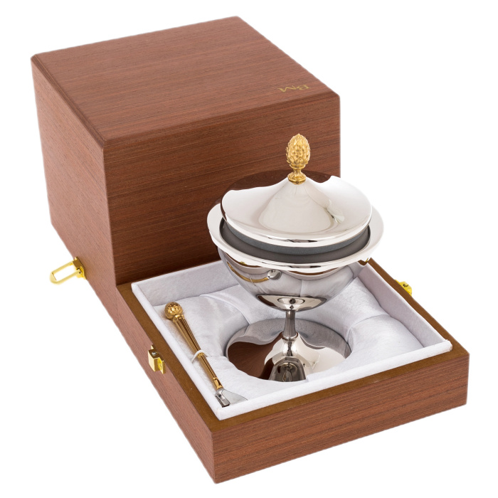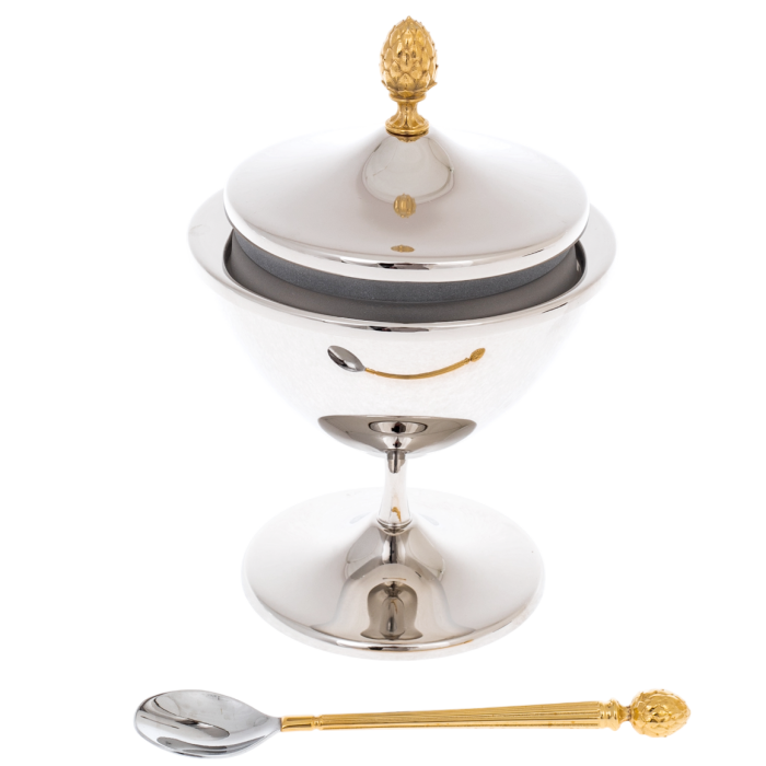 В комплект входит ложечка, выполненная в едином стилевом ключе: сочетание серебристого зеркального черпака с рифлёной ручкой, украшенной миниатюрным золотистым артишоком, создаёт гармонию линий и акцентов. Каждый элемент изделия тщательно отполирован, благодаря чему металл отражает свет мягкими, рассеянными бликами. Конструкция икорницы продумана так, чтобы она легко разбиралась, обеспечивая удобство в использовании и уходе, а материалы, выбранные для неё, подчёркивают высокий статус предмета.