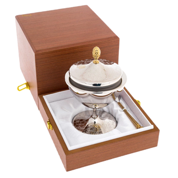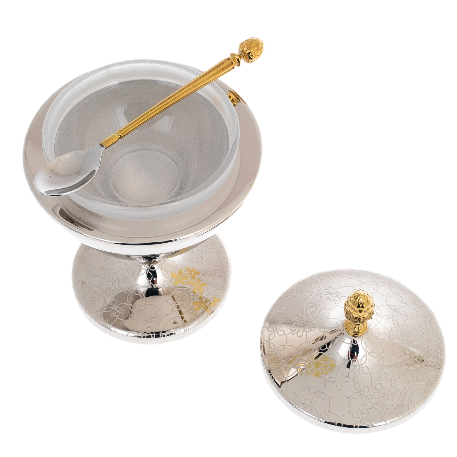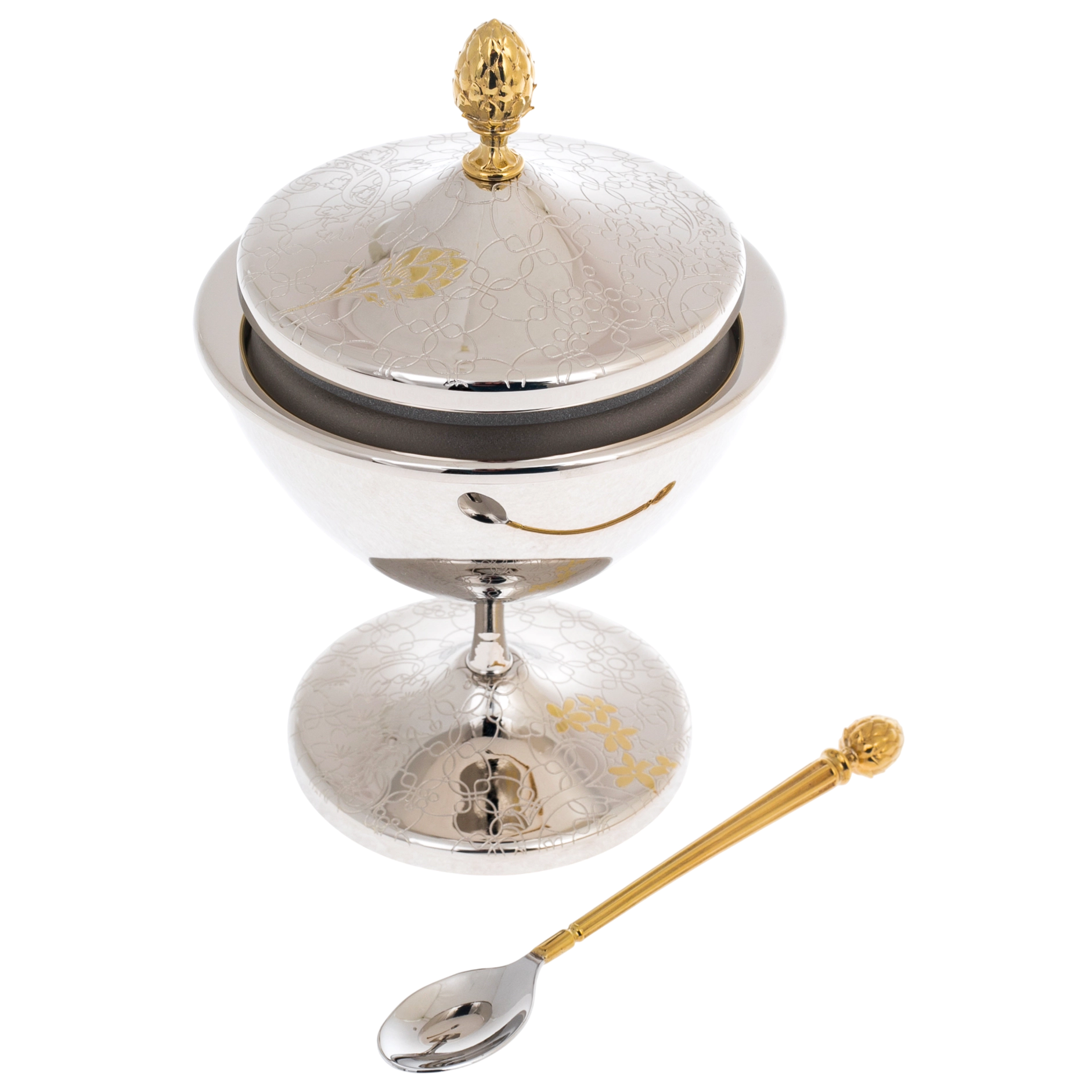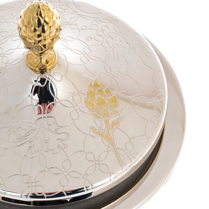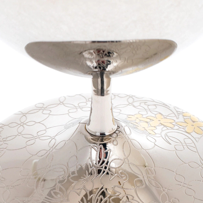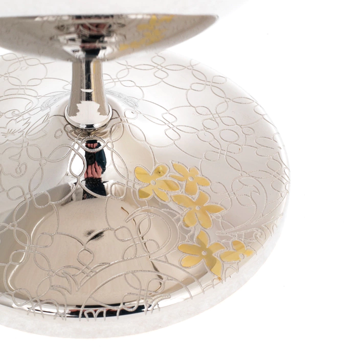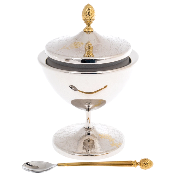 Икорница «Артишок» — изящное изделие златоустовских мастеров, предназначенное для подачи деликатесов в формате, где эстетика не уступает содержанию. Композиция включает чашу на устойчивой ножке, крышку с декоративной навершием и ложку, выполненные в едином художественном ключе. Поверхность украшена тонким орнаментом с растительными мотивами, в которых угадываются очертания артишока — символа утончённости и изысканного вкуса. Золотые акценты мягко выделяют элементы декора, создавая благородный контраст с зеркальным серебристым фоном.